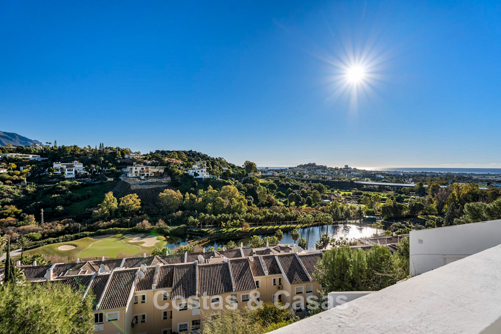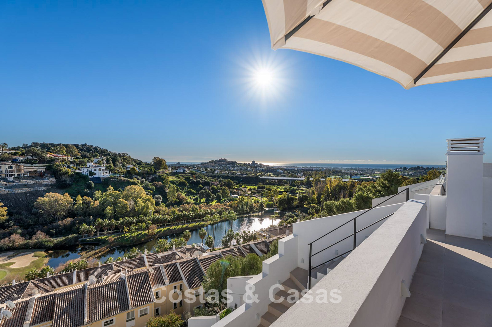 Panoramic views over the sea, golf courses and mountains.