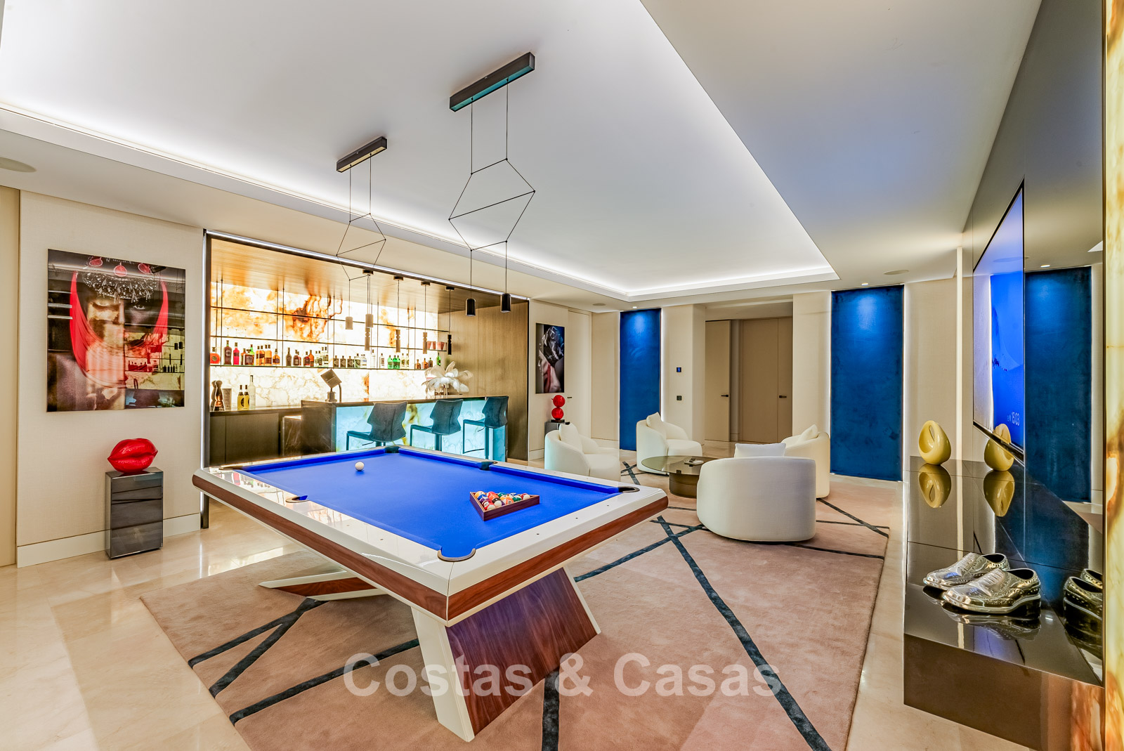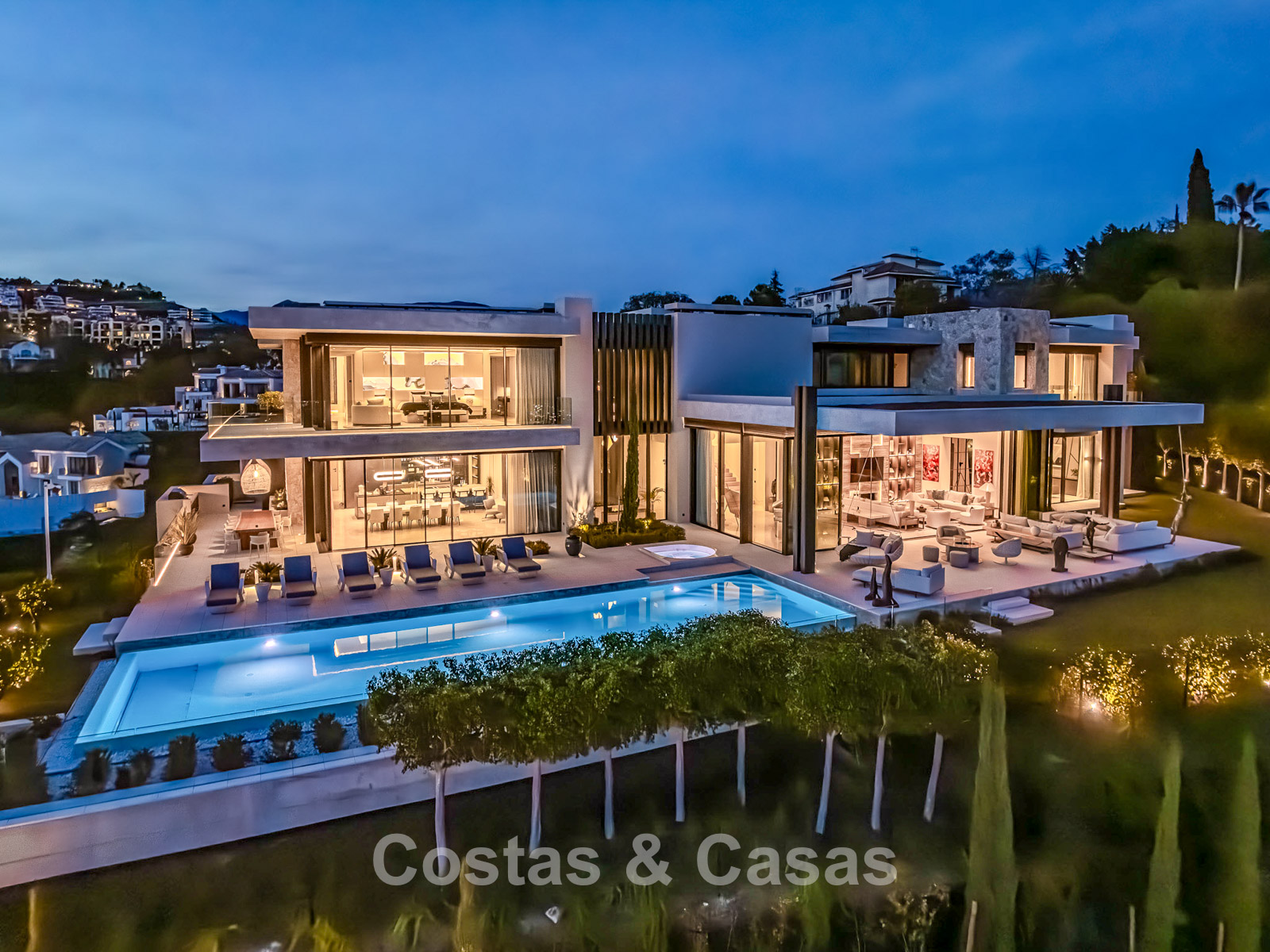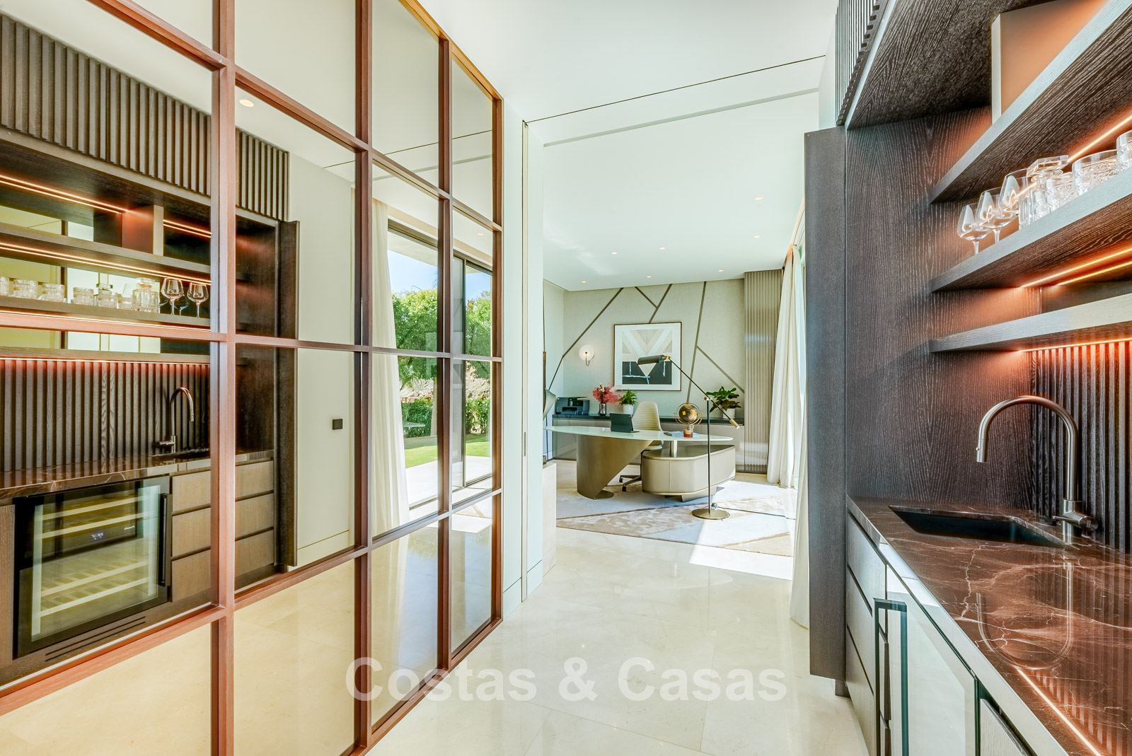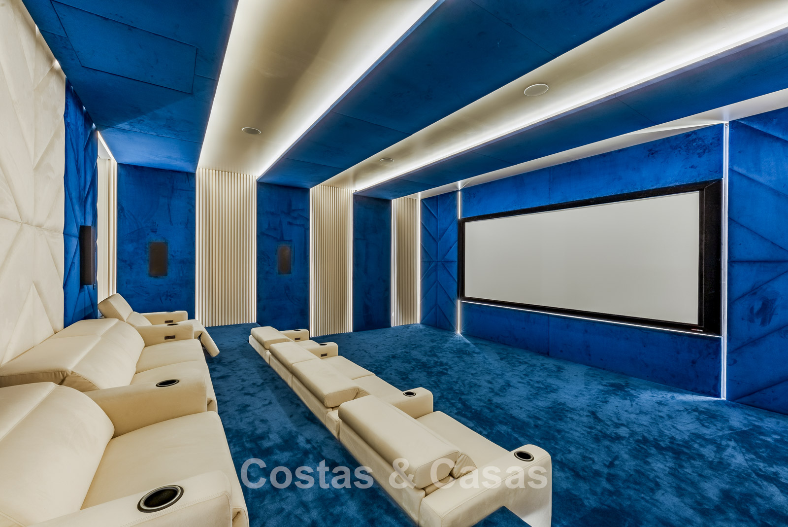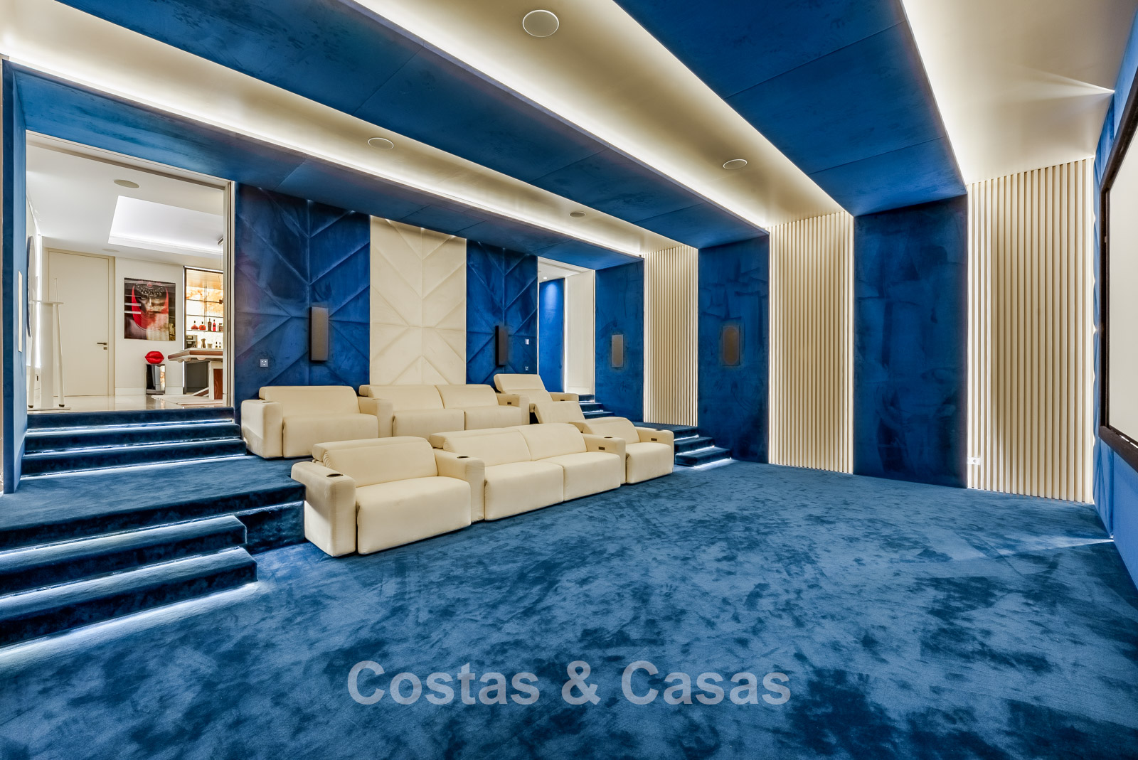Exceptional, detached villa with ultra-modern architecture. The architecture combines minimalism with warmth: white facades, natural stone, wood accents, and lush gardens create an atmosphere of timeless elegance. Designed with an eye for refined design and sustainability. Super-high ceilings. Floor-to-ceiling sliding windows with recessed profiles throughout the villa create a seamless transition between indoors and outdoors, letting in abundant natural light. The airy, open-plan living area connects directly to the outdoor space, creating a feeling of space and light. High-quality, custom-designed open-plan kitchen with a large central island, breakfast bar, and dining table. Eight custom-designed bedrooms, eight bathrooms, and four separate toilets. The master suite features a spacious walk-in closet and a spa-inspired bathroom. An indoor spa includes a heated indoor pool, sauna, Turkish steam bath, and separate shower, ideal for ultimate relaxation year-round. Formal office space. Private loft-style home cinema. Air-conditioned wine cellar. Fully equipped gym with adjoining massage room. Storage room. Equipped laundry room. Utility room. Parking for 6 cars.