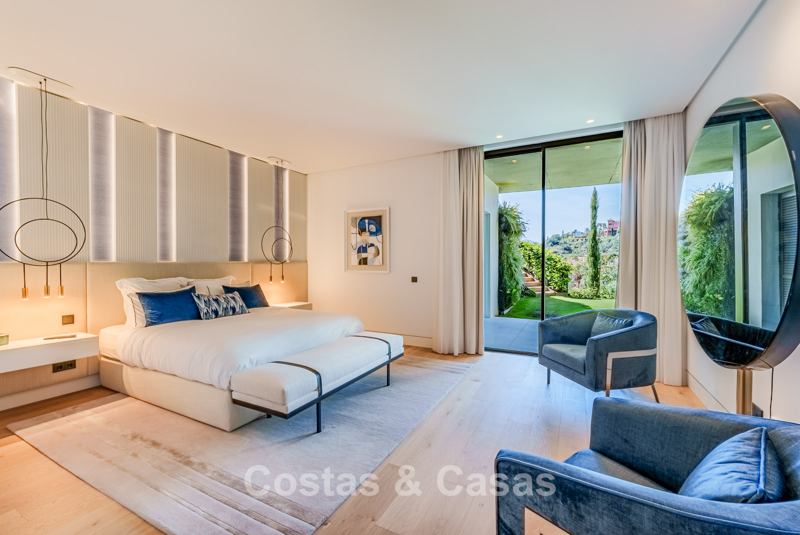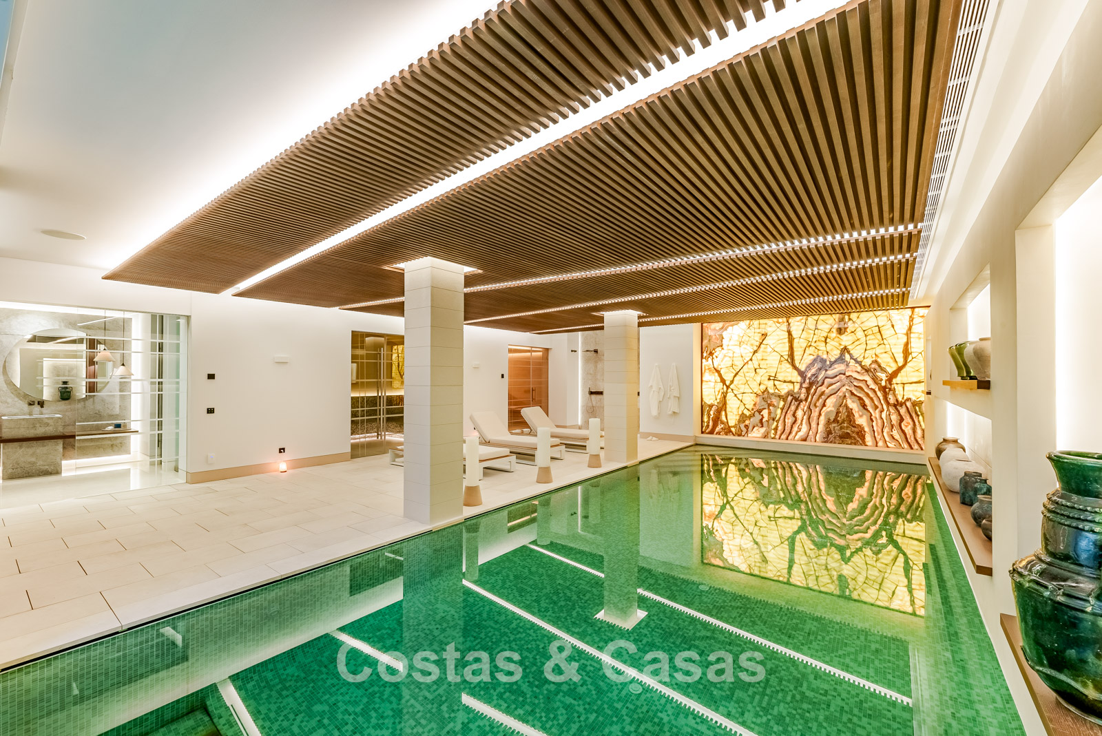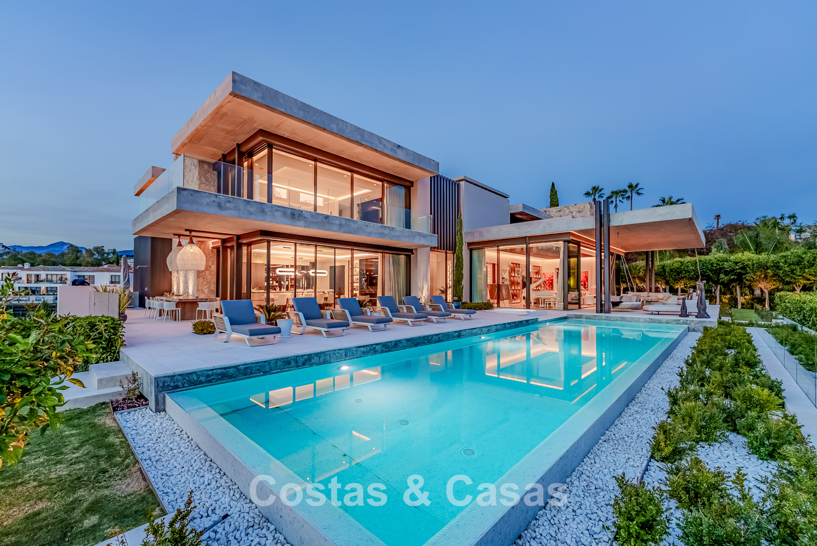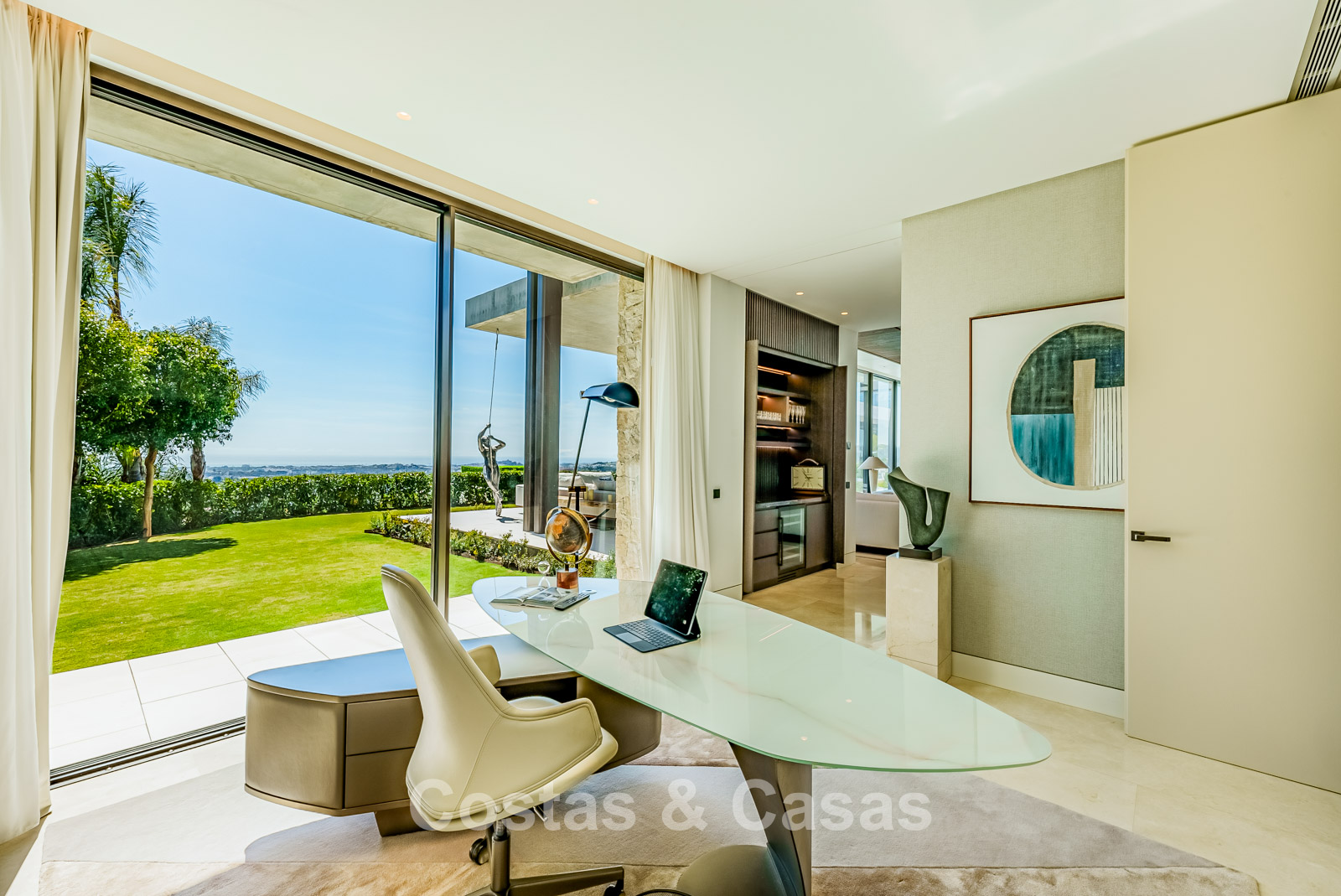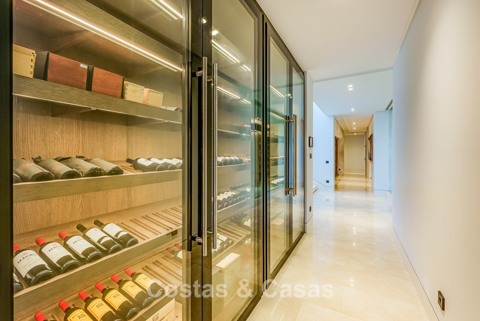 Exceptional, detached villa with ultra-modern architecture. The architecture combines minimalism with warmth: white facades, natural stone, wood accents, and lush gardens create an atmosphere of timeless elegance. Designed with an eye for refined design and sustainability. Super-high ceilings. Floor-to-ceiling sliding windows with recessed profiles throughout the villa create a seamless transition between indoors and outdoors, letting in abundant natural light. The airy, open-plan living area connects directly to the outdoor space, creating a feeling of space and light. High-quality, custom-designed open-plan kitchen with a large central island, breakfast bar, and dining table. Eight custom-designed bedrooms, eight bathrooms, and four separate toilets. The master suite features a spacious walk-in closet and a spa-inspired bathroom. An indoor spa includes a heated indoor pool, sauna, Turkish steam bath, and separate shower, ideal for ultimate relaxation year-round. Formal office space. Private loft-style home cinema. Air-conditioned wine cellar. Fully equipped gym with adjoining massage room. Storage room. Equipped laundry room. Utility room. Parking for 6 cars.