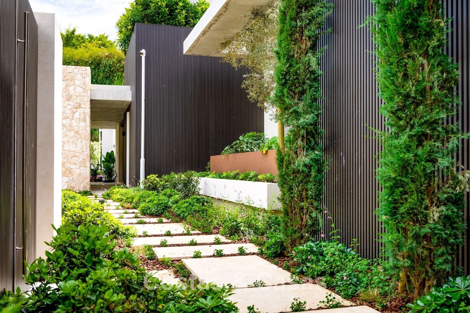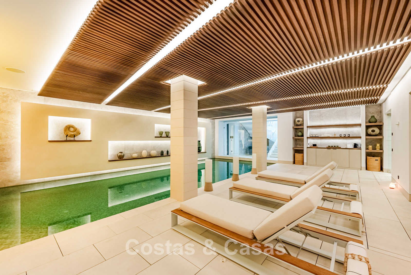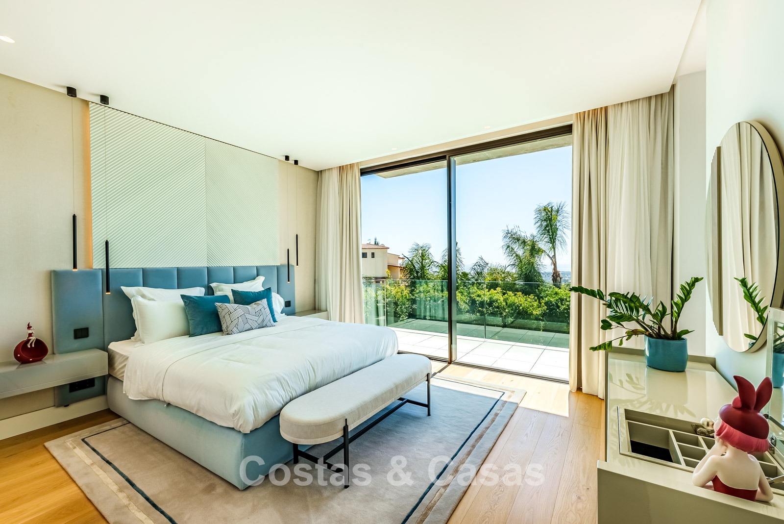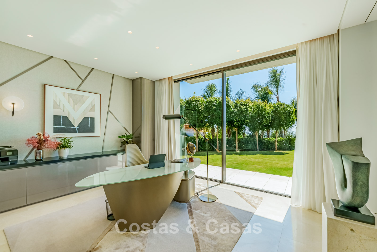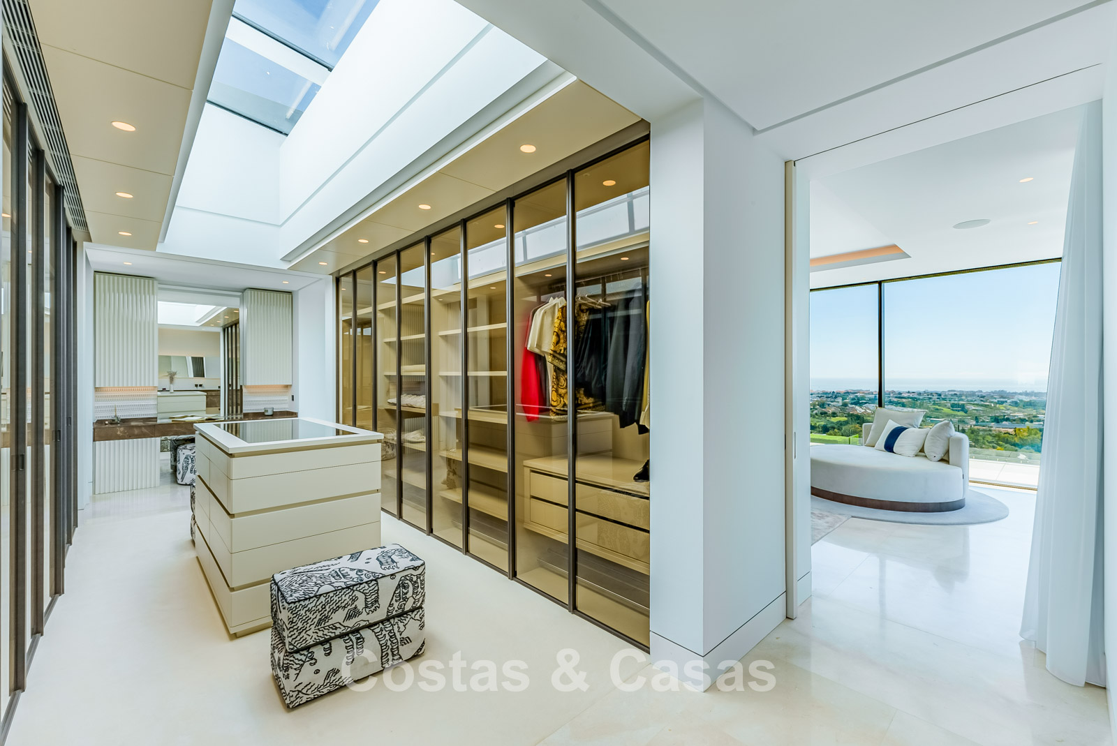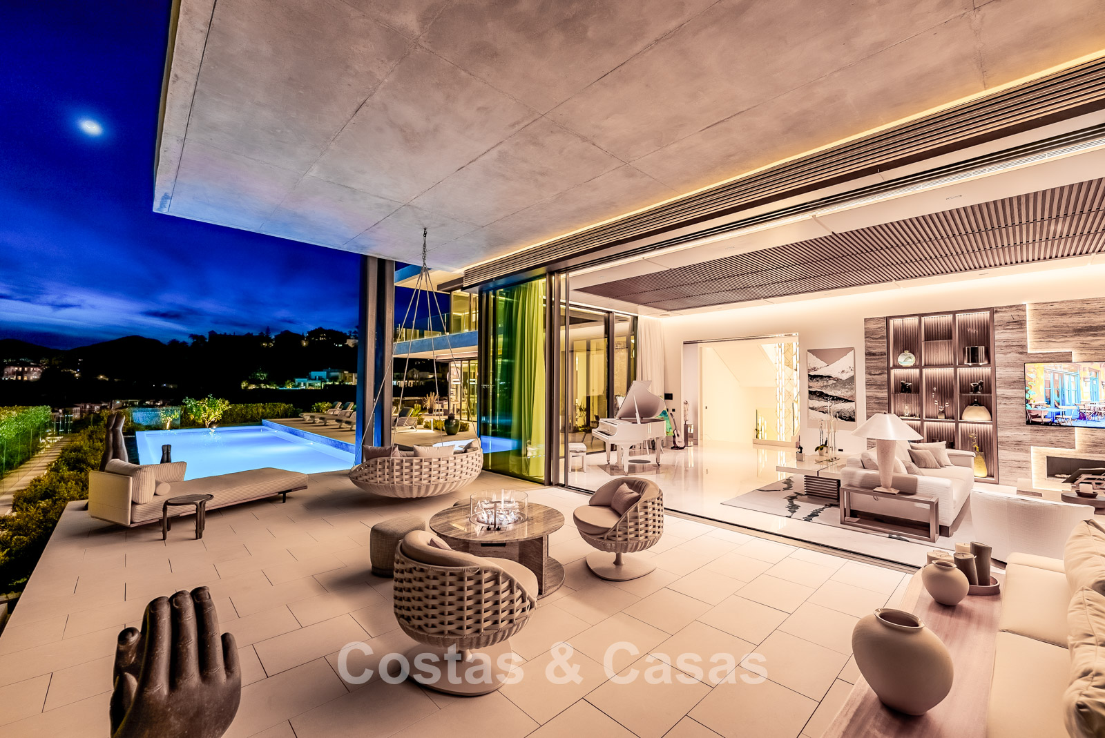 Exceptional, detached villa with ultra-modern architecture. The architecture combines minimalism with warmth: white facades, natural stone, wood accents, and lush gardens create an atmosphere of timeless elegance. Designed with an eye for refined design and sustainability. Super-high ceilings. Floor-to-ceiling sliding windows with recessed profiles throughout the villa create a seamless transition between indoors and outdoors, letting in abundant natural light. The airy, open-plan living area connects directly to the outdoor space, creating a feeling of space and light. High-quality, custom-designed open-plan kitchen with a large central island, breakfast bar, and dining table. Eight custom-designed bedrooms, eight bathrooms, and four separate toilets. The master suite features a spacious walk-in closet and a spa-inspired bathroom. An indoor spa includes a heated indoor pool, sauna, Turkish steam bath, and separate shower, ideal for ultimate relaxation year-round. Formal office space. Private loft-style home cinema. Air-conditioned wine cellar. Fully equipped gym with adjoining massage room. Storage room. Equipped laundry room. Utility room. Parking for 6 cars.
