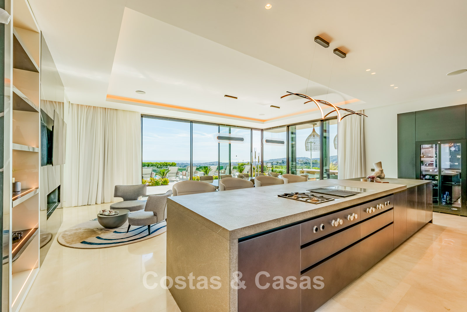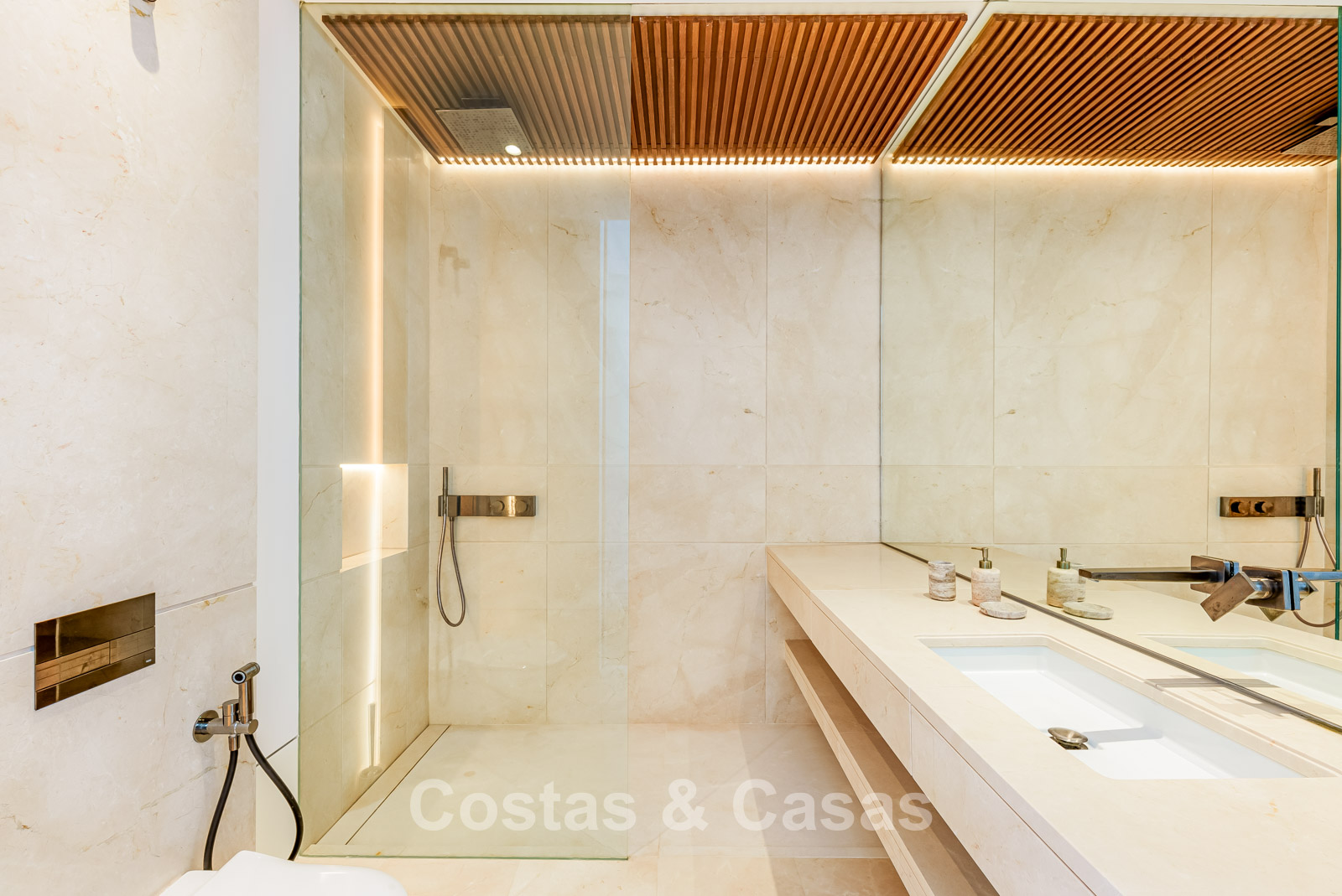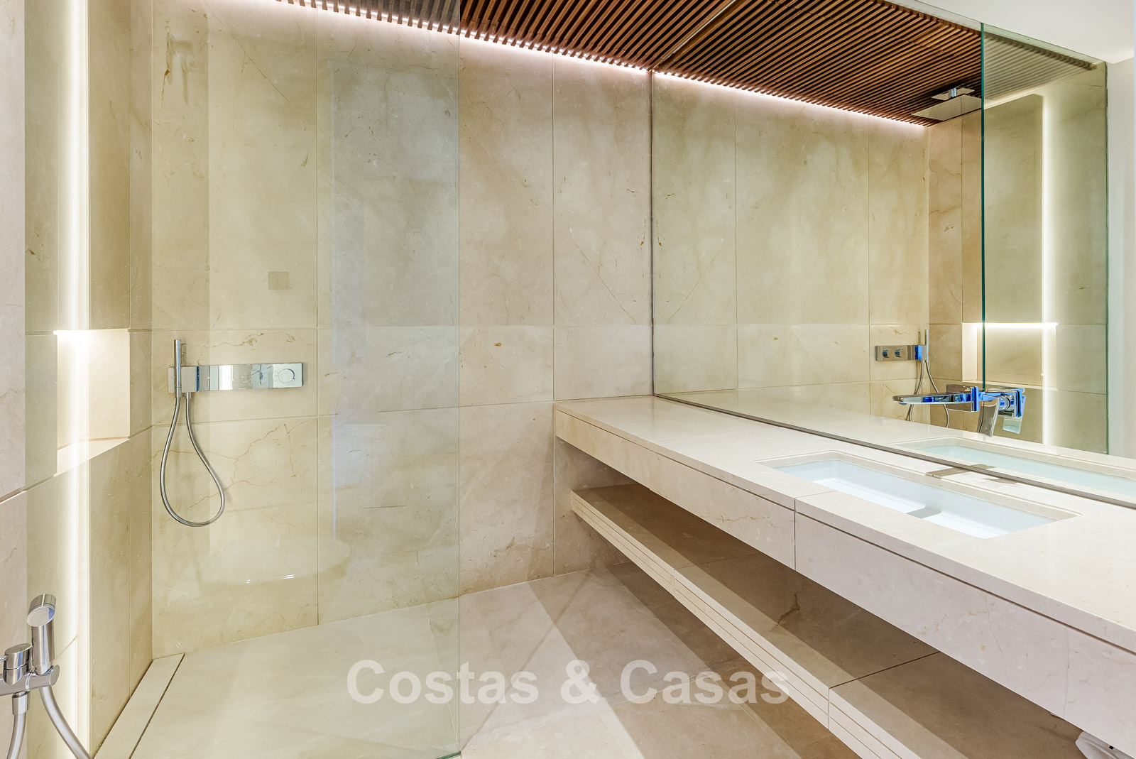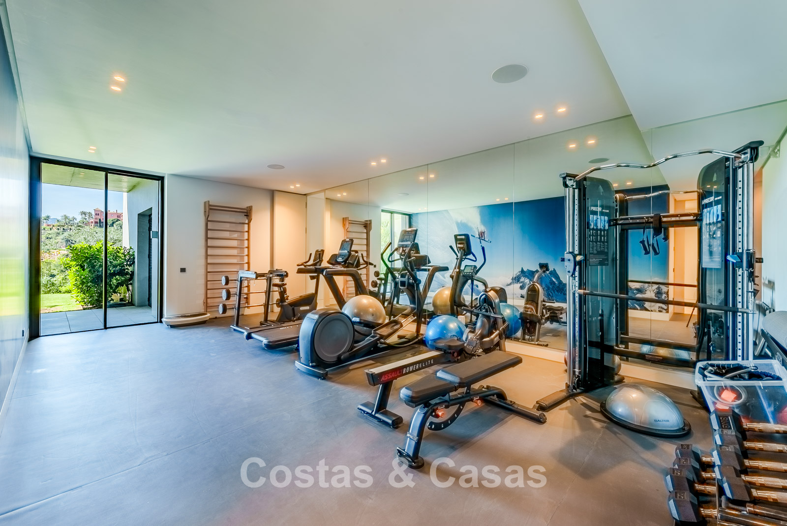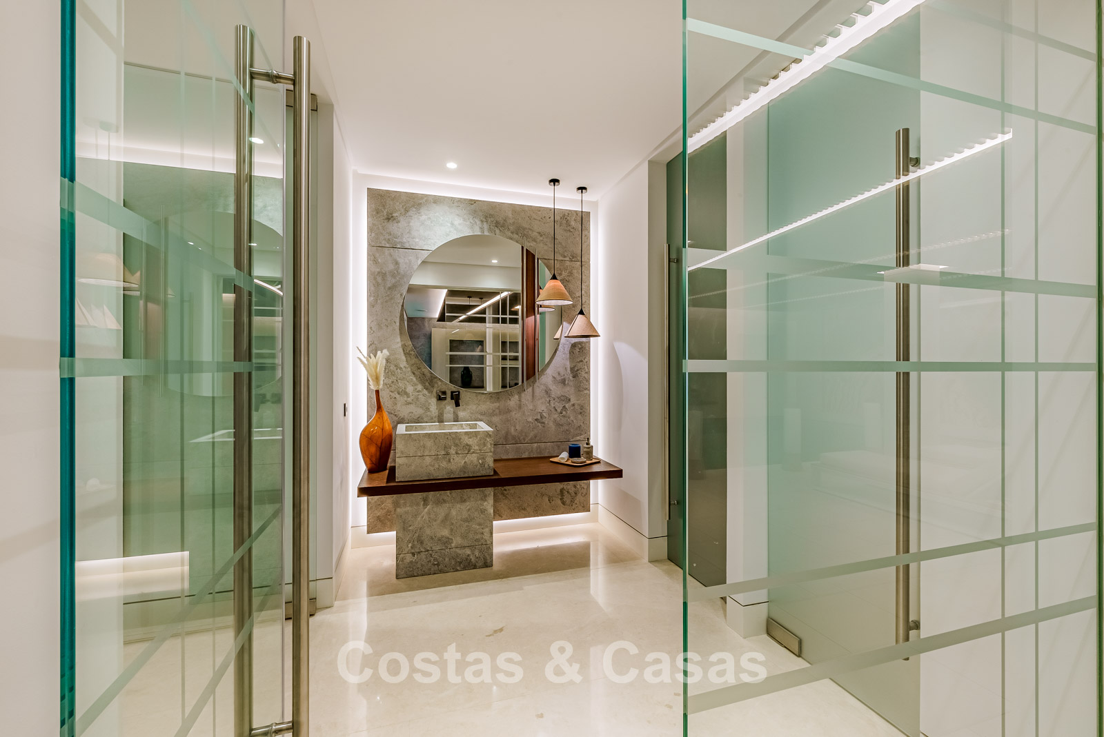 Exceptional, detached villa with ultra-modern architecture. The architecture combines minimalism with warmth: white facades, natural stone, wood accents, and lush gardens create an atmosphere of timeless elegance. Designed with an eye for refined design and sustainability. Super-high ceilings. Floor-to-ceiling sliding windows with recessed profiles throughout the villa create a seamless transition between indoors and outdoors, letting in abundant natural light. The airy, open-plan living area connects directly to the outdoor space, creating a feeling of space and light. High-quality, custom-designed open-plan kitchen with a large central island, breakfast bar, and dining table. Eight custom-designed bedrooms, eight bathrooms, and four separate toilets. The master suite features a spacious walk-in closet and a spa-inspired bathroom. An indoor spa includes a heated indoor pool, sauna, Turkish steam bath, and separate shower, ideal for ultimate relaxation year-round. Formal office space. Private loft-style home cinema. Air-conditioned wine cellar. Fully equipped gym with adjoining massage room. Storage room. Equipped laundry room. Utility room. Parking for 6 cars.