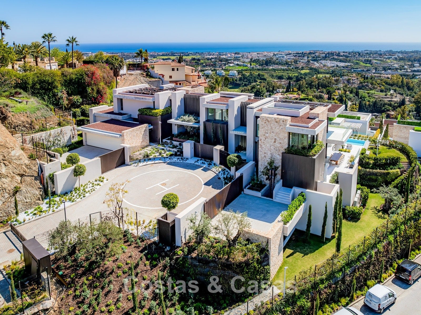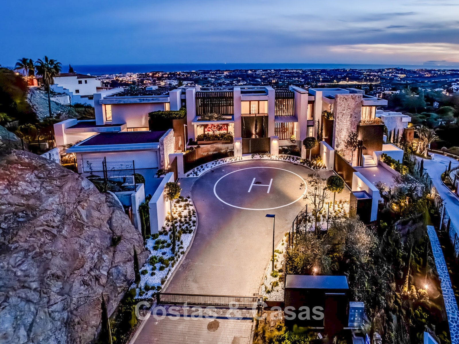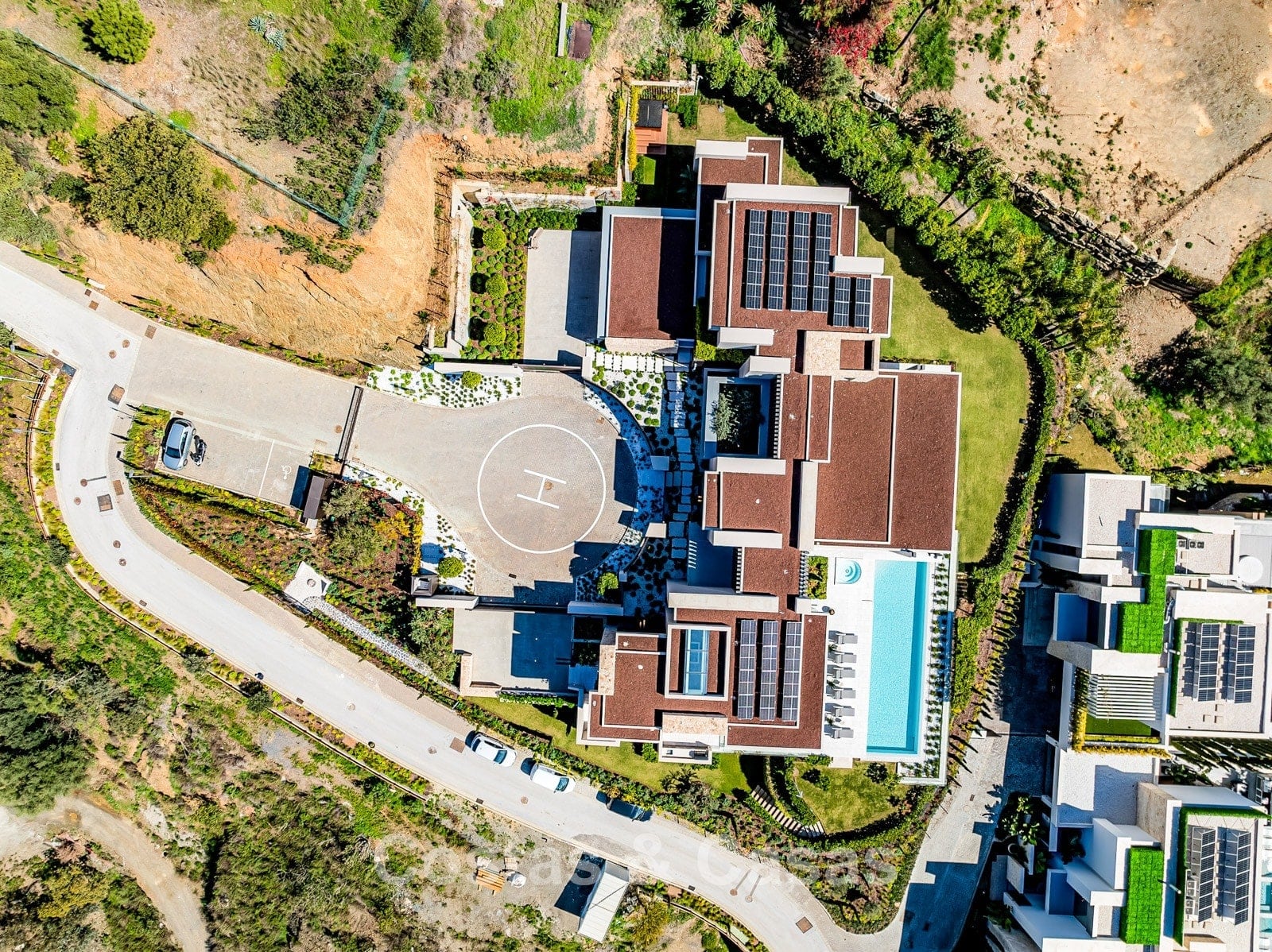 Situated on a generous, secluded plot in an elevated position. A sweeping access road leads to a spacious courtyard with a private helipad, immediately emphasizing the exclusive character of this residence. The outdoor area is designed as a private resort, with a vast infinity pool, sunny lounge terraces, and immaculately maintained gardens. An outdoor kitchen with a barbecue and outdoor dining area, perfect for relaxed summer evenings and stylish gatherings overlooking the sea. South-facing. Magnificent views over the green landscapes, with the Mediterranean Sea and the Strait of Gibraltar on the horizon.