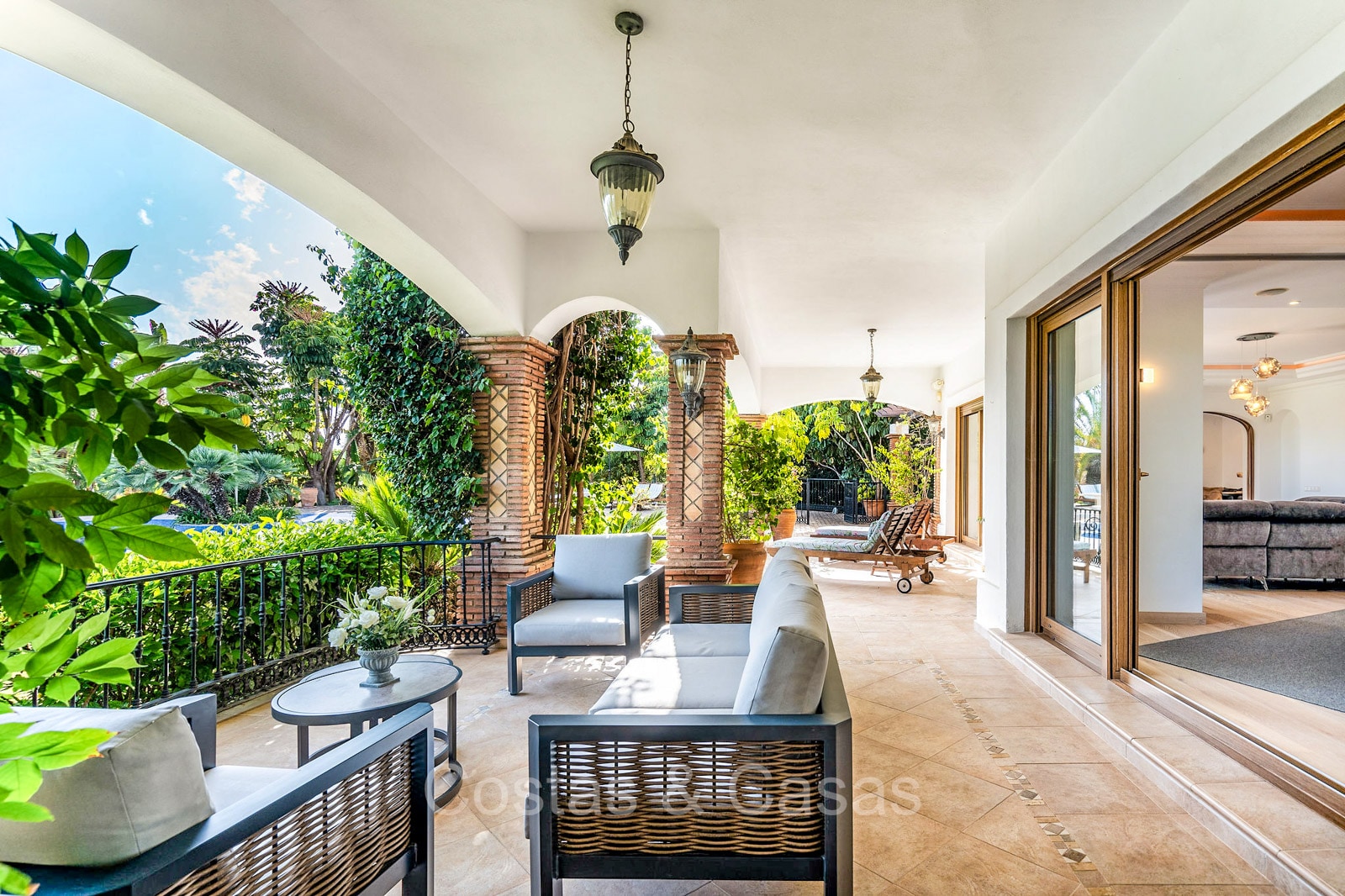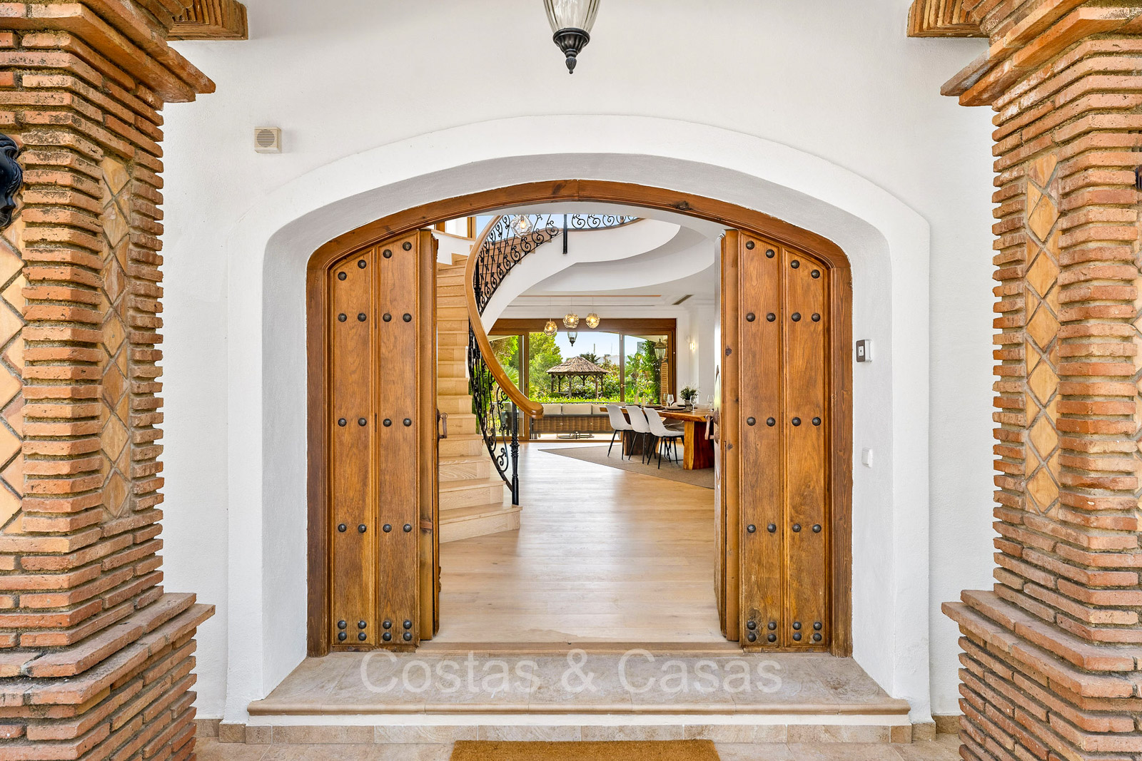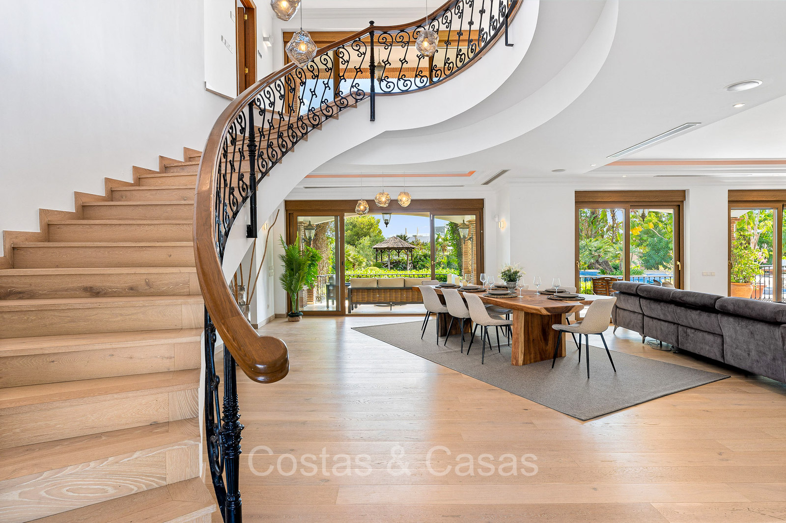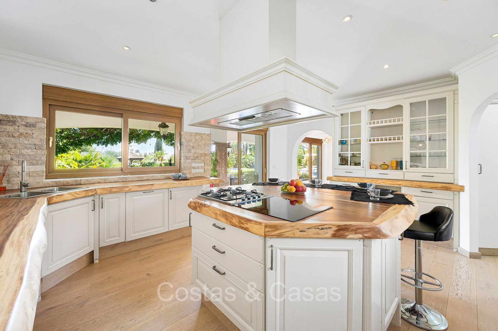 Detached villa with a traditional Andalusian architectural style. Carefully renovated in 2020. High sliding windows open onto the outdoor areas and also generate plenty of natural daylight. Upon entering, you are greeted by a large, charming space with a graceful staircase and a double-height ceiling that elegantly climbs to the upper floor. Cozy open living room with fireplace. Integrated dining area. Practical custom kitchen with a central island for seating. Utility room with a walk-in refrigerator. 6 bedrooms, 6 bathrooms and 2 separate toilets. The master suite is located upstairs and enjoys a large bathroom, walk-in closet and provides access to the expansive terrace. A small room upstairs can be freely arranged as a private office or study. Hardwood floors. An indoor guest house with private access. Laundry room. Indoor garage for 2 cars. Additional parking for 3 to 4 cars.