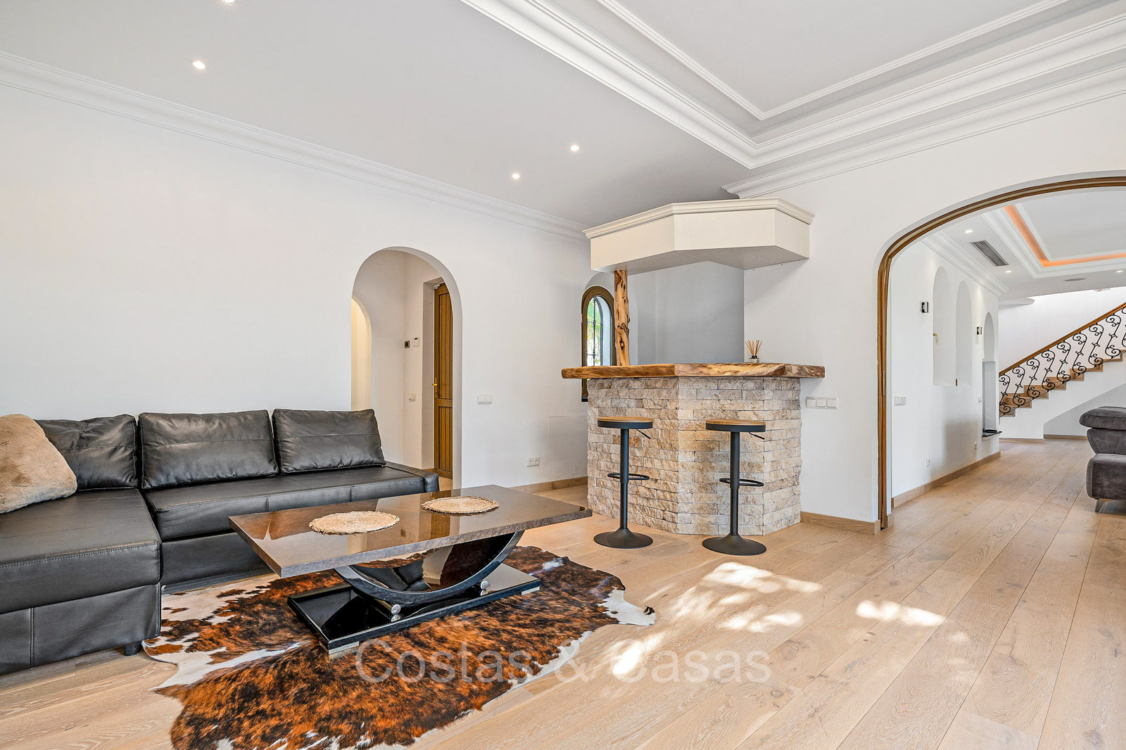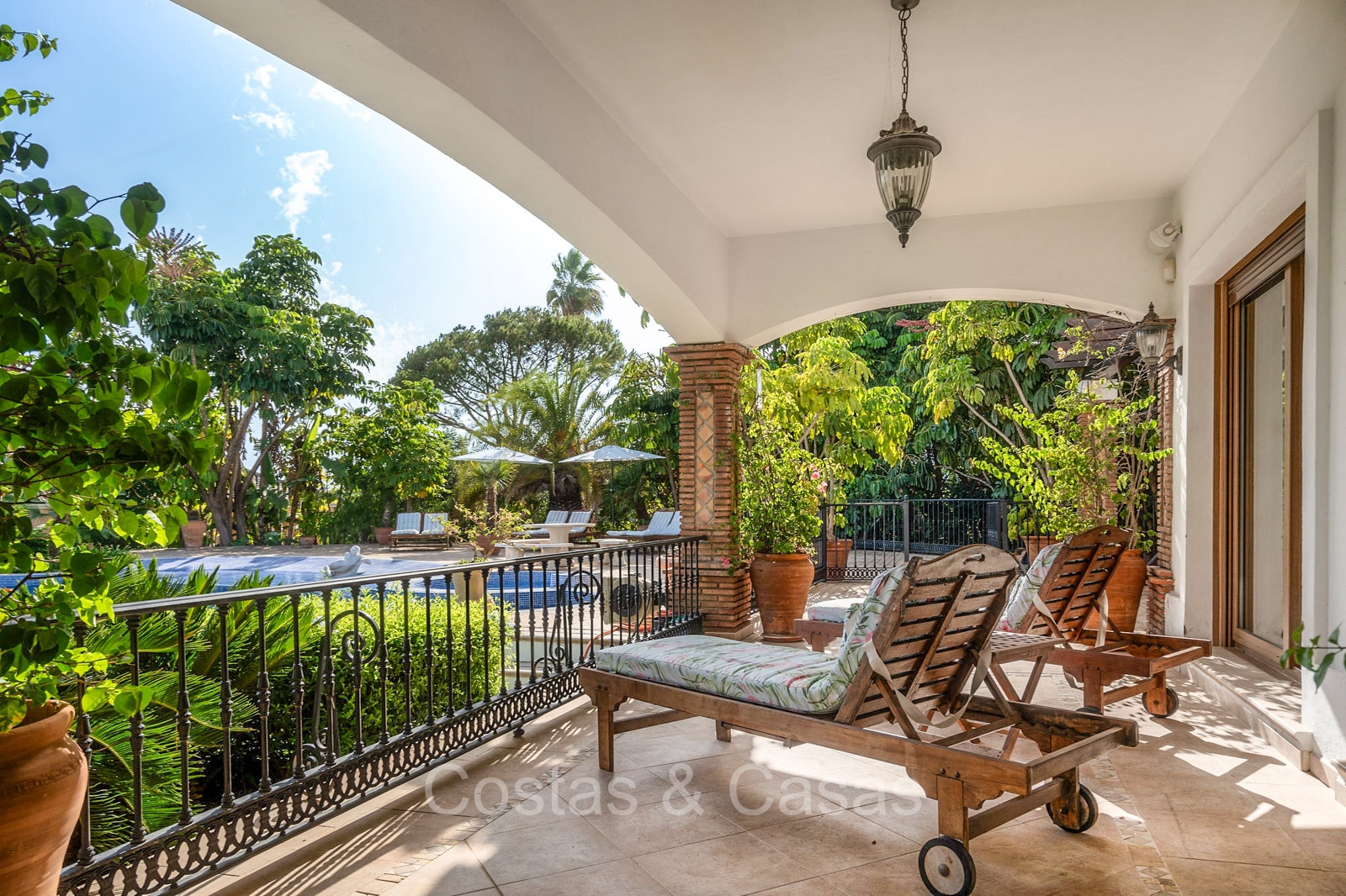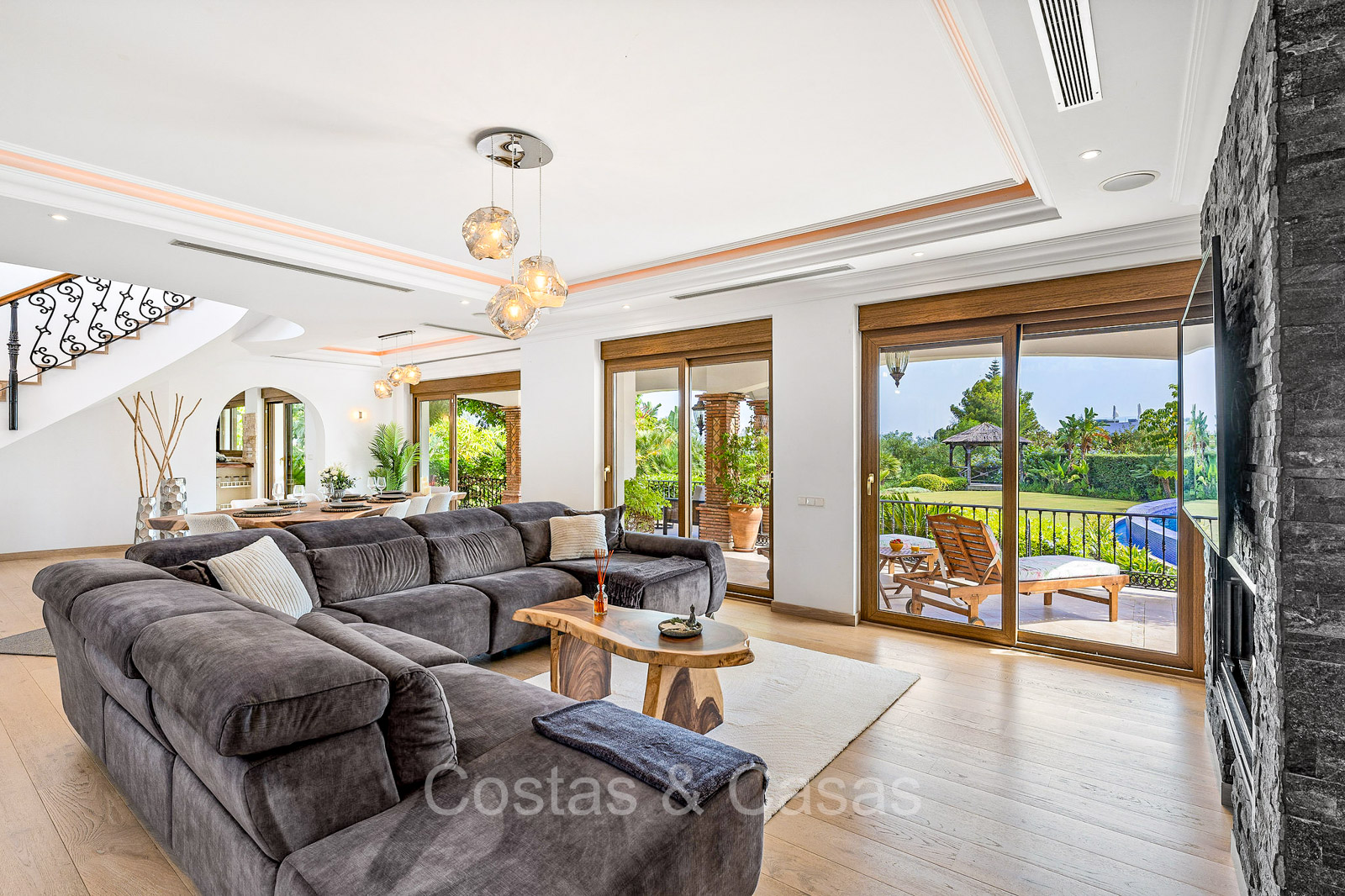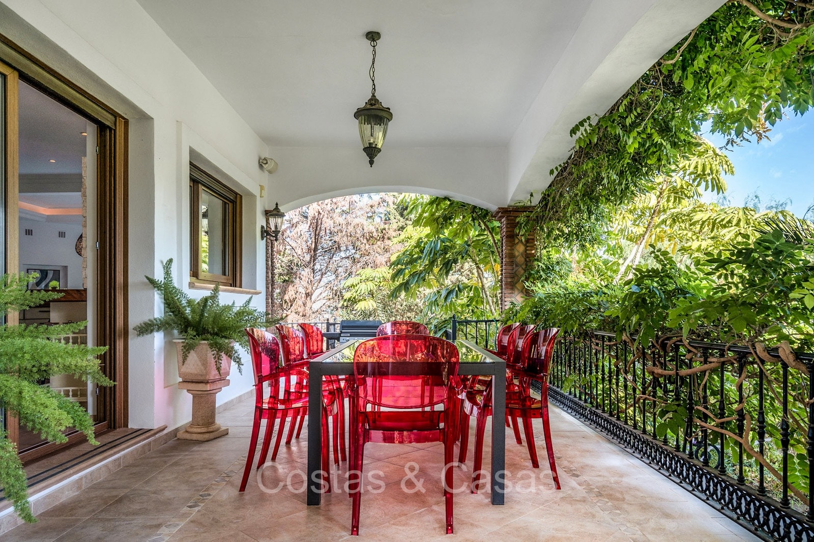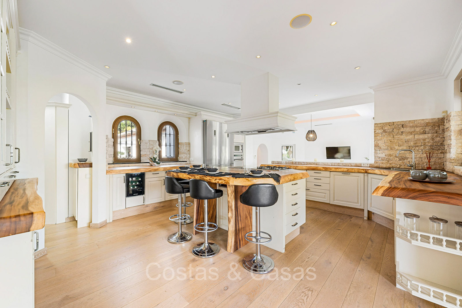 Detached villa with a traditional Andalusian architectural style. Carefully renovated in 2020. High sliding windows open onto the outdoor areas and also generate plenty of natural daylight. Upon entering, you are greeted by a large, charming space with a graceful staircase and a double-height ceiling that elegantly climbs to the upper floor. Cozy open living room with fireplace. Integrated dining area. Practical custom kitchen with a central island for seating. Utility room with a walk-in refrigerator. 6 bedrooms, 6 bathrooms and 2 separate toilets. The master suite is located upstairs and enjoys a large bathroom, walk-in closet and provides access to the expansive terrace. A small room upstairs can be freely arranged as a private office or study. Hardwood floors. An indoor guest house with private access. Laundry room. Indoor garage for 2 cars. Additional parking for 3 to 4 cars.
