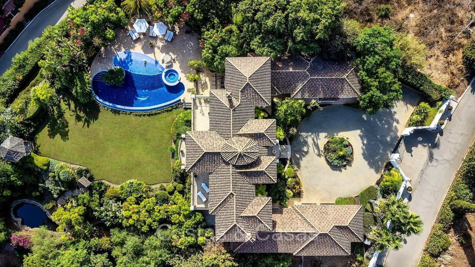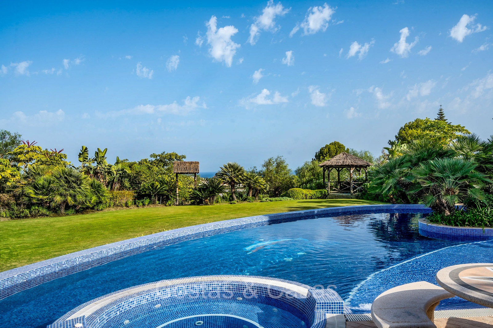 Extensive, fully fenced plot located in an elevated position. Well-kept exterior with lots of greenery, landscaped flower beds and a private pond. Beautiful infinity pool with a built-in jacuzzi and a sun terrace. Generous open and covered terraces offer the opportunity to enjoy the pleasant Mediterranean climate all year round. South facing. Breathtaking views of the Mediterranean Sea and the green surrounding landscapes from the first floor.