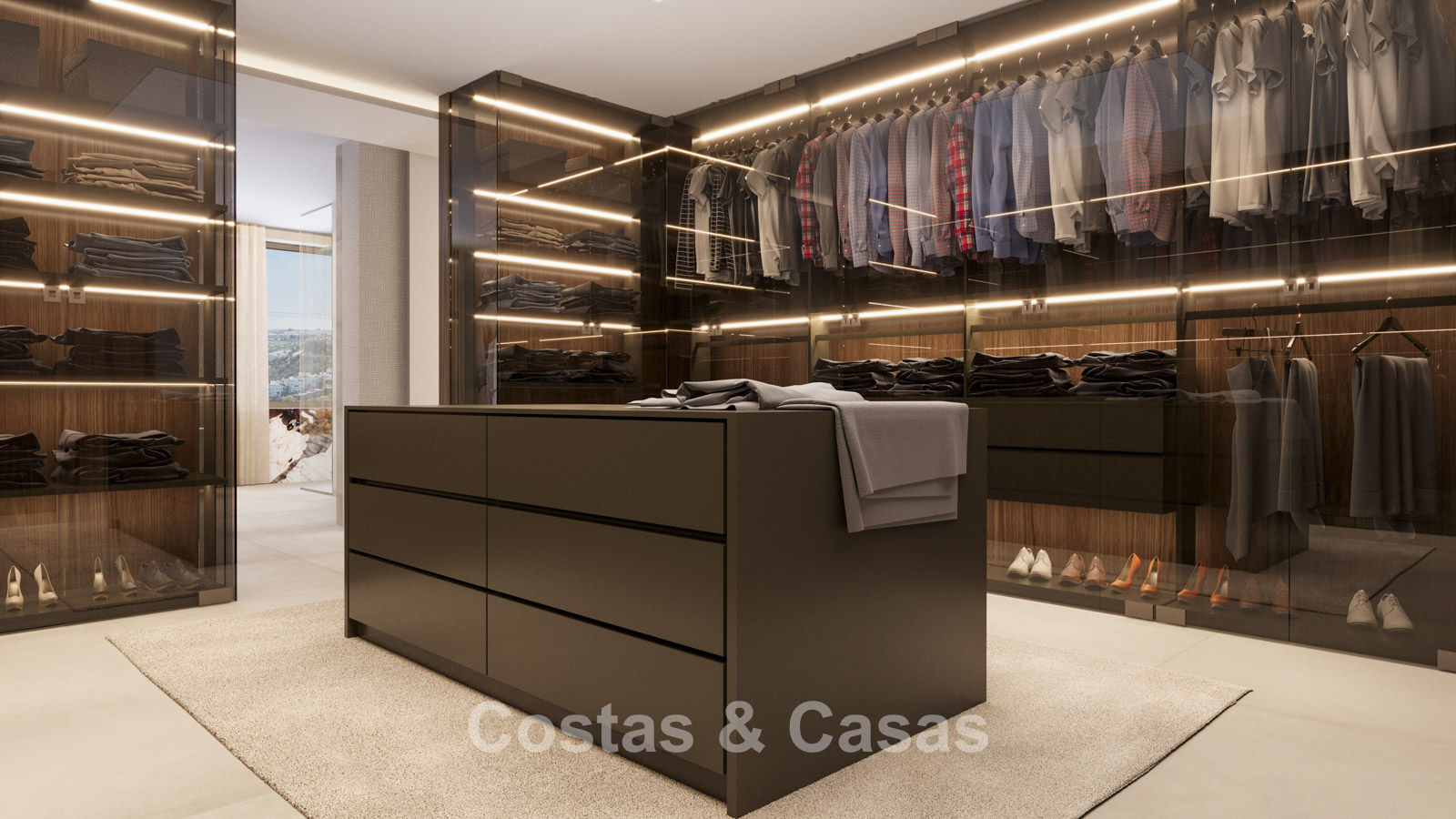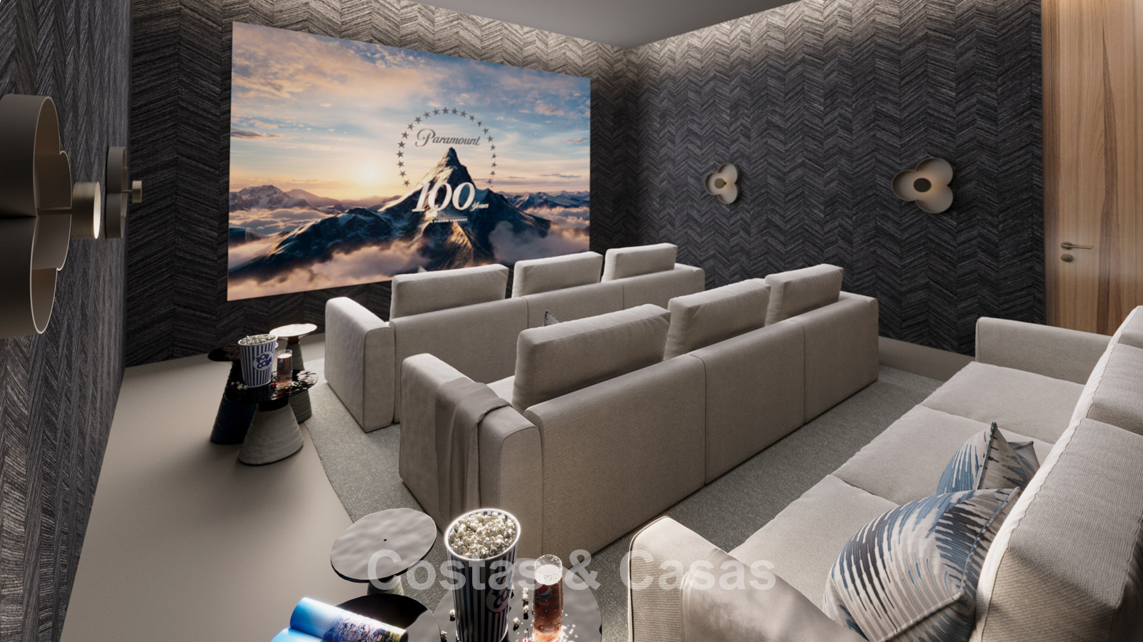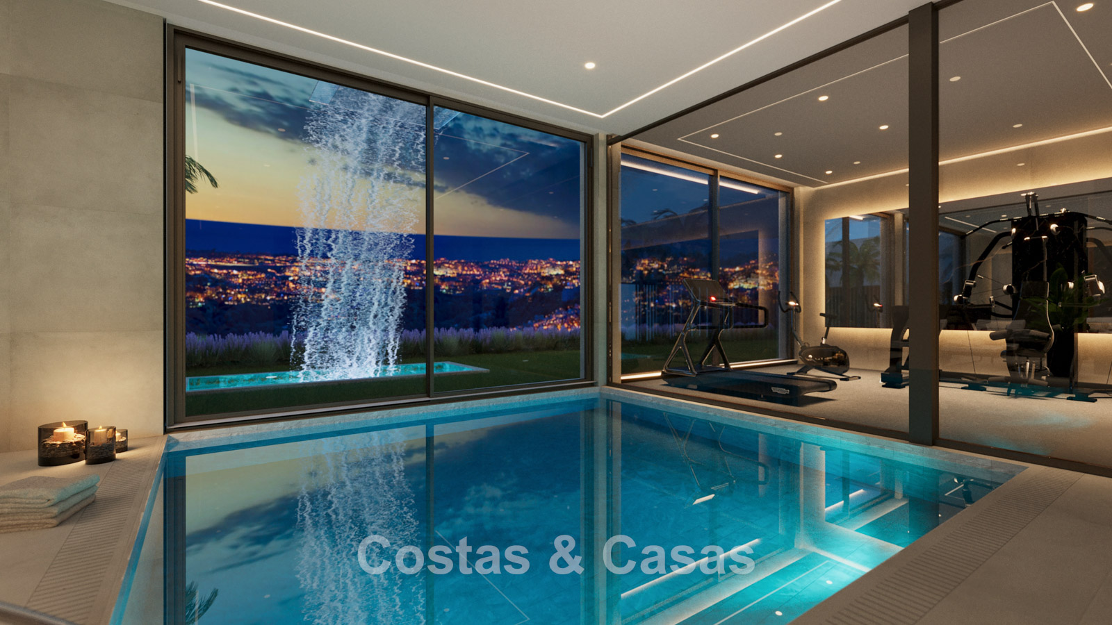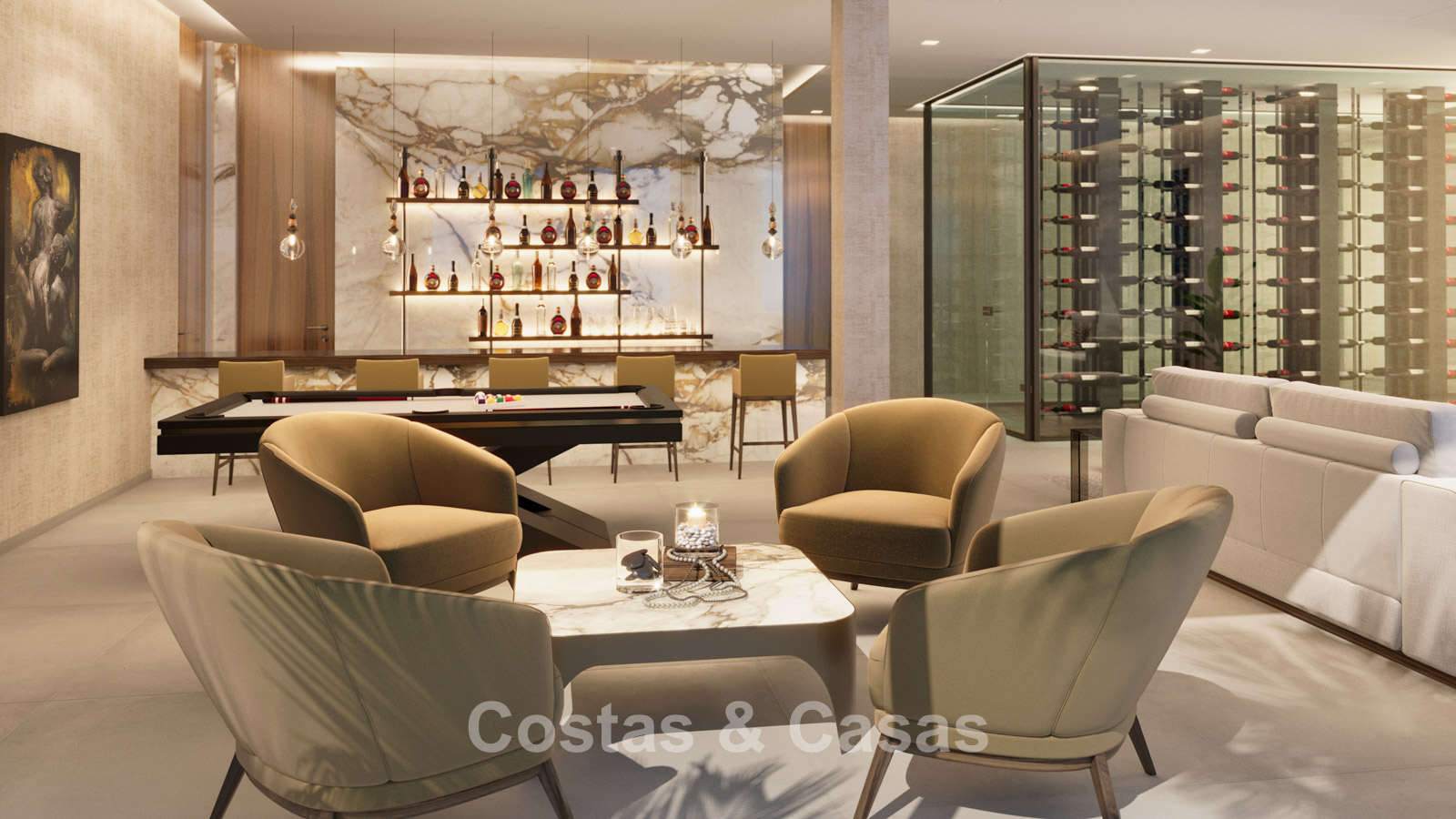 Luxurious new build villa with an architectural design on plan. Expertly designed with advanced technologies. Trendy and luxurious interior style. An abundance of large windows creates a seamless transition between indoors and outdoors, while offering panoramic views of the stunning surroundings. Spacious open plan living space, with a partial double height ceiling, features a living room and dining area. A functional custom designer kitchen with high-end appliances and a central cooking island. 6 bedrooms, 7 bathrooms and 3 separate toilets. Climatised wine cellar. The lower floor features a spa with an indoor pool, Turkish bath, sauna and a bathroom. Fully equipped gym. On the lower floor there is a recreation room with a bar, play area and chill-out zone. Storage room. (multiple) Laundry room. Technical room.