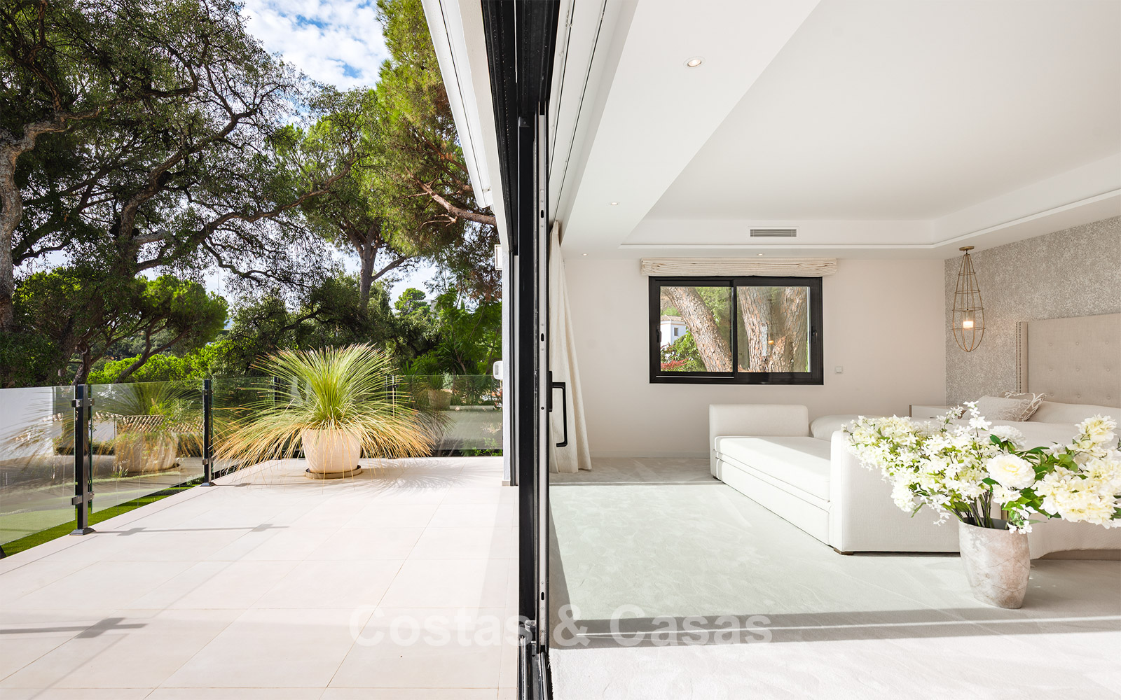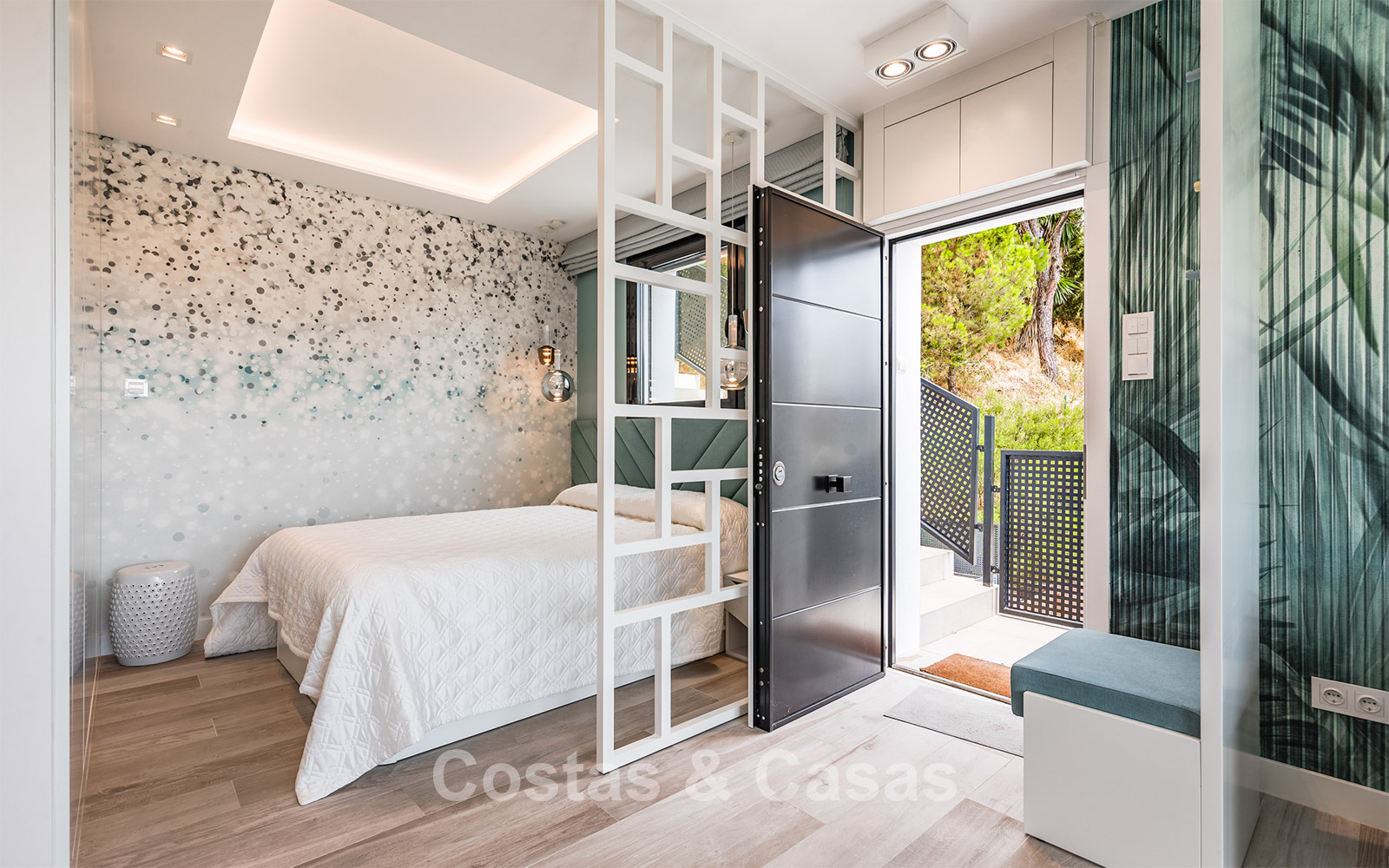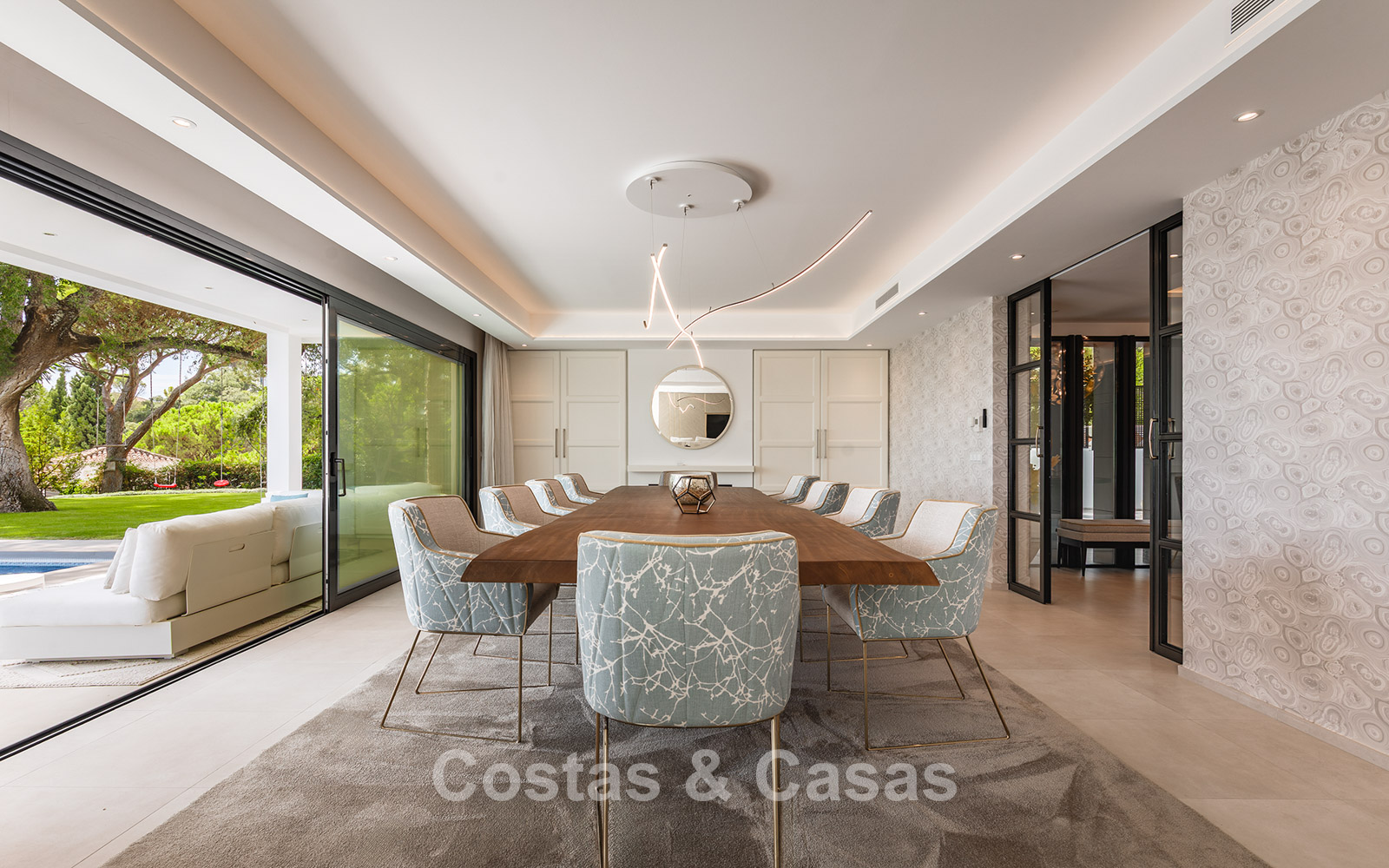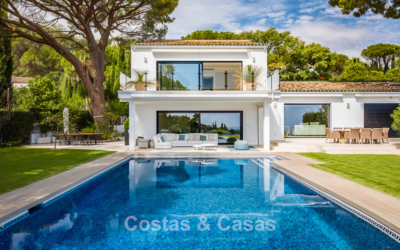 Modern detached villa with Mediterranean influences in its design. Fully modernized with luxurious materials. Large sliding windows with recessed frames provide abundant natural light and enhance the feeling of openness. The interior combines contemporary style with a sense of tranquility, characterized by warm tones, harmonious lines, and top-quality materials. Spacious, open-plan living area. Adjacent is a formal dining area with a table for 10. The custom-built kitchen is equipped with floor-to-ceiling cabinets, Miele appliances, a stylish center island, and a dining table. There are eight bedrooms, seven bathrooms, and a separate toilet in total. The upper floor features the master suite, complete with a bathroom, a walk-in closet, and a private terrace with stunning views. An independent guesthouse, spread over two floors, offers three bedrooms, three bathrooms, a kitchen, and living areas, perfect for providing guests or staff with a private space. High-quality cream-colored tiled floors. Laundry room. Storage room. Integrated garage + 2 covered parking spaces.