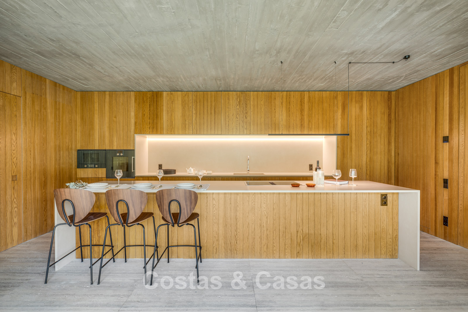 The kitchen combines understated luxury with warm materials and a sleek minimalist design, with everything focused on functionality and timeless design.