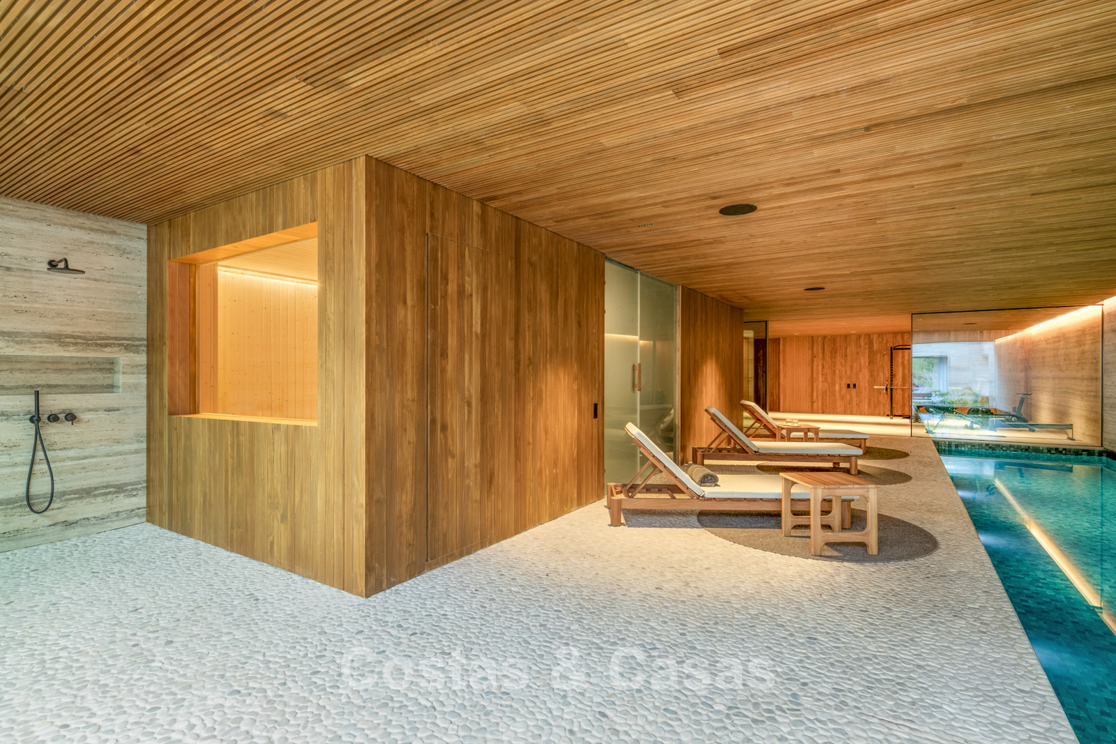 The basement is completely dedicated to relaxation and well-being, with an exclusive gym, a serene spa area with indoor pool, cold plunge, sauna and associated changing rooms and bathrooms that offer extra comfort.