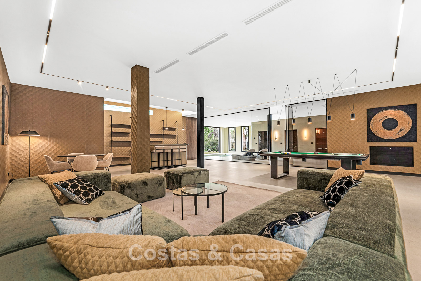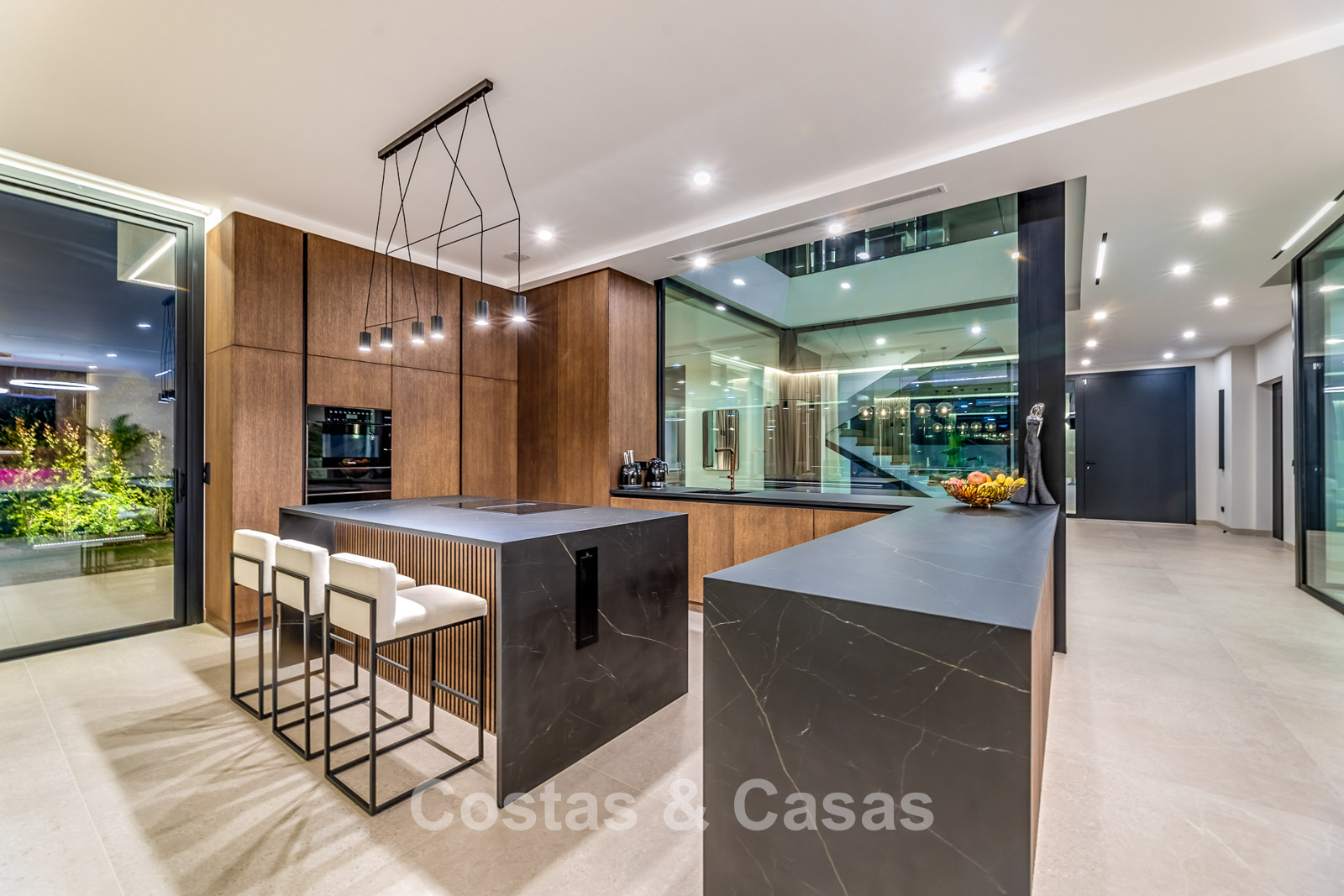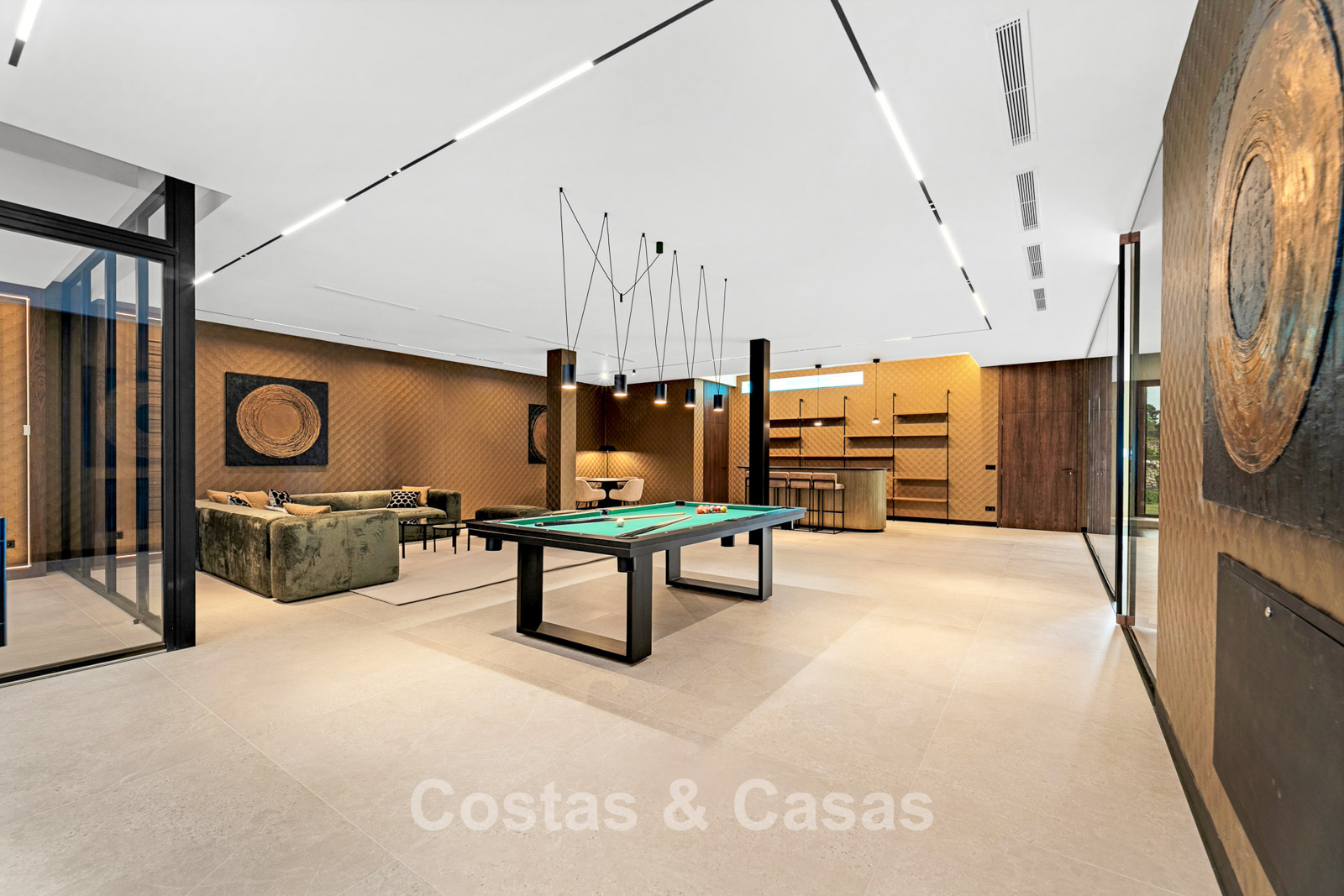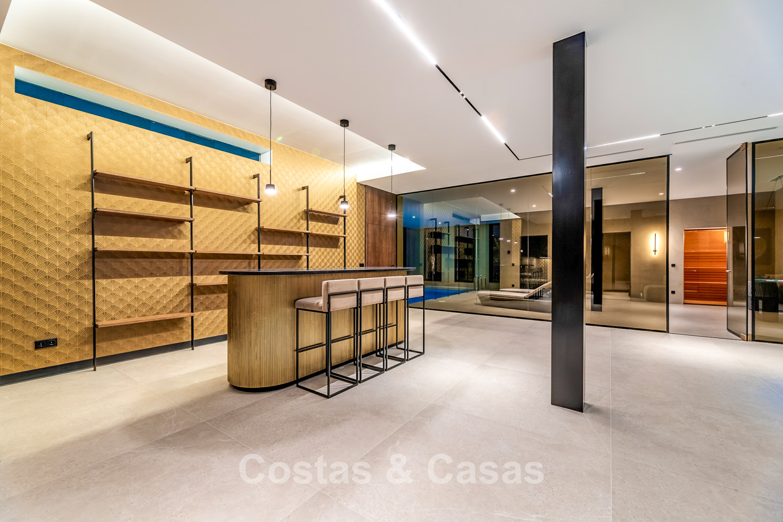 Advanced new build villa with innovative architectural concept. Carefully designed with sophisticated technologies. Sophisticated and modernistic interior design. An abundance of large windows, seamlessly connecting the inside and outside and offering panoramic views of the surrounding beauty. Comfortable, open layout with bright interior. Stunning open plan living space with living and dining area. Ultra-modern designer kitchen with marble worktops, quality appliances and a central seating island. 6 bedrooms, 7 bathrooms and separate toilet. Climate-controlled wine cellar. On the lower floor there is a spa with indoor pool, Turkish bath, sauna and bathroom. Fully equipped gym. A recreational area on the lower floor provides a bar, play area and chill-out. Storage room. (multiple) Laundry room. Technical room.