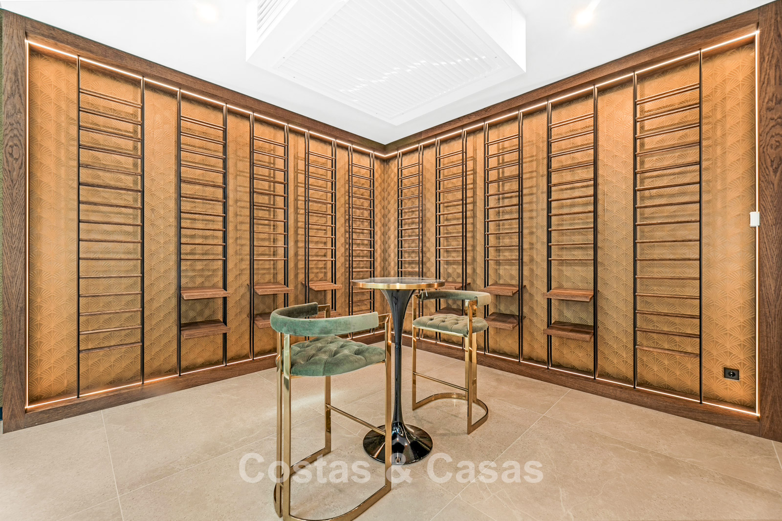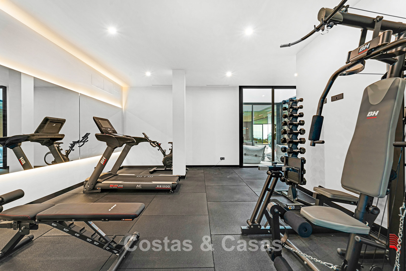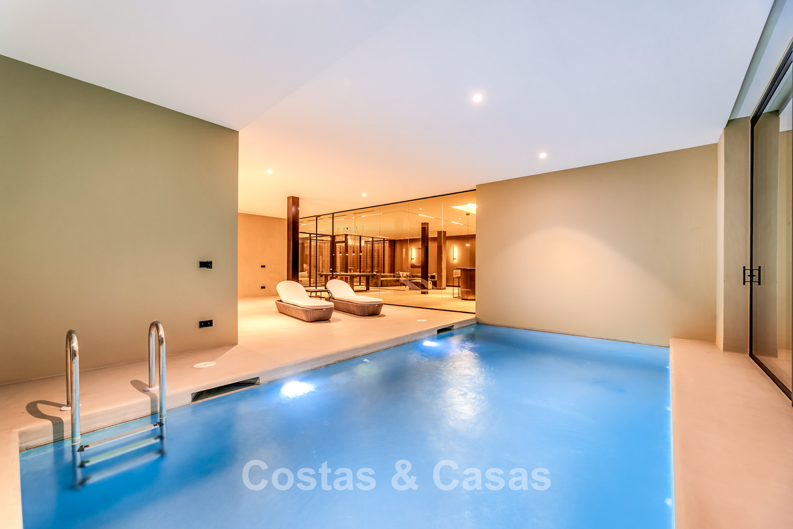 Advanced new build villa with innovative architectural concept. Carefully designed with sophisticated technologies. Sophisticated and modernistic interior design. An abundance of large windows, seamlessly connecting the inside and outside and offering panoramic views of the surrounding beauty. Comfortable, open layout with bright interior. Stunning open plan living space with living and dining area. Ultra-modern designer kitchen with marble worktops, quality appliances and a central seating island. 6 bedrooms, 7 bathrooms and separate toilet. Climate-controlled wine cellar. On the lower floor there is a spa with indoor pool, Turkish bath, sauna and bathroom. Fully equipped gym. A recreational area on the lower floor provides a bar, play area and chill-out. Storage room. (multiple) Laundry room. Technical room.