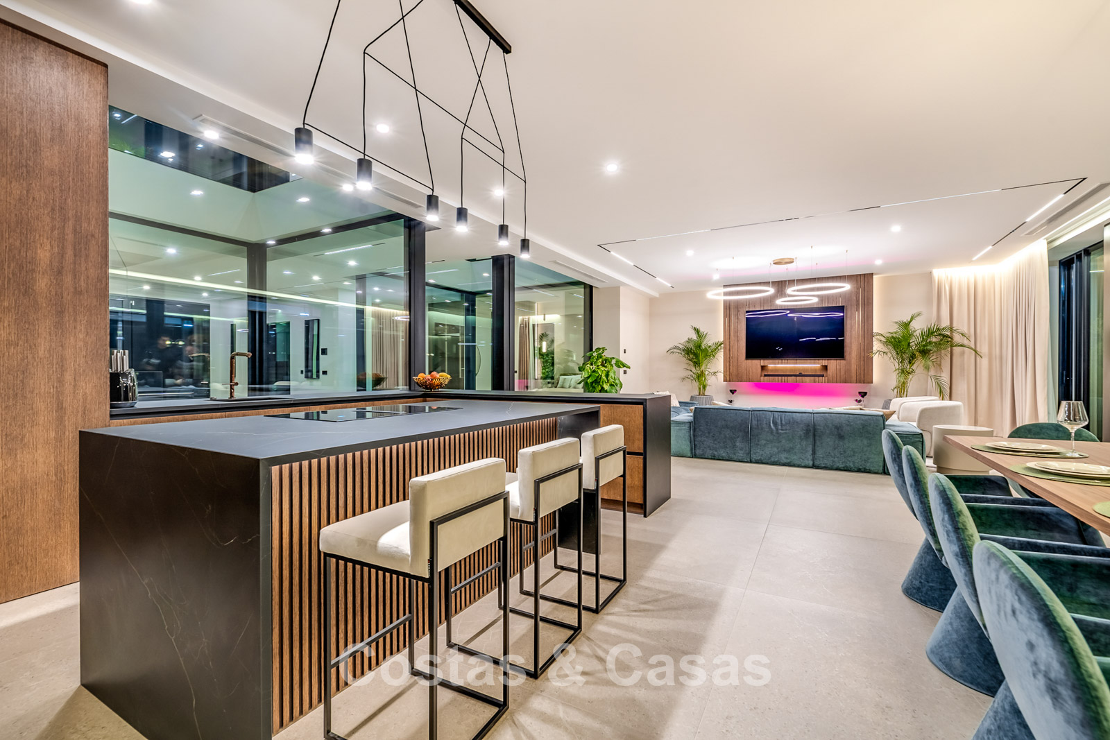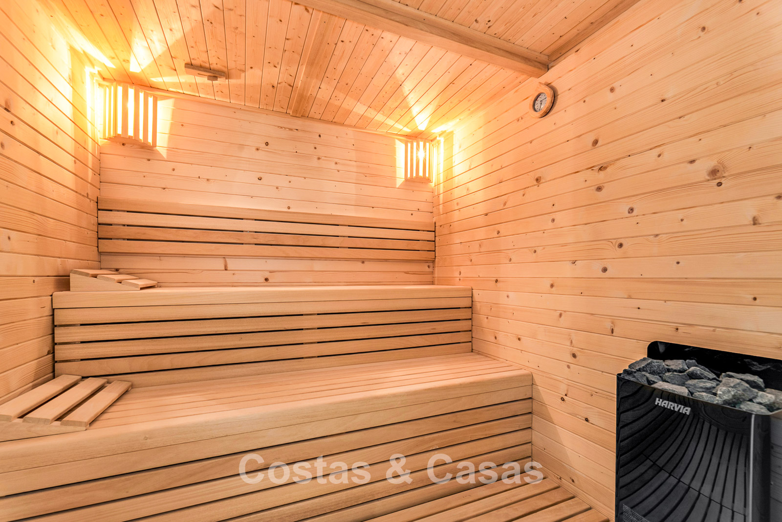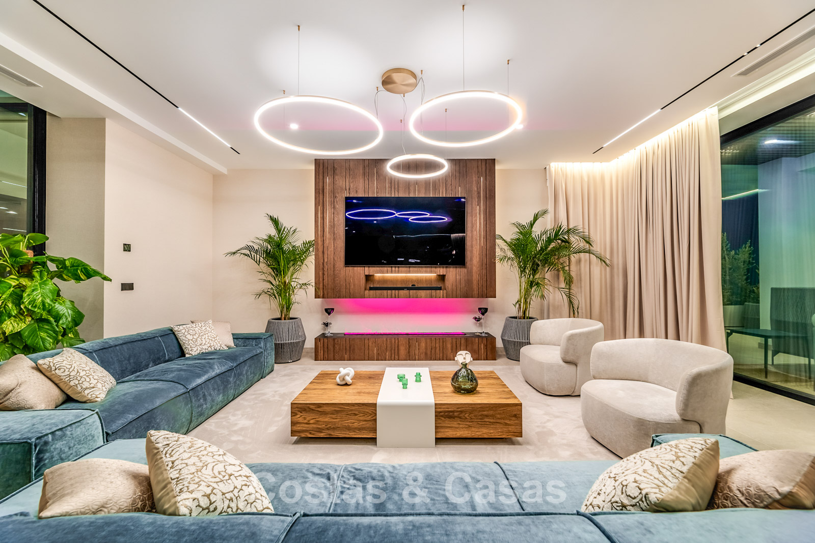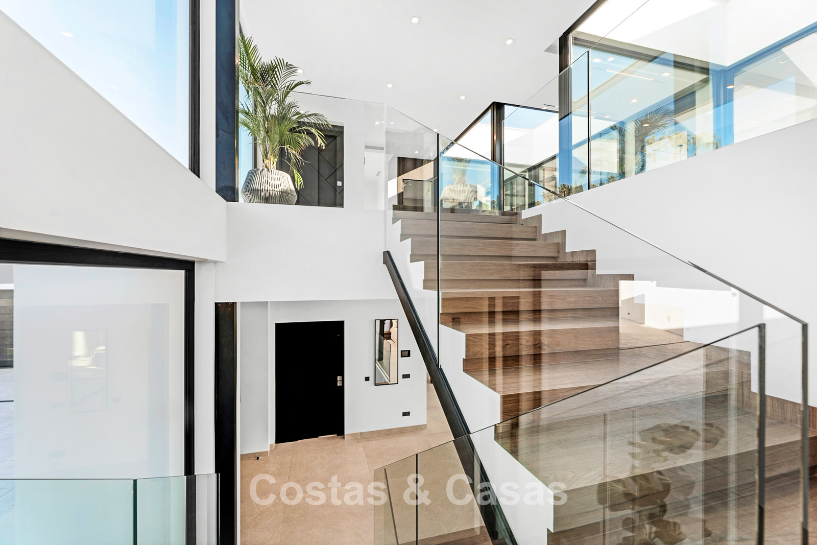 Advanced new build villa with innovative architectural concept. Carefully designed with sophisticated technologies. Sophisticated and modernistic interior design. An abundance of large windows, seamlessly connecting the inside and outside and offering panoramic views of the surrounding beauty. Comfortable, open layout with bright interior. Stunning open plan living space with living and dining area. Ultra-modern designer kitchen with marble worktops, quality appliances and a central seating island. 6 bedrooms, 7 bathrooms and separate toilet. Climate-controlled wine cellar. On the lower floor there is a spa with indoor pool, Turkish bath, sauna and bathroom. Fully equipped gym. A recreational area on the lower floor provides a bar, play area and chill-out. Storage room. (multiple) Laundry room. Technical room.