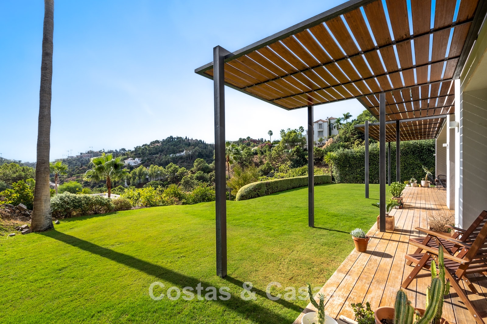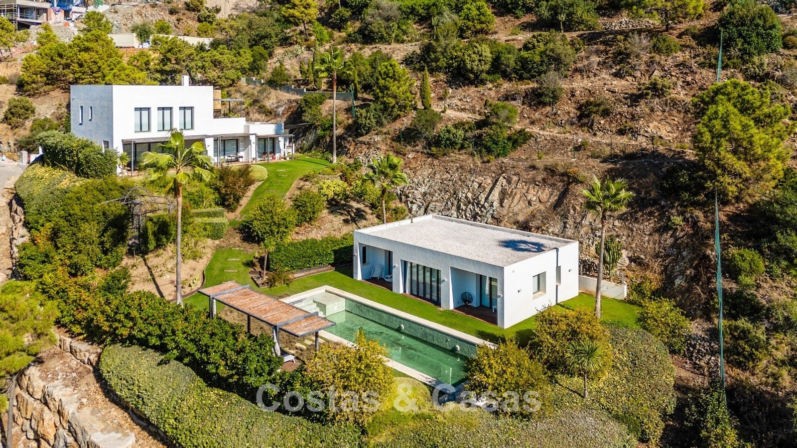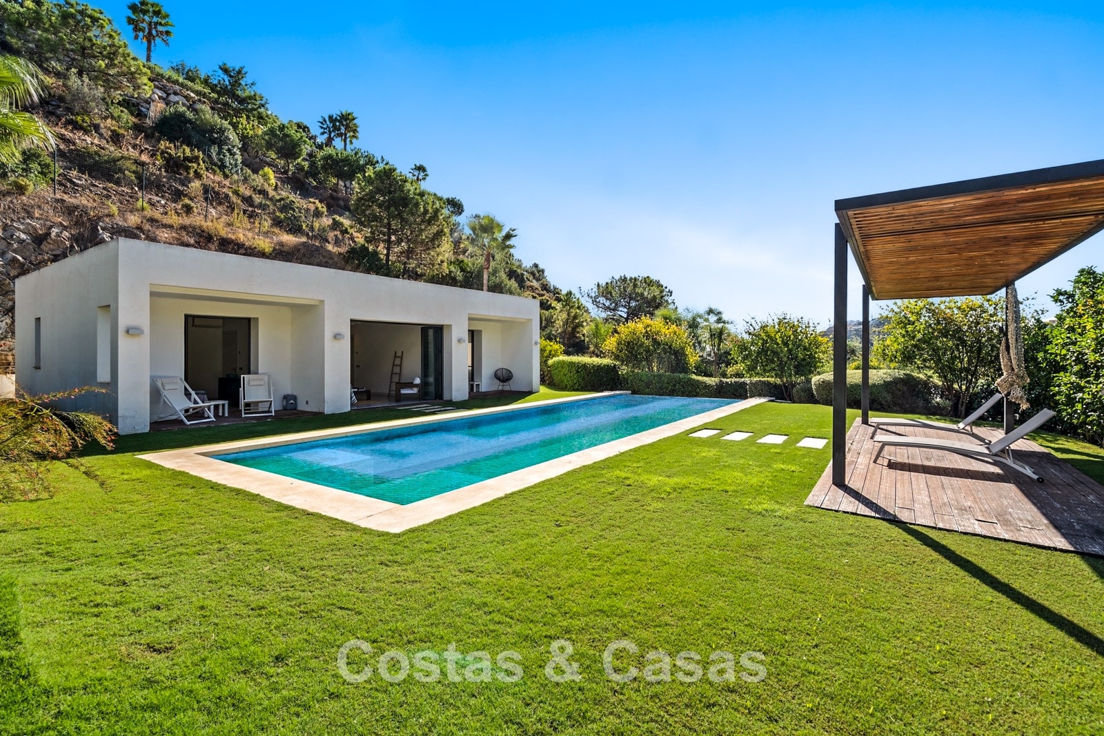 Expansive 3,000 m² plot. Outdoor space designed for the ultimate Mediterranean lifestyle with lawns and mature vegetation. South-west orientation. Built-in, elongated private swimming pool. Spacious terraces with modern wooden pergolas for shaded dining. Views of the lush surroundings, the hillside, and the Mediterranean Sea in the distance.