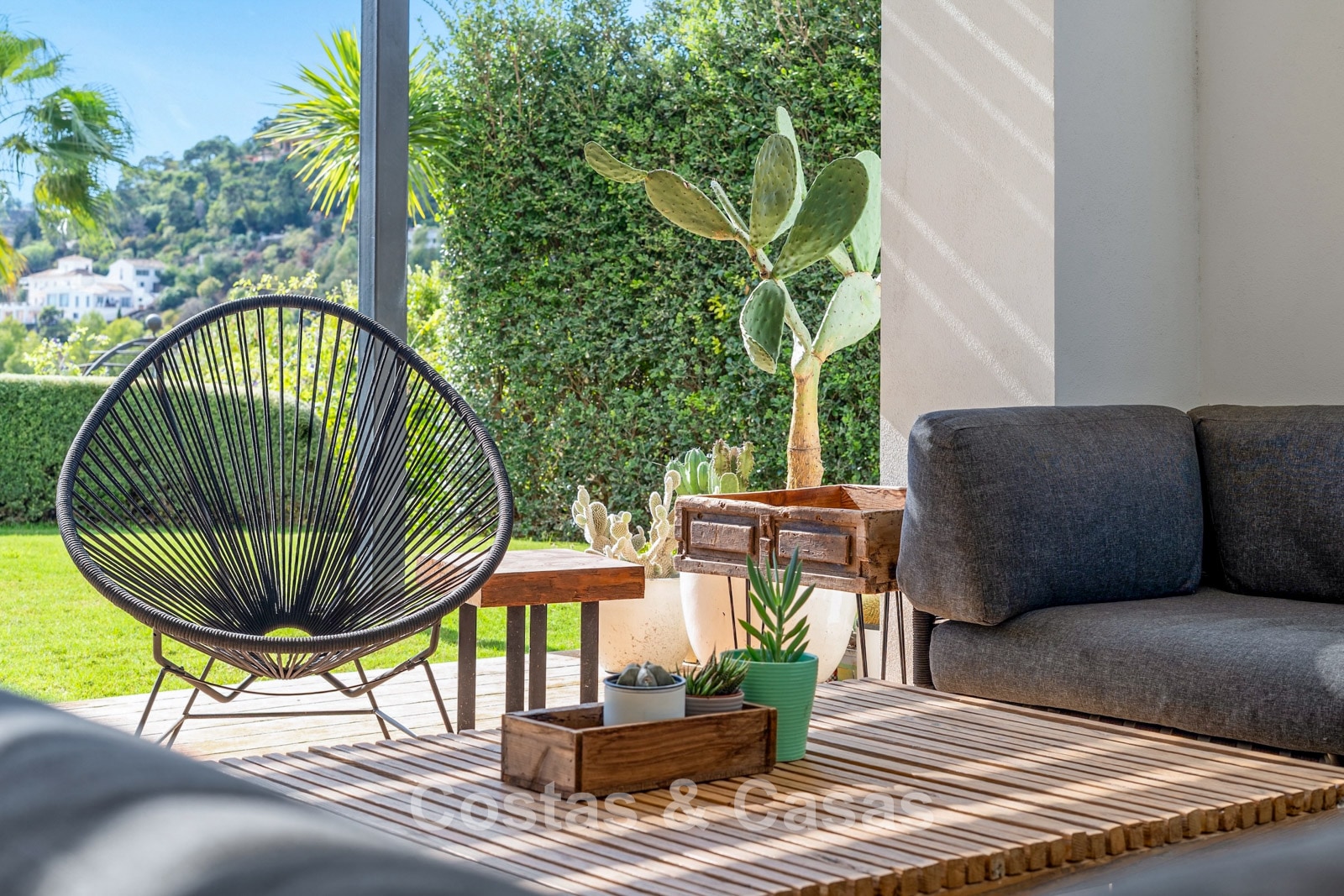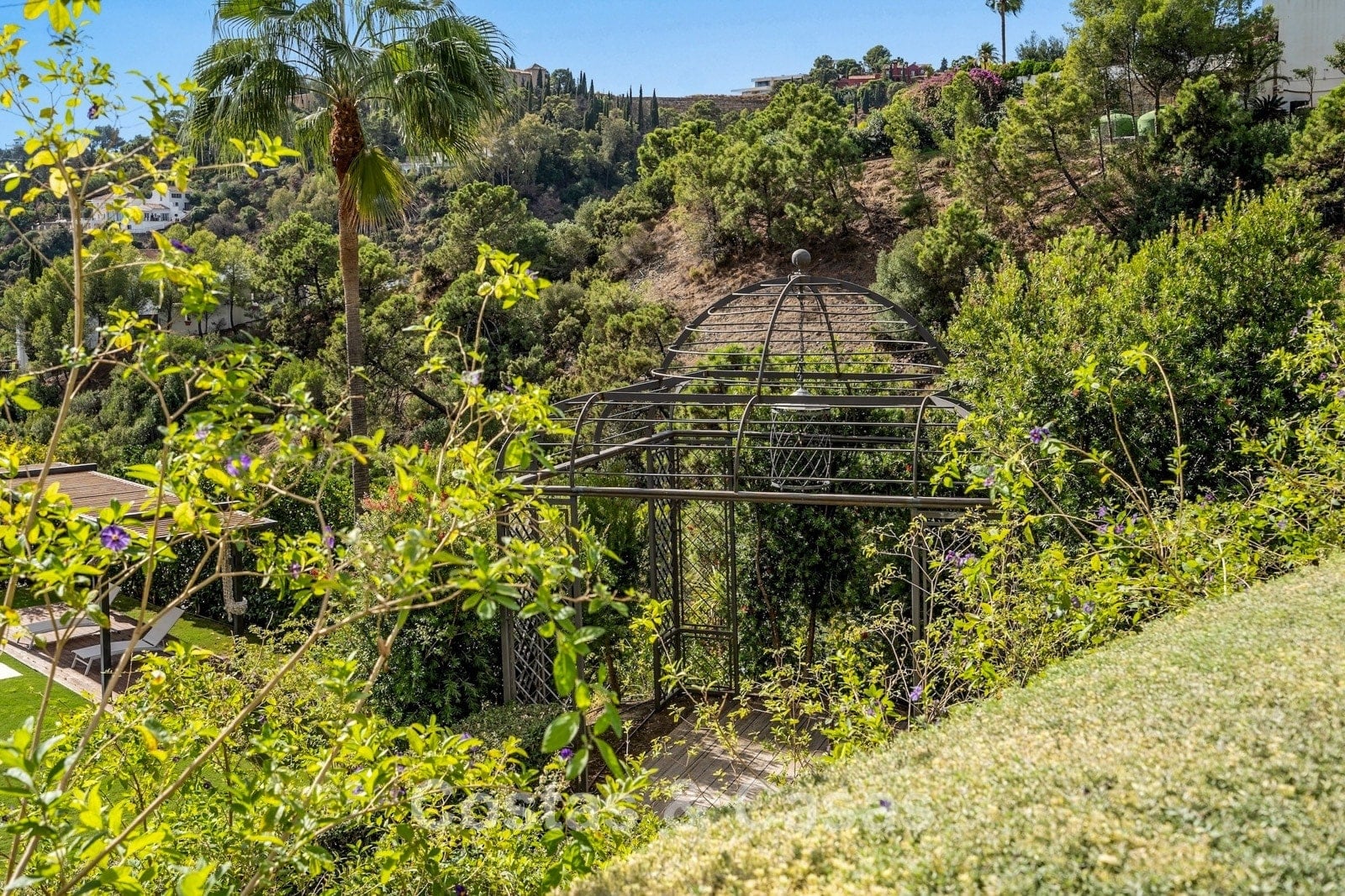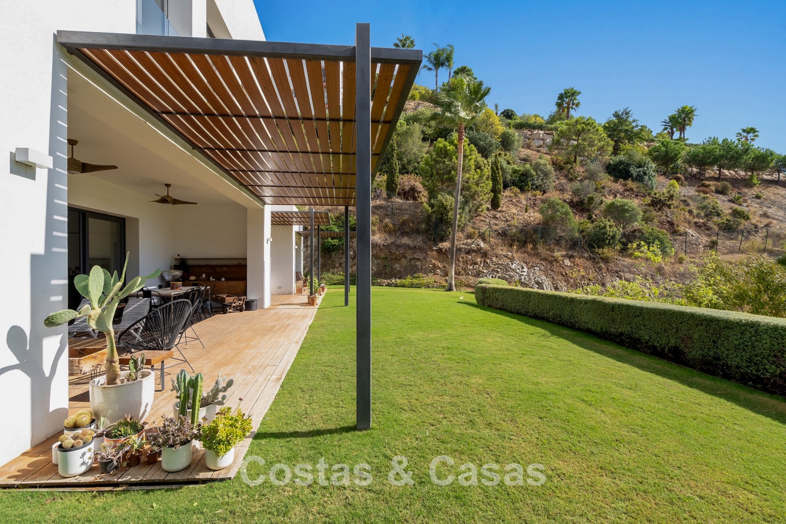 Expansive 3,000 m² plot. Outdoor space designed for the ultimate Mediterranean lifestyle with lawns and mature vegetation. South-west orientation. Built-in, elongated private swimming pool. Spacious terraces with modern wooden pergolas for shaded dining. Views of the lush surroundings, the hillside, and the Mediterranean Sea in the distance.