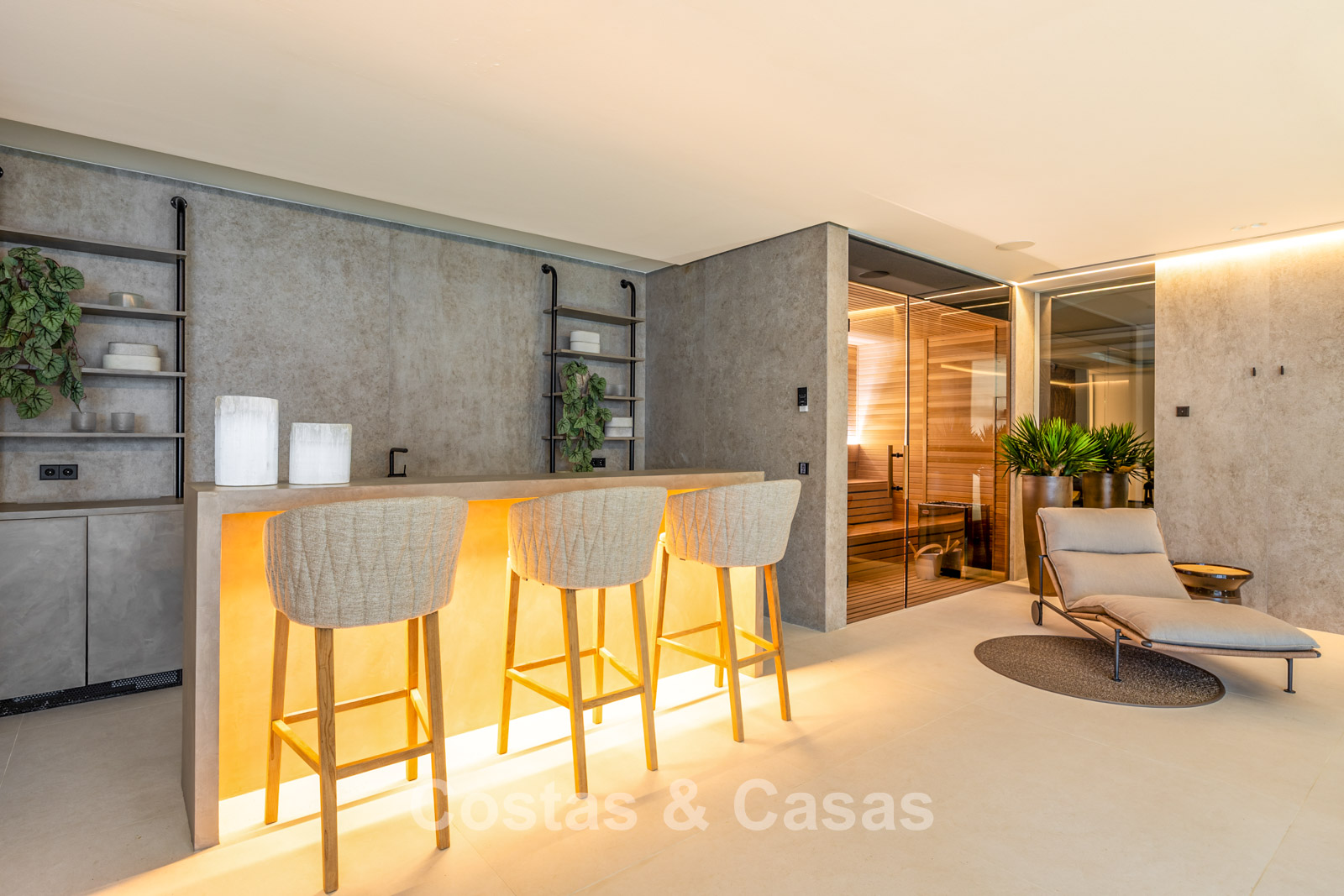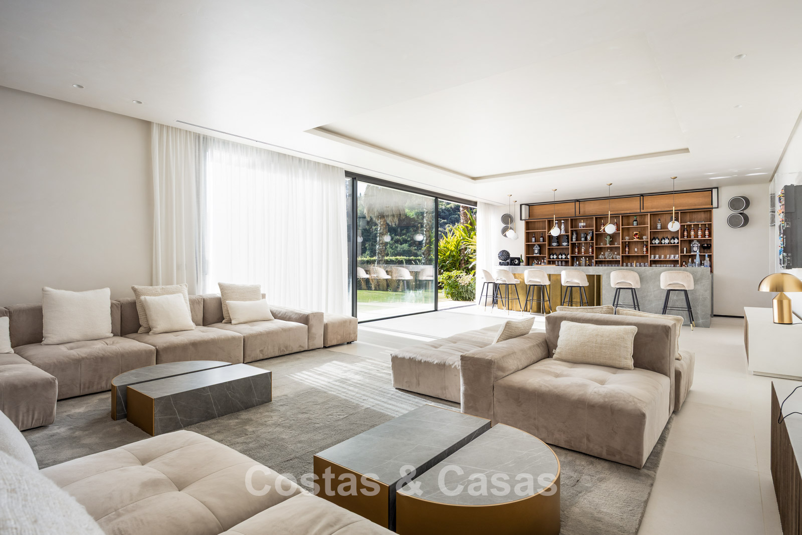 Luxurious villa with ultra-modern and sophisticated architecture. Only the highest quality materials and refined finishes have been used throughout. The interior is spacious and filled with natural light, with a strong emphasis on a seamless indoor-outdoor flow. The property features impressive floor-to-ceiling windows spanning the full height of the walls. The main living area boasts a striking double-height ceiling and an open-plan layout. The elegant living room flows effortlessly into the dining area and kitchen. The sleek designer kitchen is fully equipped with state-of-the-art appliances and a central island. 7 generously sized bedrooms, each with its own luxurious en-suite bathroom. The master suite on the upper floor includes a private lounge area and a spa-style bathroom. The lower level is dedicated to wellness and entertainment, featuring a heated indoor swimming pool, sauna, and hammam. There is also a fully equipped gym, a stylish bar, and the possibility of a home cinema room. A fully independent apartment for guests or staff includes its own living room and kitchenette. The property also offers ample storage space and a private garage with multiple parking spaces.