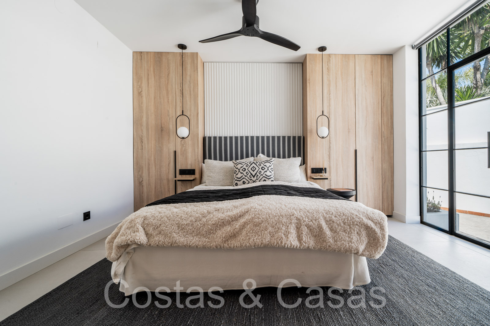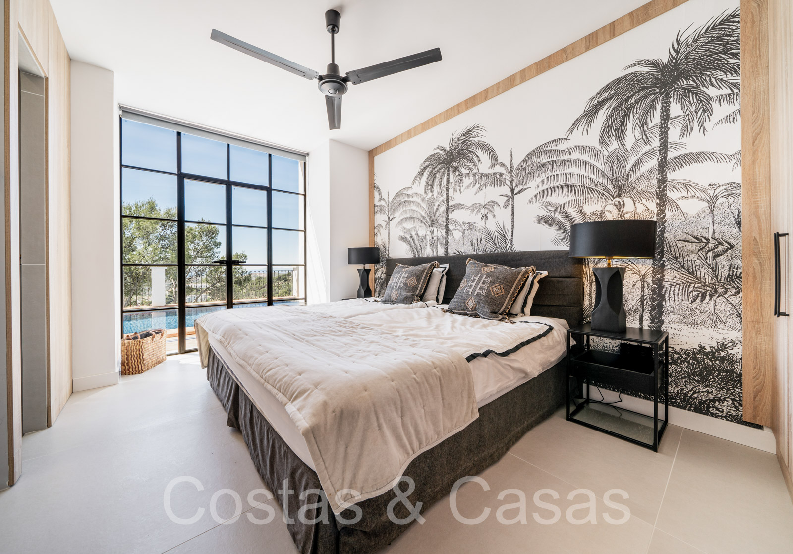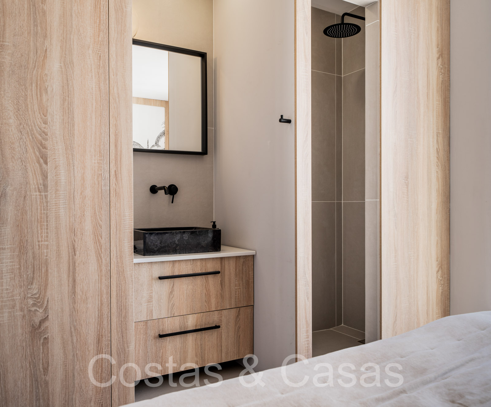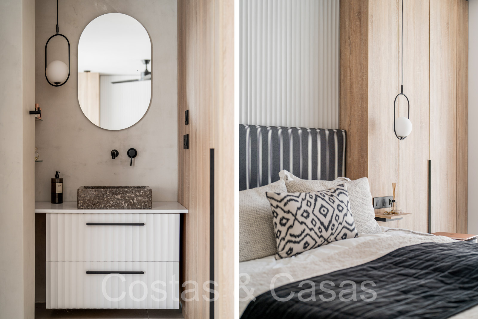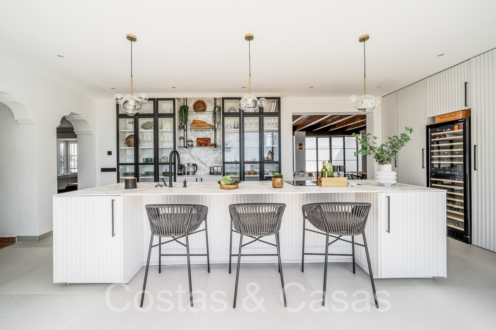 Detached villa with a modern, Andalusian architectural style. The use of fresh colours, terracotta and wooden materials gives both the interior and exterior a Mediterranean charm. Floor-to-ceiling window structures provide access to the outdoor space and also provide plenty of daylight. Elegant living space with a living and dining area. 2nd salon area. Large kitchen, fully equipped with high-quality appliances, plenty of storage space and a cooking island where you can sit. 4 bedrooms, 4 bathrooms. A mix of large format tiled floors and terracotta floors. Private parking for 2 cars.