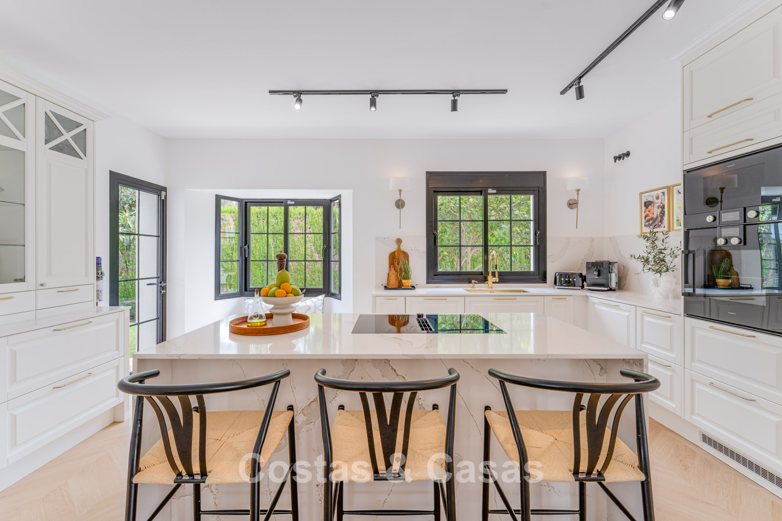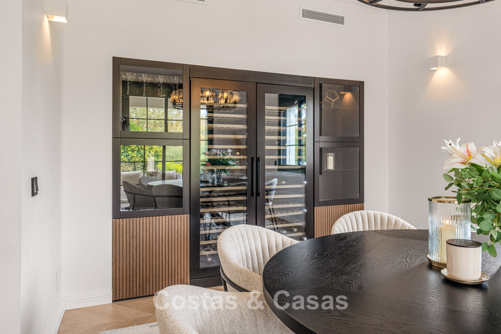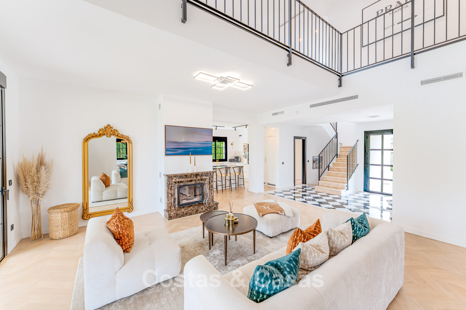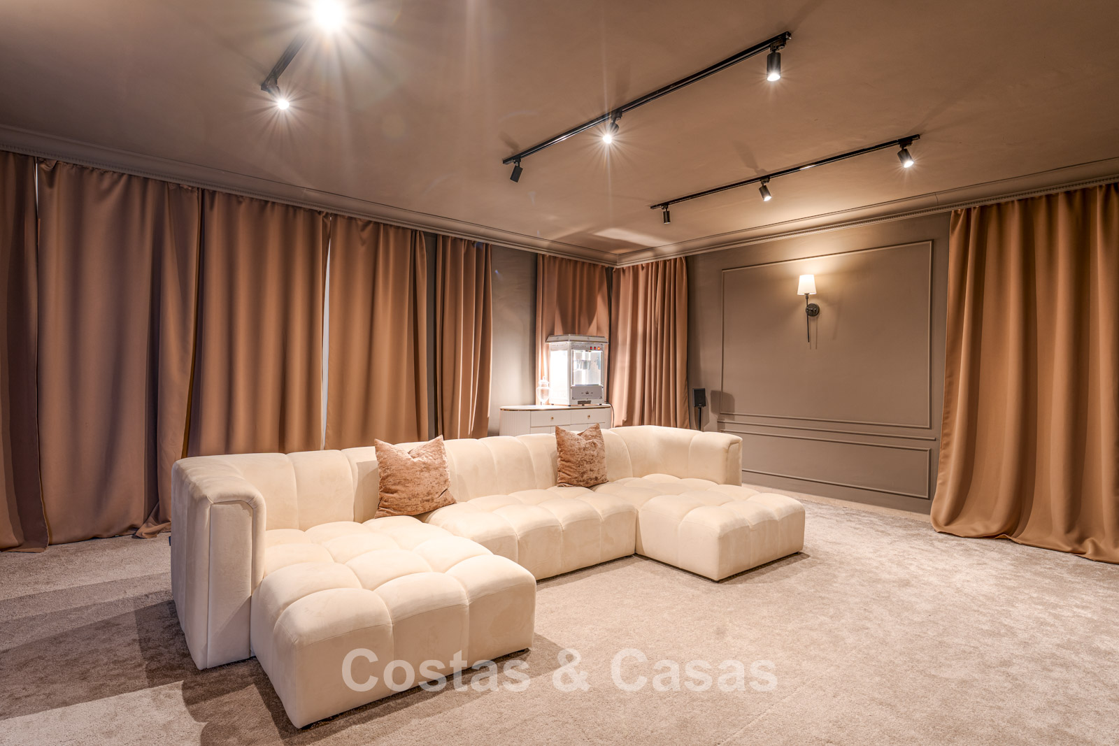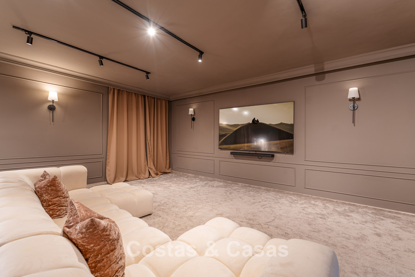 A detached villa with a refined Mediterranean feel. Completely renovated to a high standard in 2024. You enter a bright entrance hall with a cloakroom, guest toilet, and the staircase. The villa's interior exudes modern elegance and Scandinavian refinement with light, neutral, and warm accents. Tall sliding windows with recessed frames create a seamless connection to the terrace, garden, and pool, typical of Mediterranean and contemporary luxury architecture. Open-plan living space. The living room boasts a double-height ceiling and includes a TV lounge by the fireplace. A Swedish designer kitchen with high-quality Gaggenau appliances and a central island with seating. Adjacent is a breakfast nook. A second stylish dining area, complete with a wine cooler. Six bedrooms, four bathrooms, and a separate guest toilet. A practical office space. A stylish home cinema with a popcorn machine. A herringbone parquet floor. A fitted laundry room with a Samsung washer and dryer. Storage. Garage for one car.