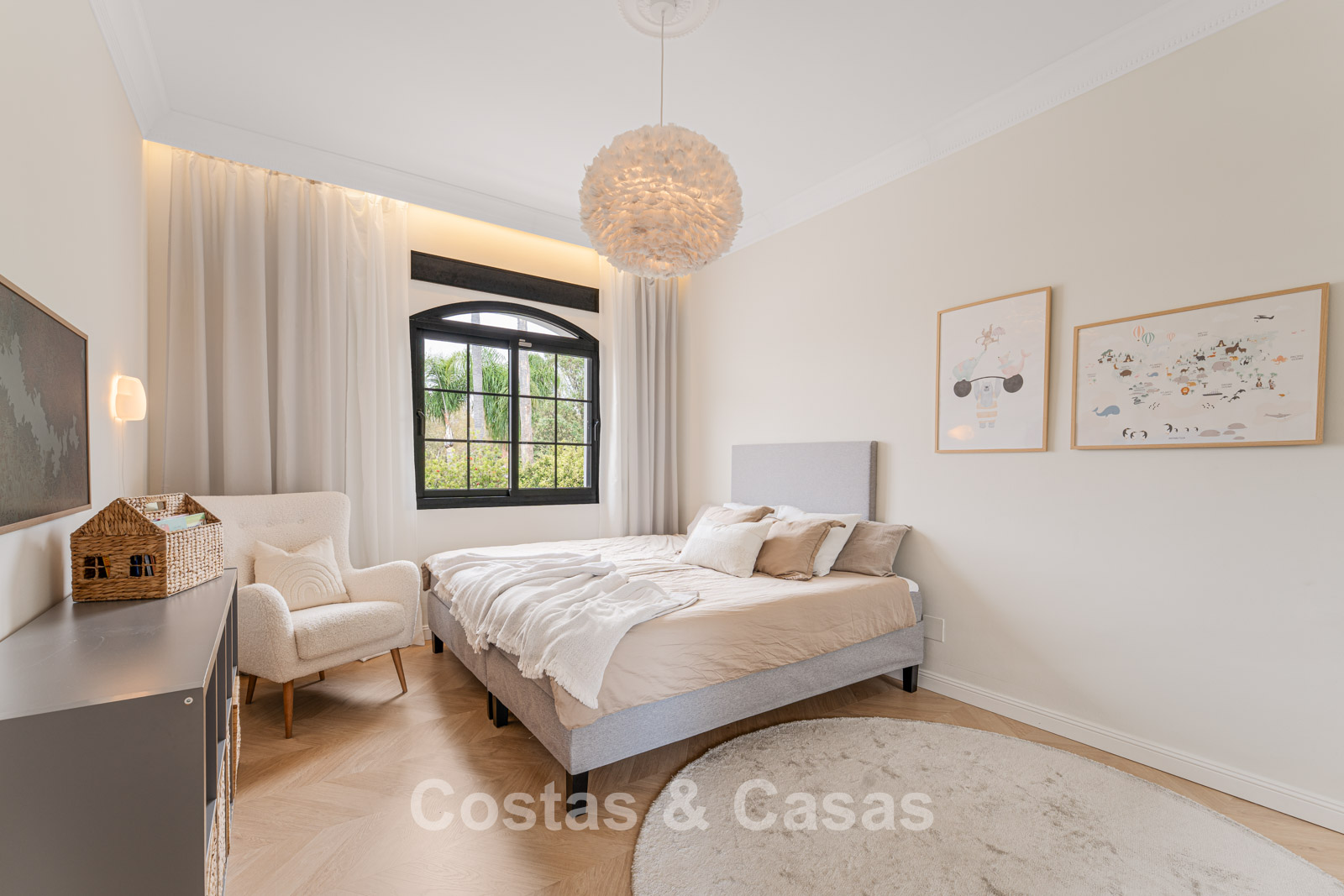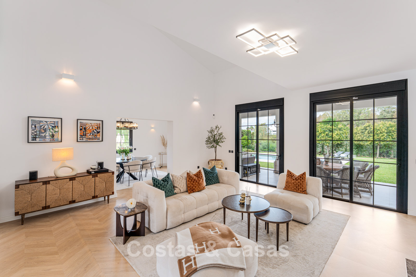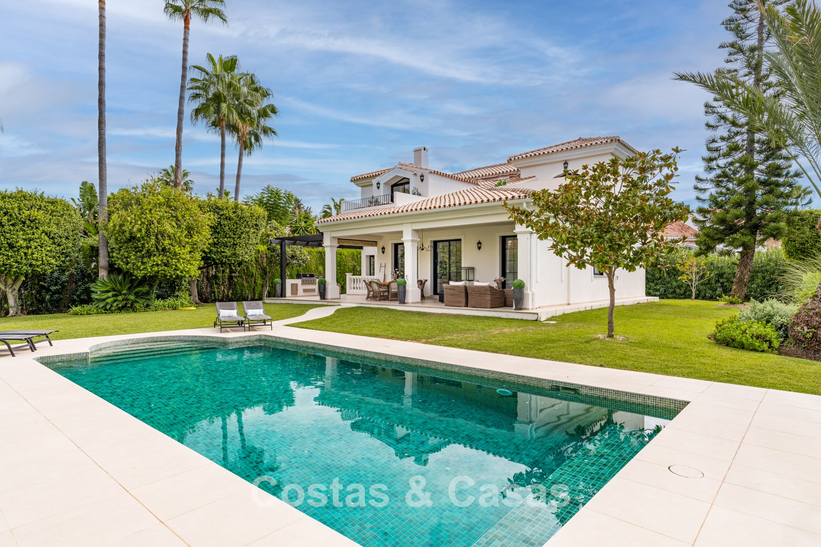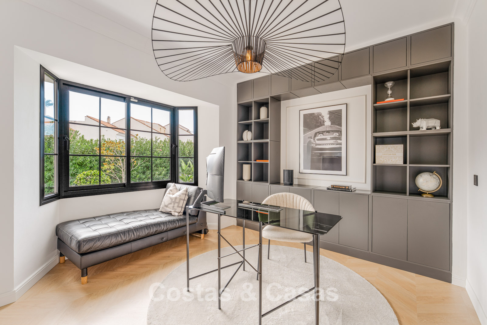 A detached villa with a refined Mediterranean feel. Completely renovated to a high standard in 2024. You enter a bright entrance hall with a cloakroom, guest toilet, and the staircase. The villa's interior exudes modern elegance and Scandinavian refinement with light, neutral, and warm accents. Tall sliding windows with recessed frames create a seamless connection to the terrace, garden, and pool, typical of Mediterranean and contemporary luxury architecture. Open-plan living space. The living room boasts a double-height ceiling and includes a TV lounge by the fireplace. A Swedish designer kitchen with high-quality Gaggenau appliances and a central island with seating. Adjacent is a breakfast nook. A second stylish dining area, complete with a wine cooler. Six bedrooms, four bathrooms, and a separate guest toilet. A practical office space. A stylish home cinema with a popcorn machine. A herringbone parquet floor. A fitted laundry room with a Samsung washer and dryer. Storage. Garage for one car.