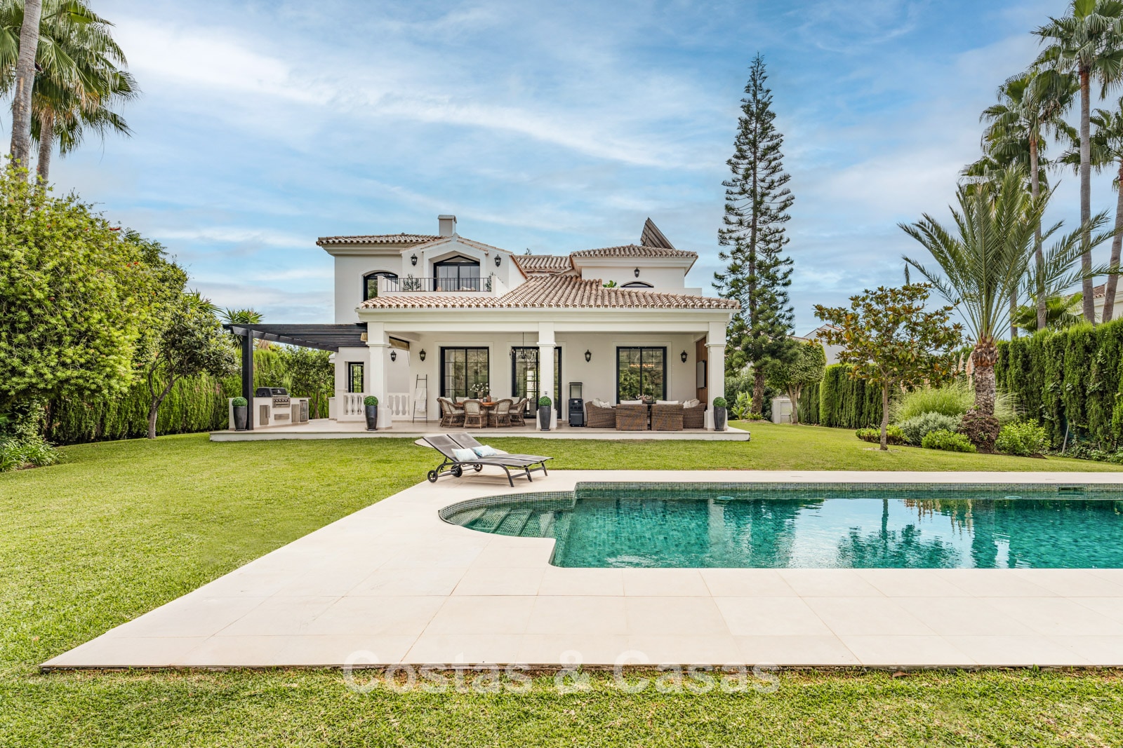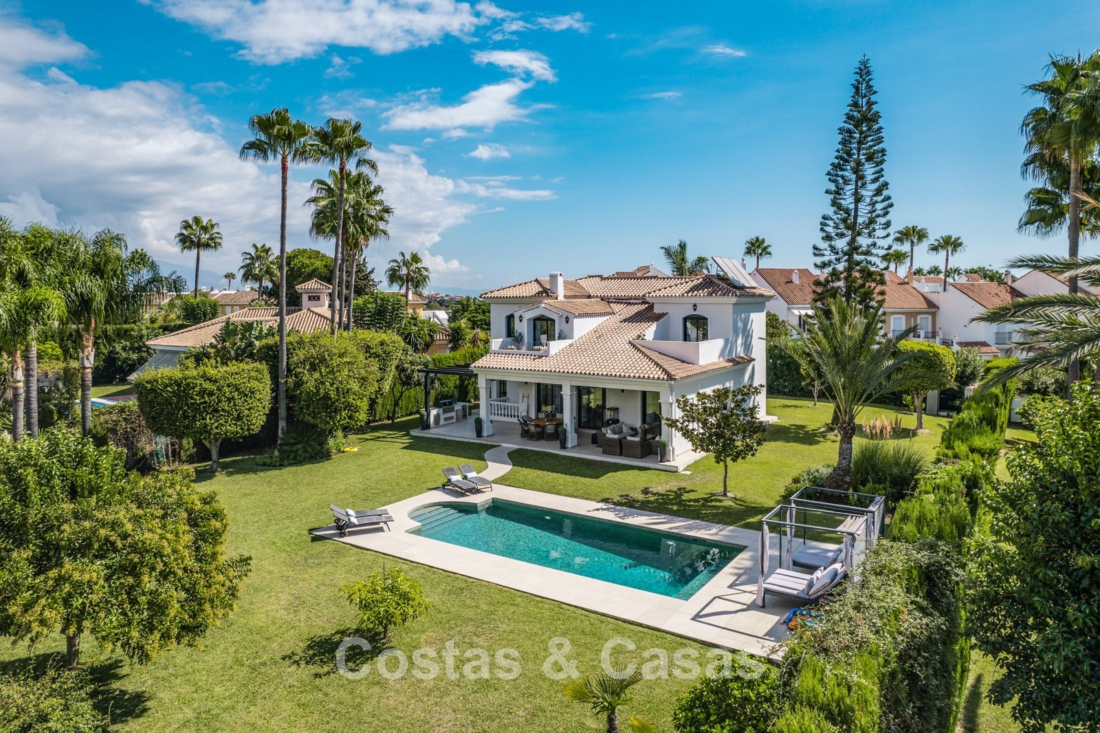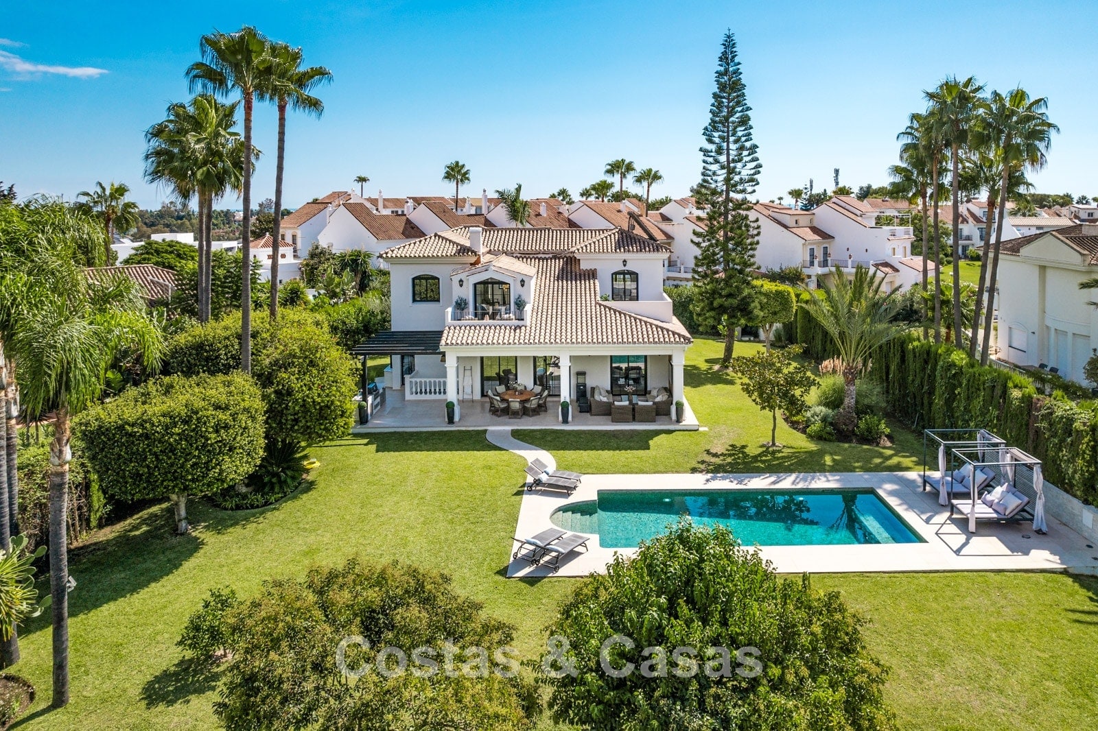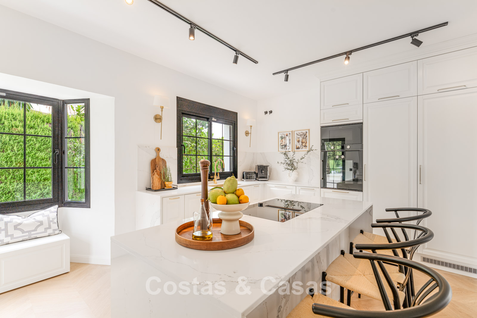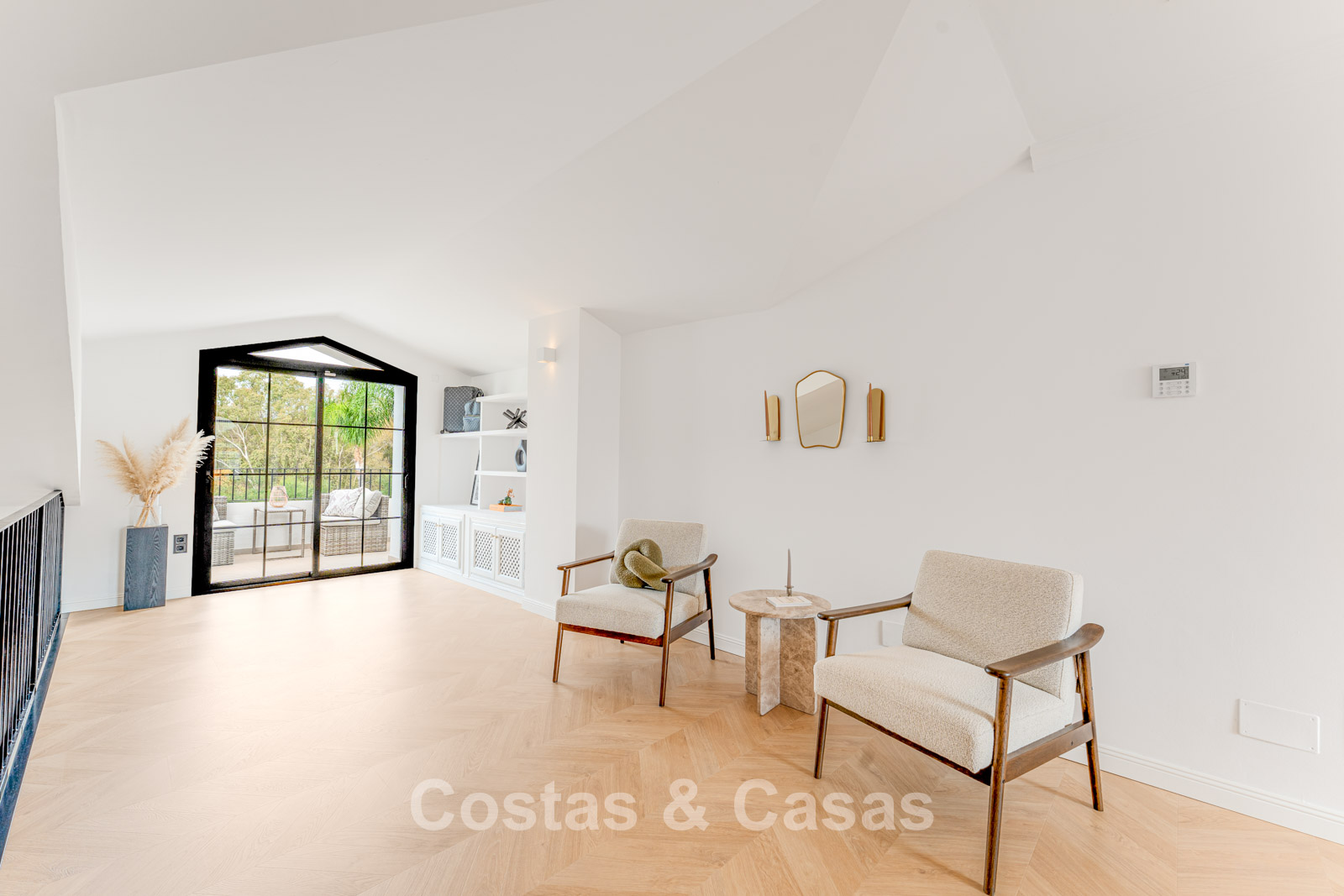 A detached villa with a refined Mediterranean feel. Completely renovated to a high standard in 2024. You enter a bright entrance hall with a cloakroom, guest toilet, and the staircase. The villa's interior exudes modern elegance and Scandinavian refinement with light, neutral, and warm accents. Tall sliding windows with recessed frames create a seamless connection to the terrace, garden, and pool, typical of Mediterranean and contemporary luxury architecture. Open-plan living space. The living room boasts a double-height ceiling and includes a TV lounge by the fireplace. A Swedish designer kitchen with high-quality Gaggenau appliances and a central island with seating. Adjacent is a breakfast nook. A second stylish dining area, complete with a wine cooler. Six bedrooms, four bathrooms, and a separate guest toilet. A practical office space. A stylish home cinema with a popcorn machine. A herringbone parquet floor. A fitted laundry room with a Samsung washer and dryer. Storage. Garage for one car.