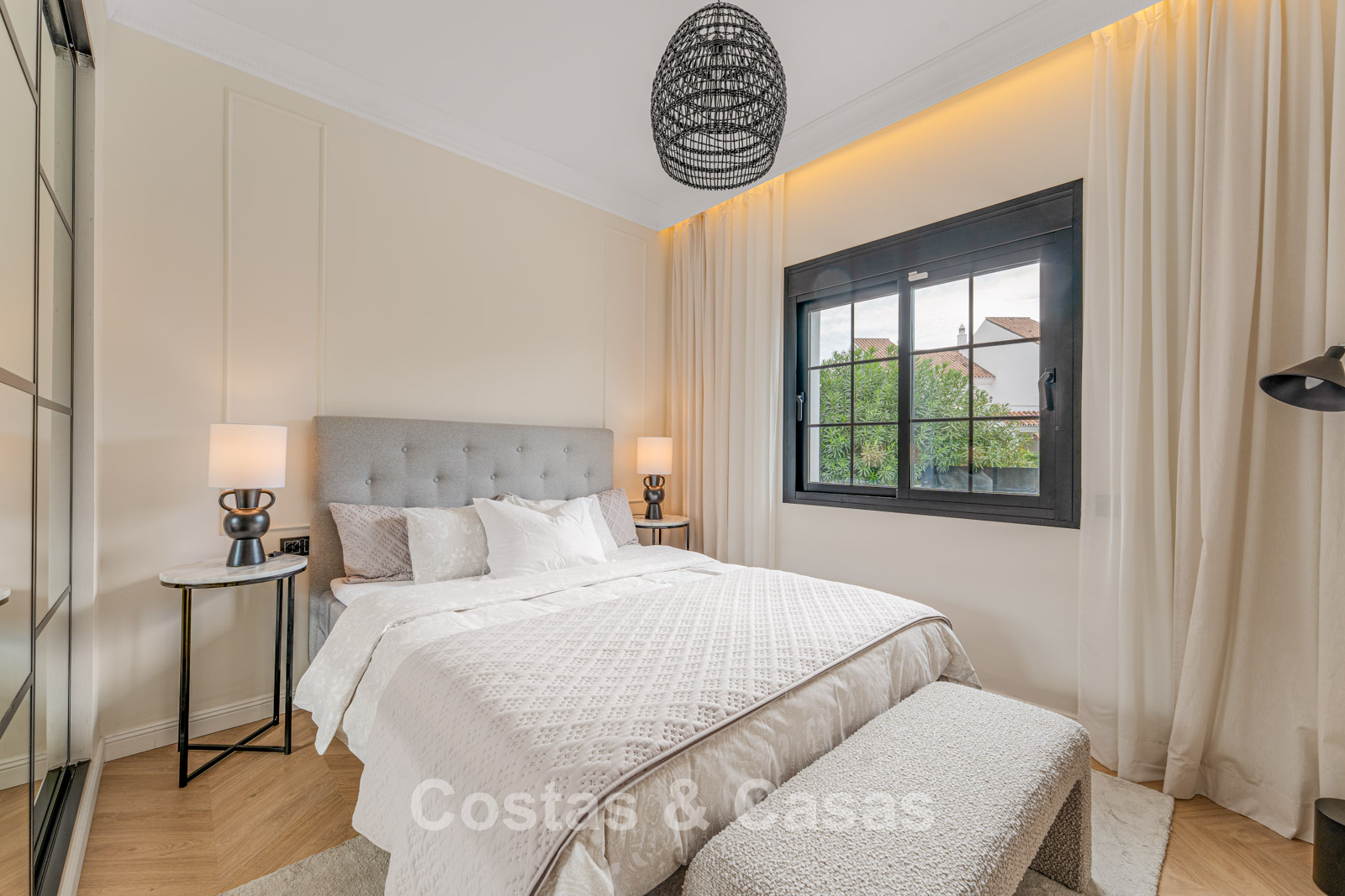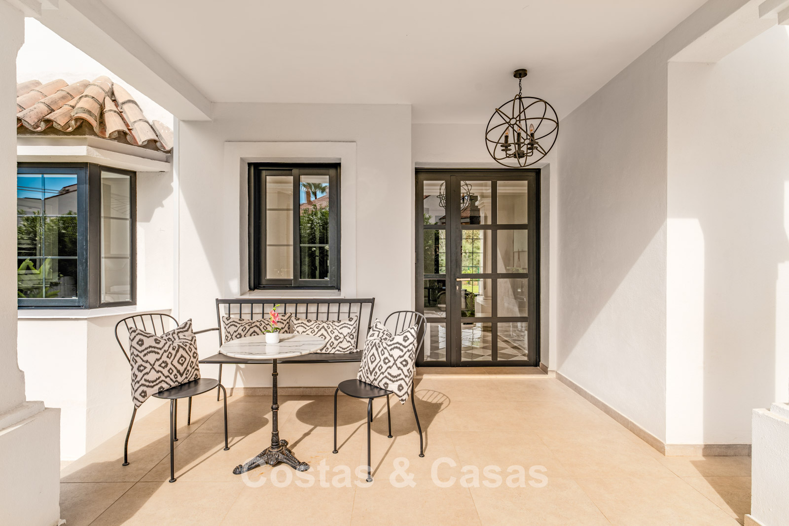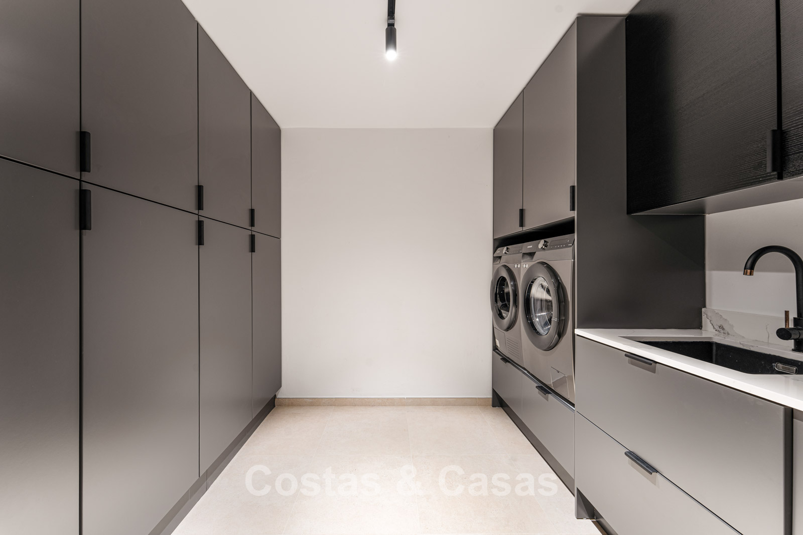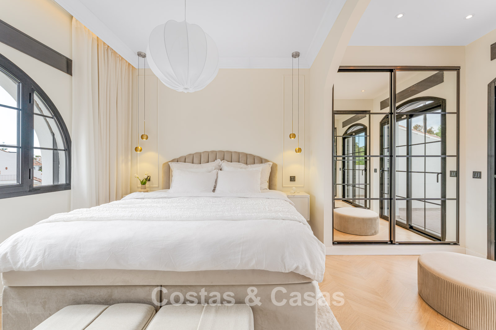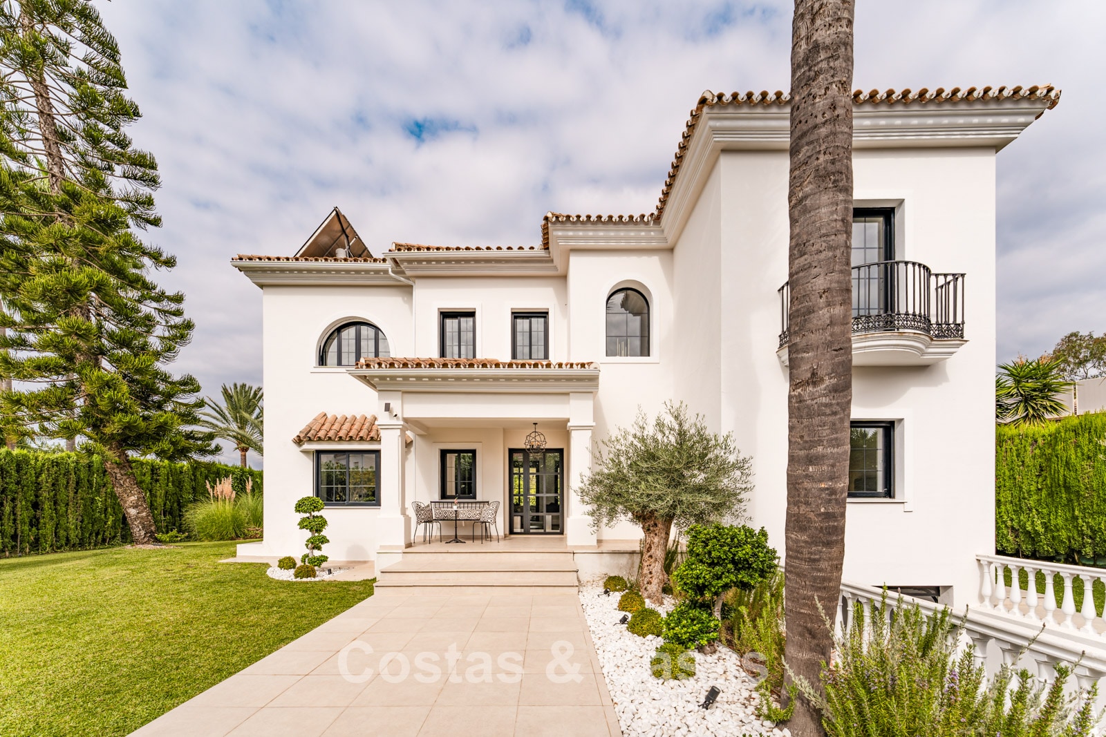 A detached villa with a refined Mediterranean feel. Completely renovated to a high standard in 2024. You enter a bright entrance hall with a cloakroom, guest toilet, and the staircase. The villa's interior exudes modern elegance and Scandinavian refinement with light, neutral, and warm accents. Tall sliding windows with recessed frames create a seamless connection to the terrace, garden, and pool, typical of Mediterranean and contemporary luxury architecture. Open-plan living space. The living room boasts a double-height ceiling and includes a TV lounge by the fireplace. A Swedish designer kitchen with high-quality Gaggenau appliances and a central island with seating. Adjacent is a breakfast nook. A second stylish dining area, complete with a wine cooler. Six bedrooms, four bathrooms, and a separate guest toilet. A practical office space. A stylish home cinema with a popcorn machine. A herringbone parquet floor. A fitted laundry room with a Samsung washer and dryer. Storage. Garage for one car.