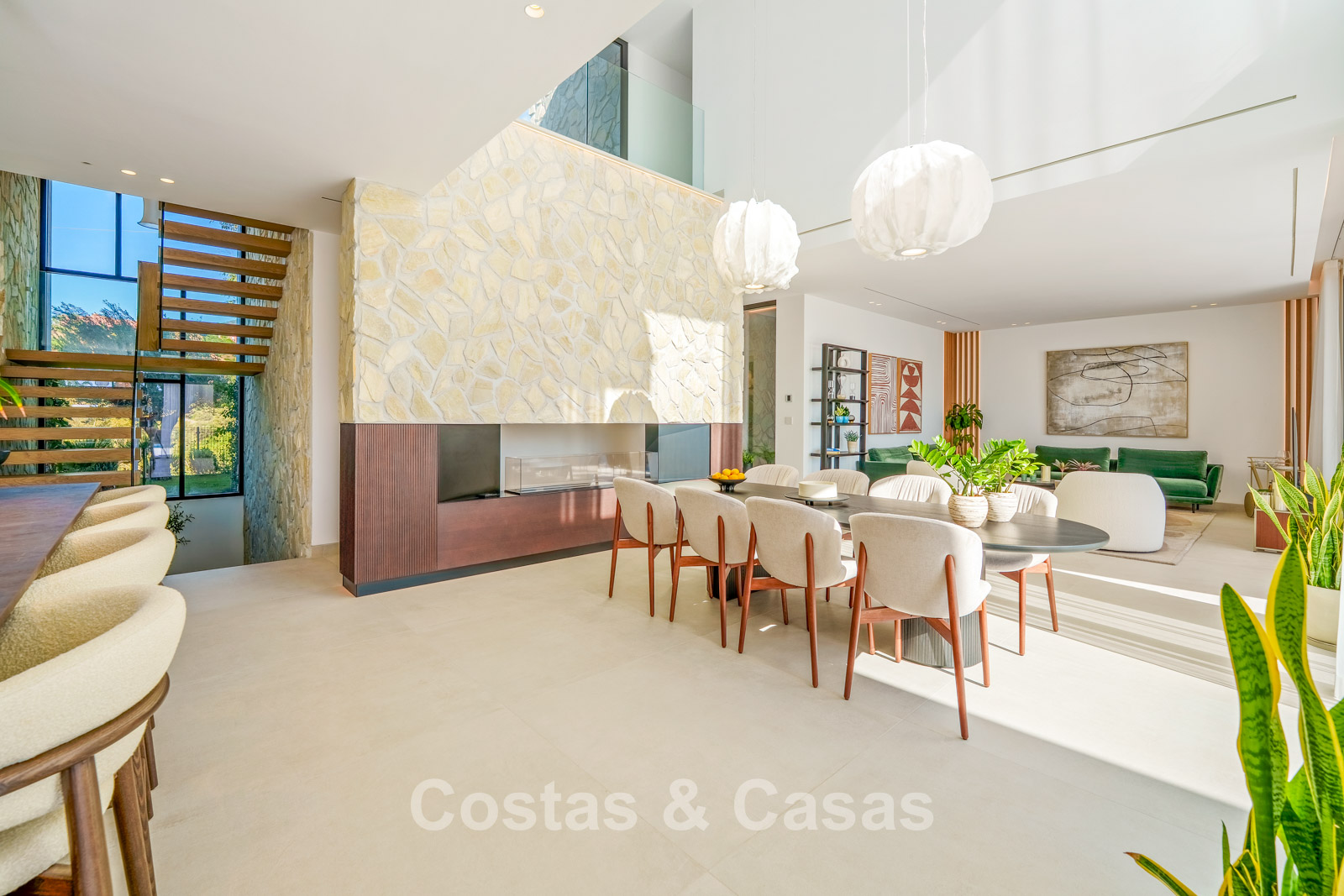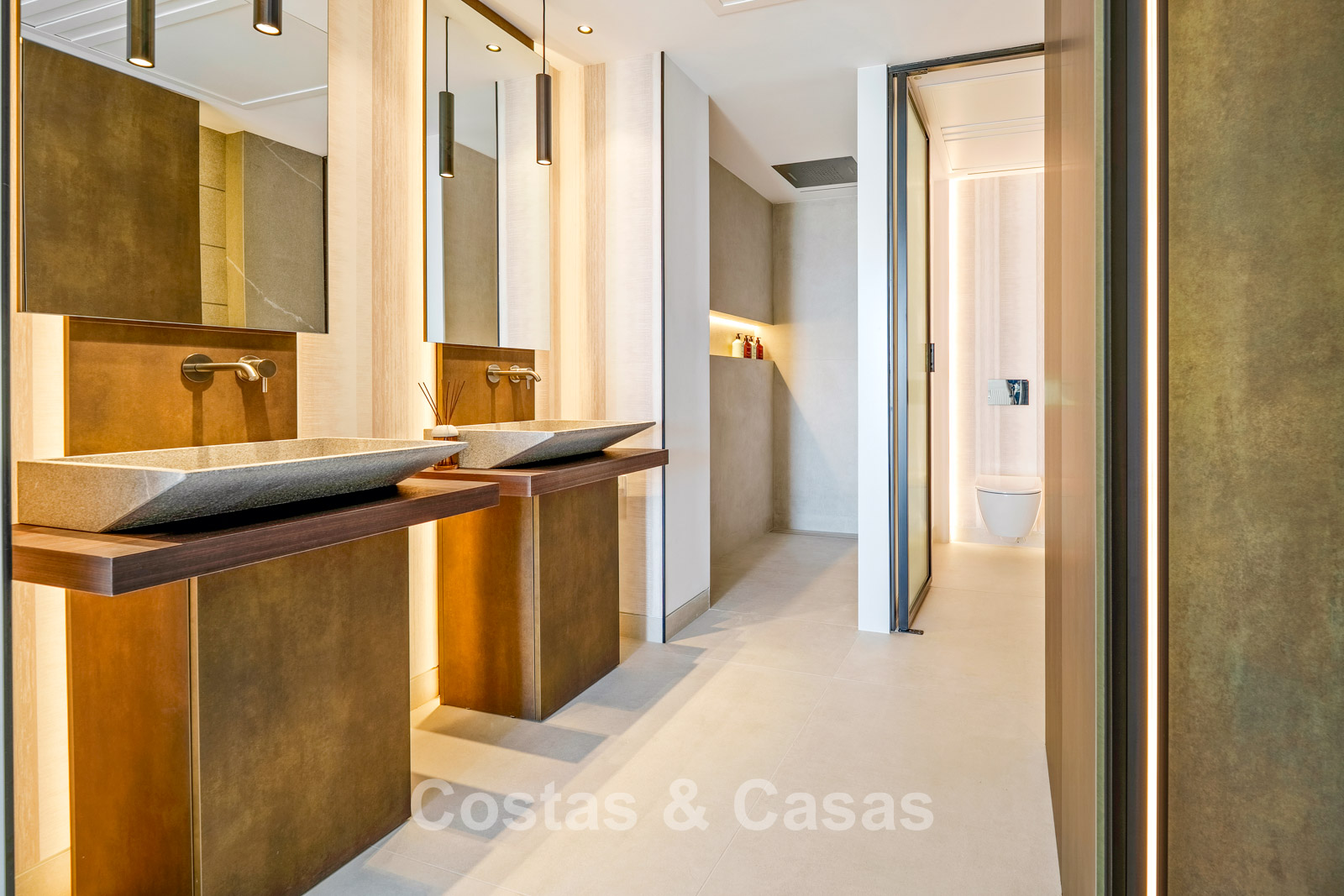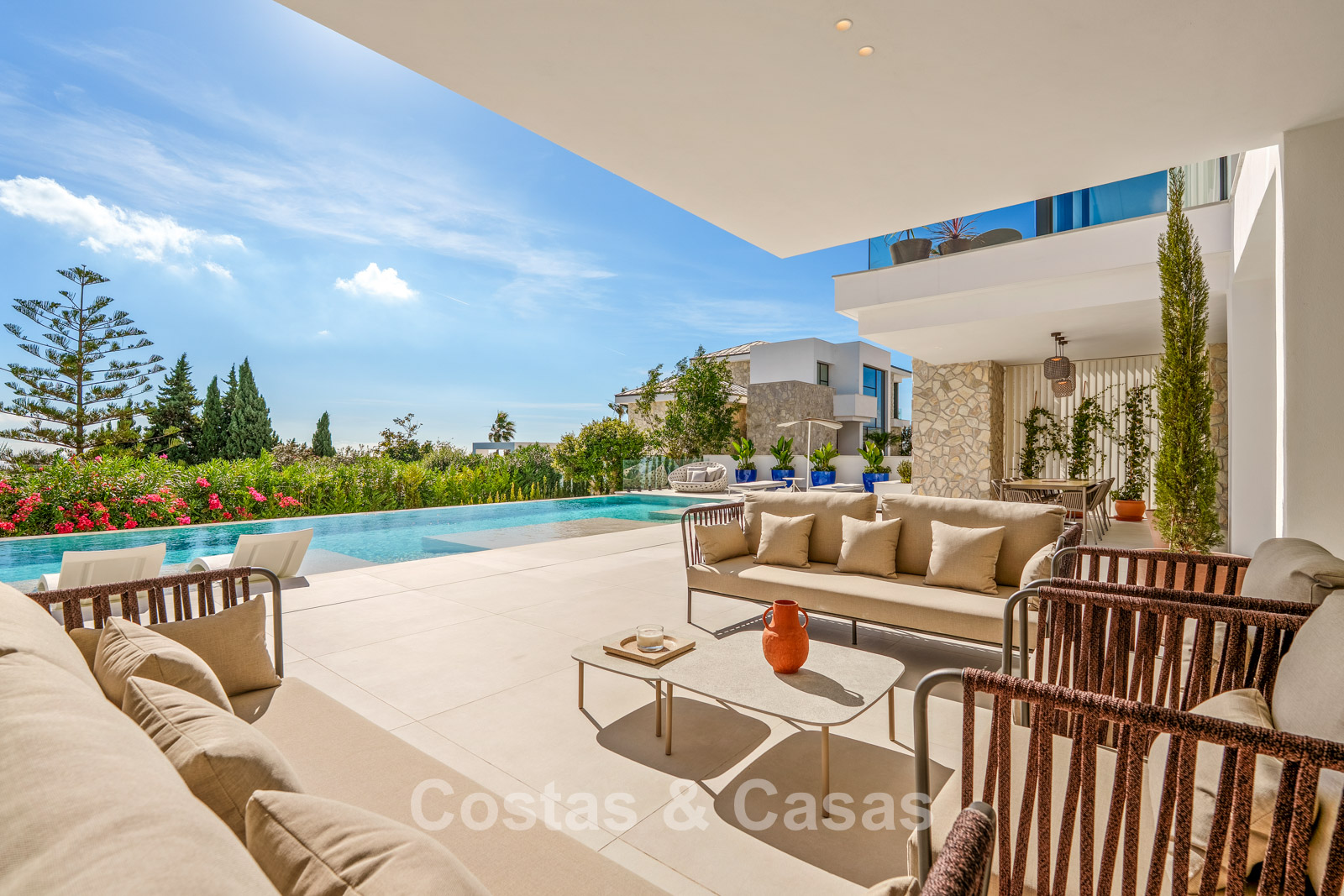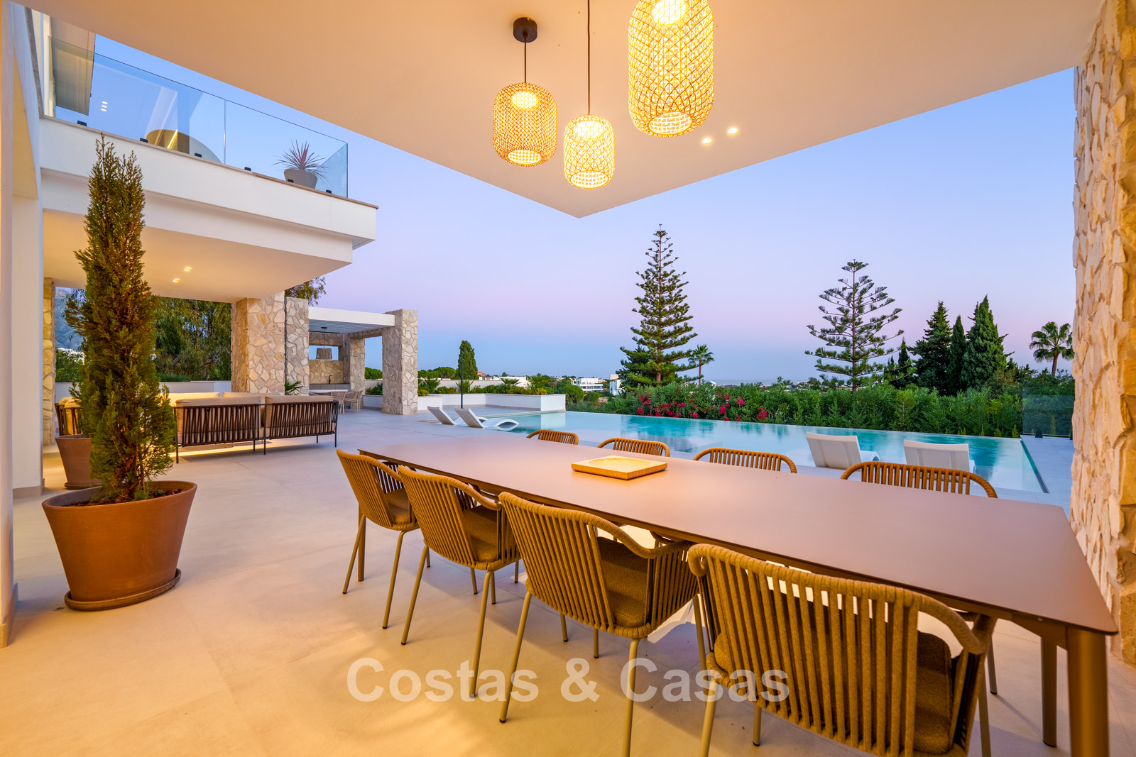 Fenced plot in an elevated position with panoramic views. Elegantly landscaped outdoor areas with various open and covered terraces, including an outdoor kitchen with al fresco dining area. The spectacular infinity pool is the centrepiece of the outdoor experience, surrounded by lounge areas inviting relaxation. Facing southeast. Fantastic views of the iconic La Concha mountain and the Mediterranean Sea.