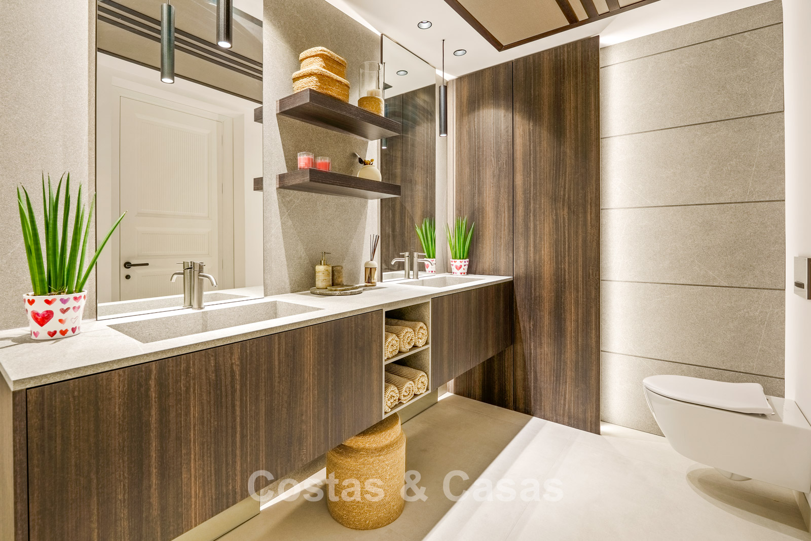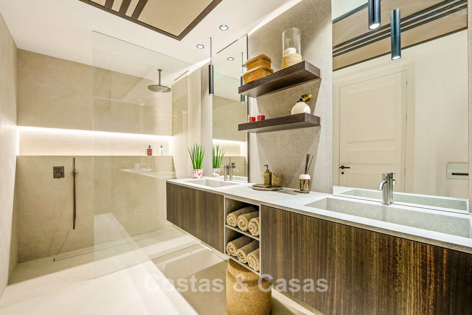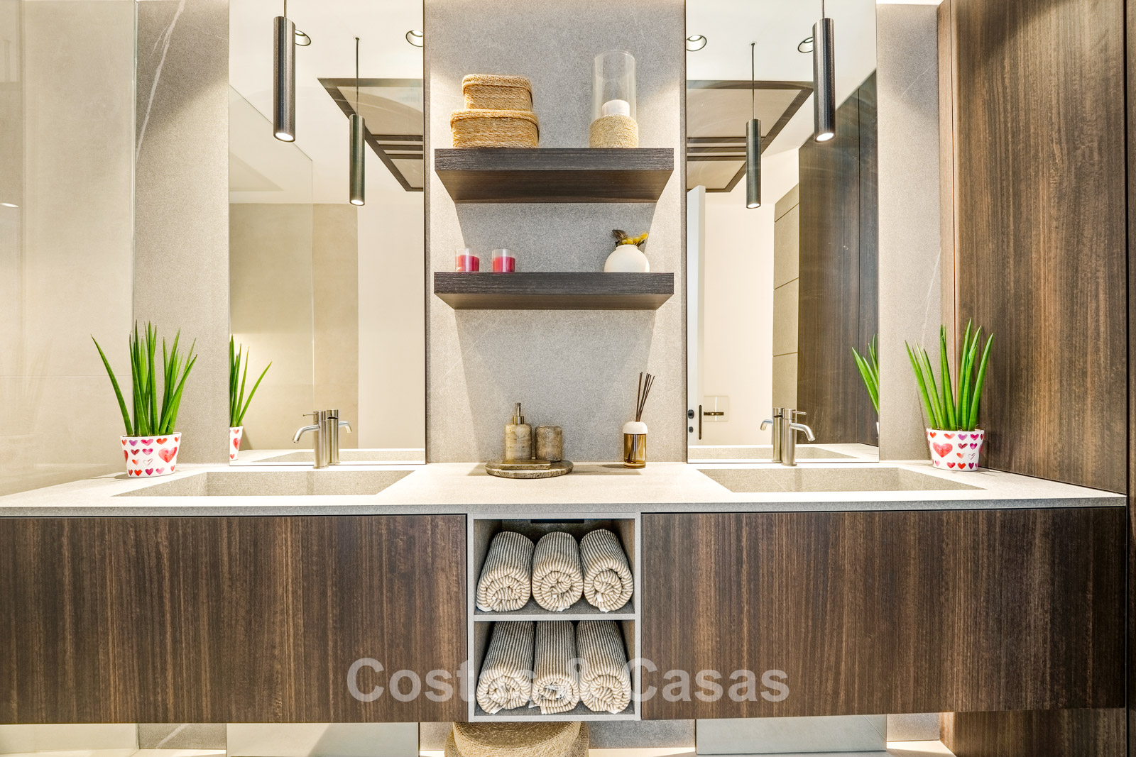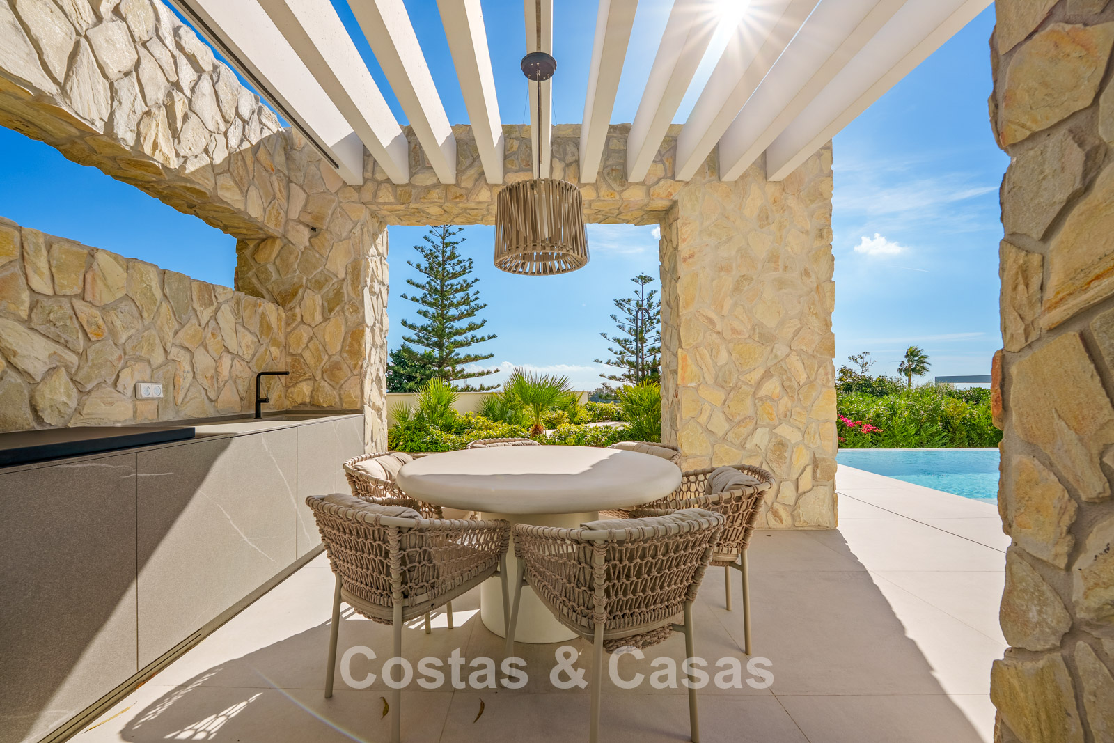 Fenced plot in an elevated position with panoramic views. Elegantly landscaped outdoor areas with various open and covered terraces, including an outdoor kitchen with al fresco dining area. The spectacular infinity pool is the centrepiece of the outdoor experience, surrounded by lounge areas inviting relaxation. Facing southeast. Fantastic views of the iconic La Concha mountain and the Mediterranean Sea.