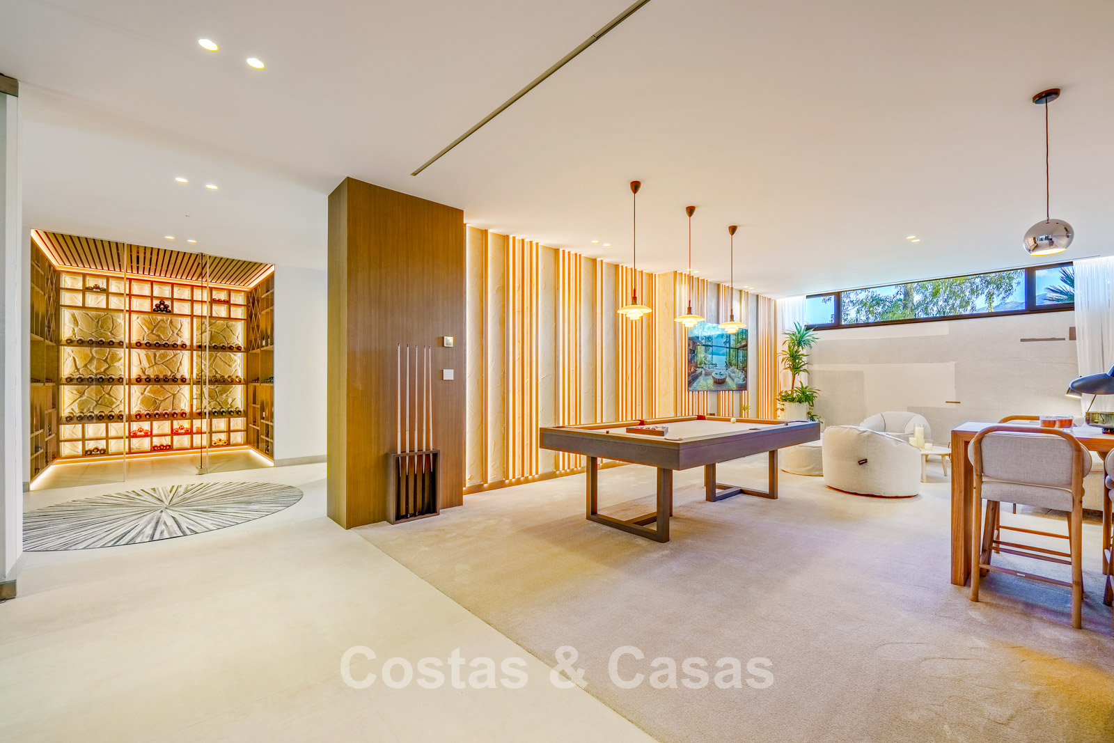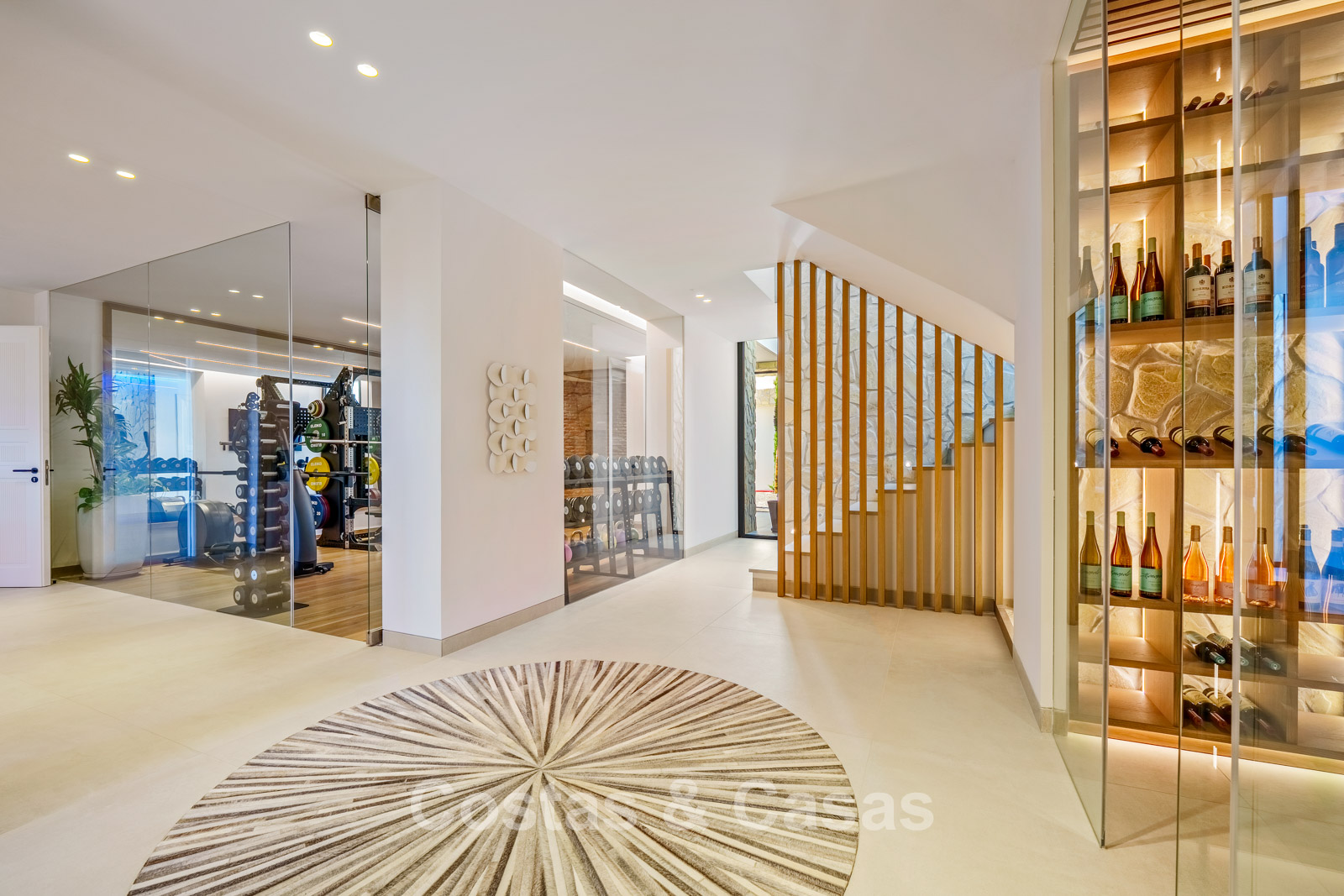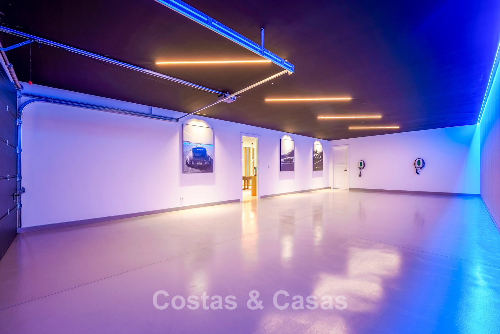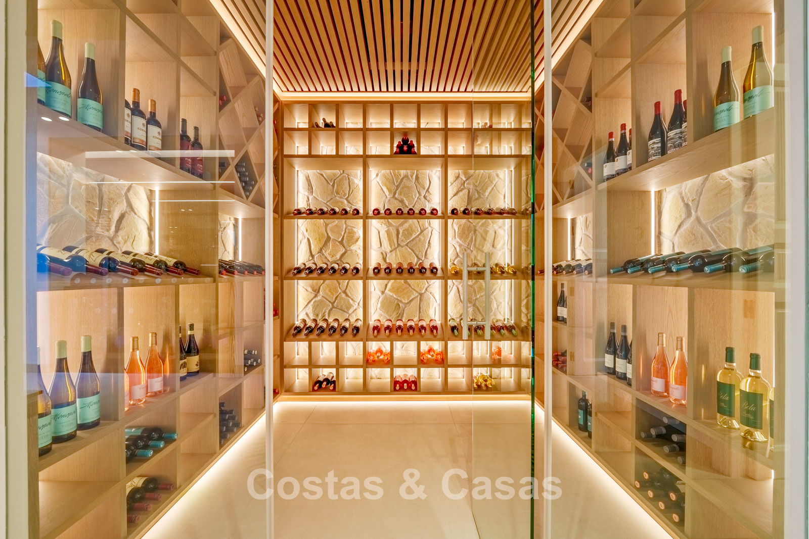 The design reflects a contemporary aesthetic where pure lines and natural materials complement each other. Designed with high-quality materials and contemporary architecture. Indoor and outdoor spaces blend seamlessly thanks to floor-to-ceiling sliding doors that bring in light and nature. The sleek, trendy interior radiates chic luxury, featuring refined materials and elegant accents. A generous living area with a partially double-height ceiling combines a stylish living room and dining area. The custom-made kitchen is fully equipped with top appliances and features a cooking island with breakfast seating. 5 bedrooms, 4 bathrooms, all finished with the highest attention to detail. Master suite with private terrace, dressing room and exceptional views. On the basement level, there is a relaxation area with a chill-out space, complete with a bar. Fully equipped gym. Climate-controlled wine cellar. Equipped laundry room with Siemens appliances. Additional storage. Technical room. High-quality tiled flooring. Garage for 4 cars equipped with an electric vehicle charging point.