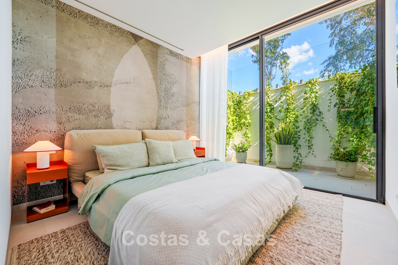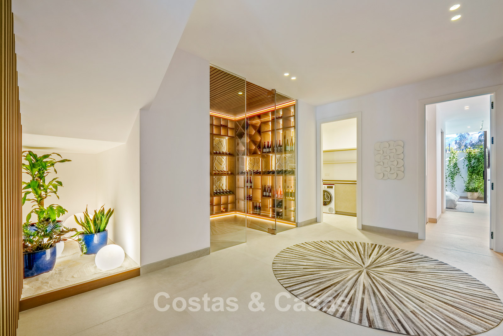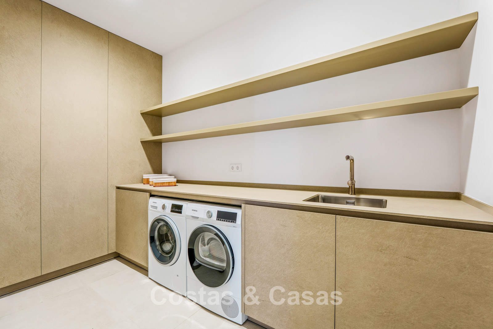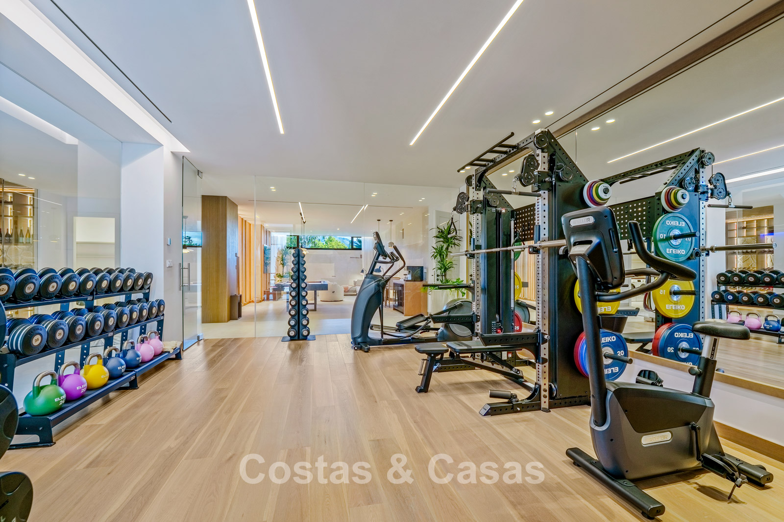 The design reflects a contemporary aesthetic where pure lines and natural materials complement each other. Designed with high-quality materials and contemporary architecture. Indoor and outdoor spaces blend seamlessly thanks to floor-to-ceiling sliding doors that bring in light and nature. The sleek, trendy interior radiates chic luxury, featuring refined materials and elegant accents. A generous living area with a partially double-height ceiling combines a stylish living room and dining area. The custom-made kitchen is fully equipped with top appliances and features a cooking island with breakfast seating. 5 bedrooms, 4 bathrooms, all finished with the highest attention to detail. Master suite with private terrace, dressing room and exceptional views. On the basement level, there is a relaxation area with a chill-out space, complete with a bar. Fully equipped gym. Climate-controlled wine cellar. Equipped laundry room with Siemens appliances. Additional storage. Technical room. High-quality tiled flooring. Garage for 4 cars equipped with an electric vehicle charging point.