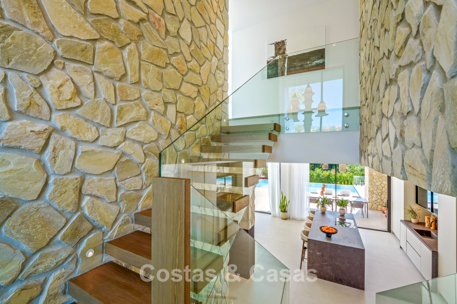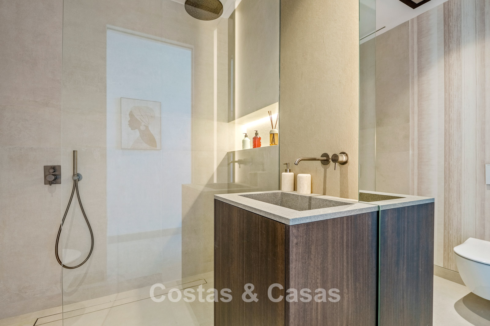 Other features: Air conditioning for cooling and heating. Modern open fireplace. Double glazing. Glass balustrades around the terraces. Custom-built fitted wardrobes. LED lighting indoors and outdoors. Outdoor shower.