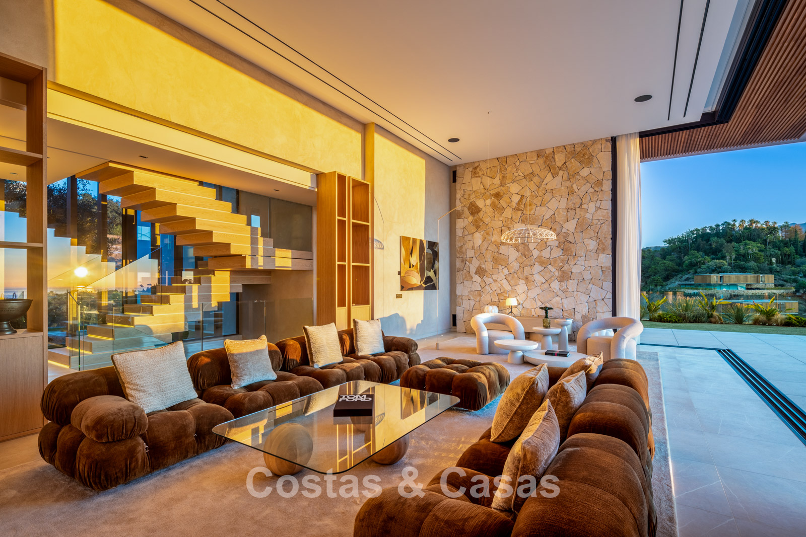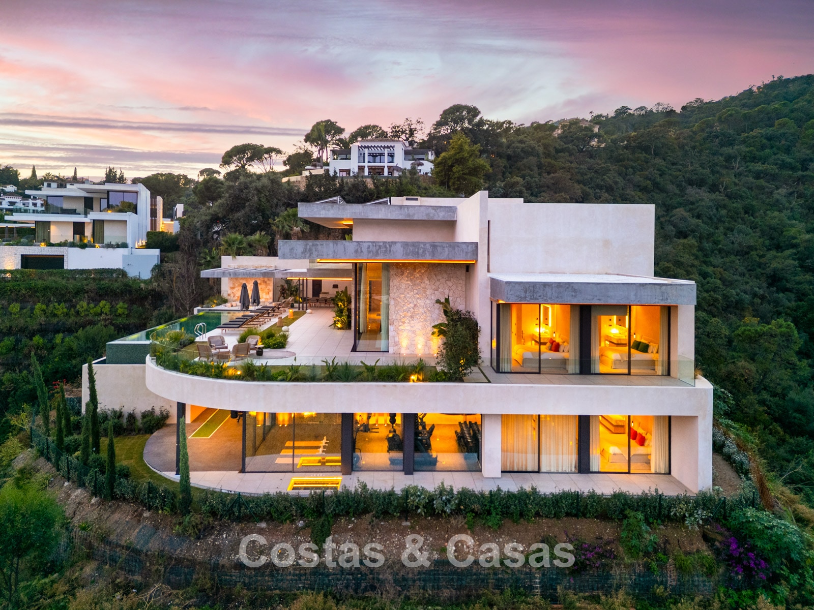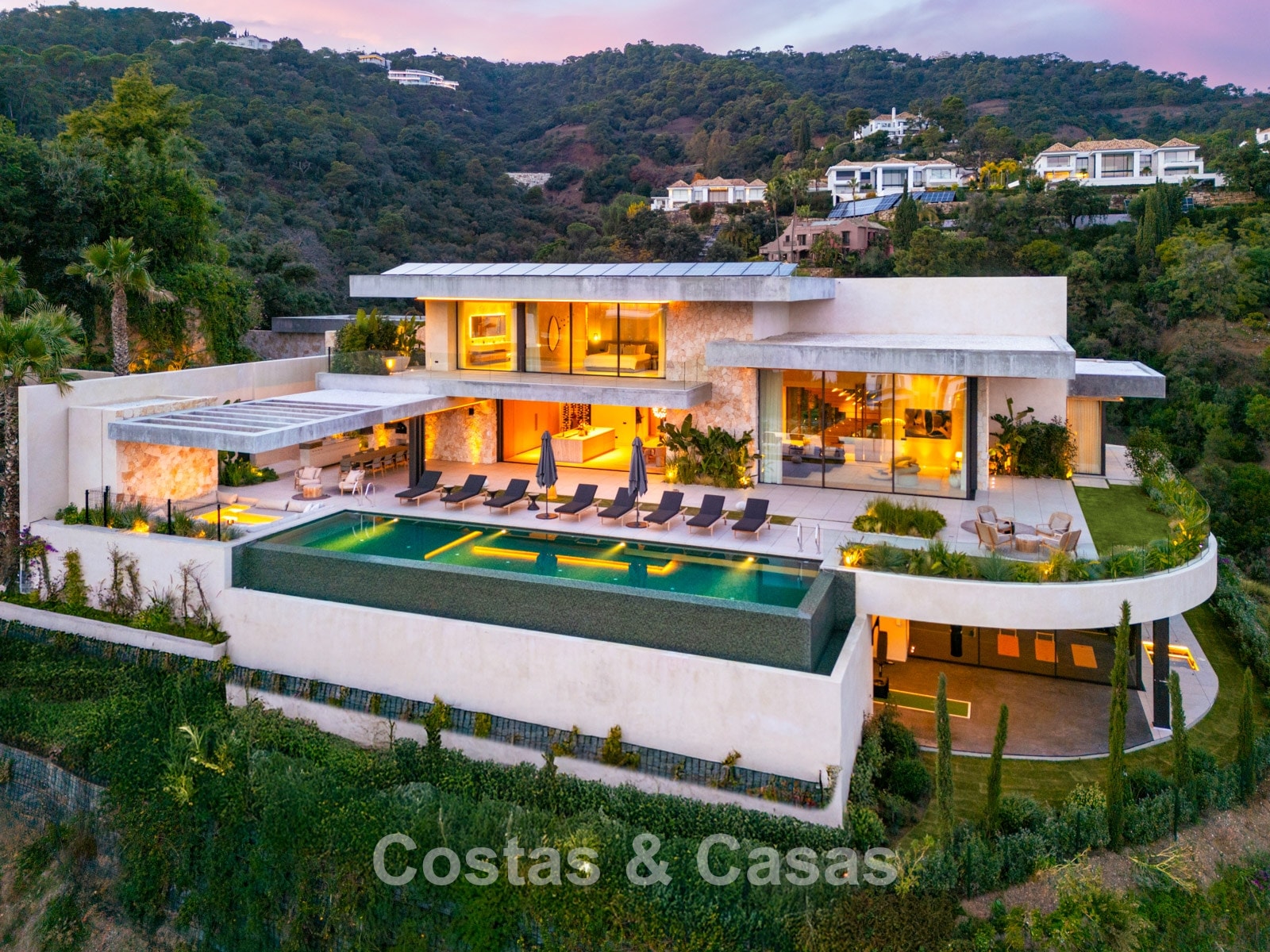 Additional features: Private lift. Air conditioning for cooling and heating. Modern open fireplace. Built-in bespoke wardrobes. Double glazing. Smart Home System. LED lighting inside and out. Glass balustrades around terraces. Solar panels. Automatic irrigation system.