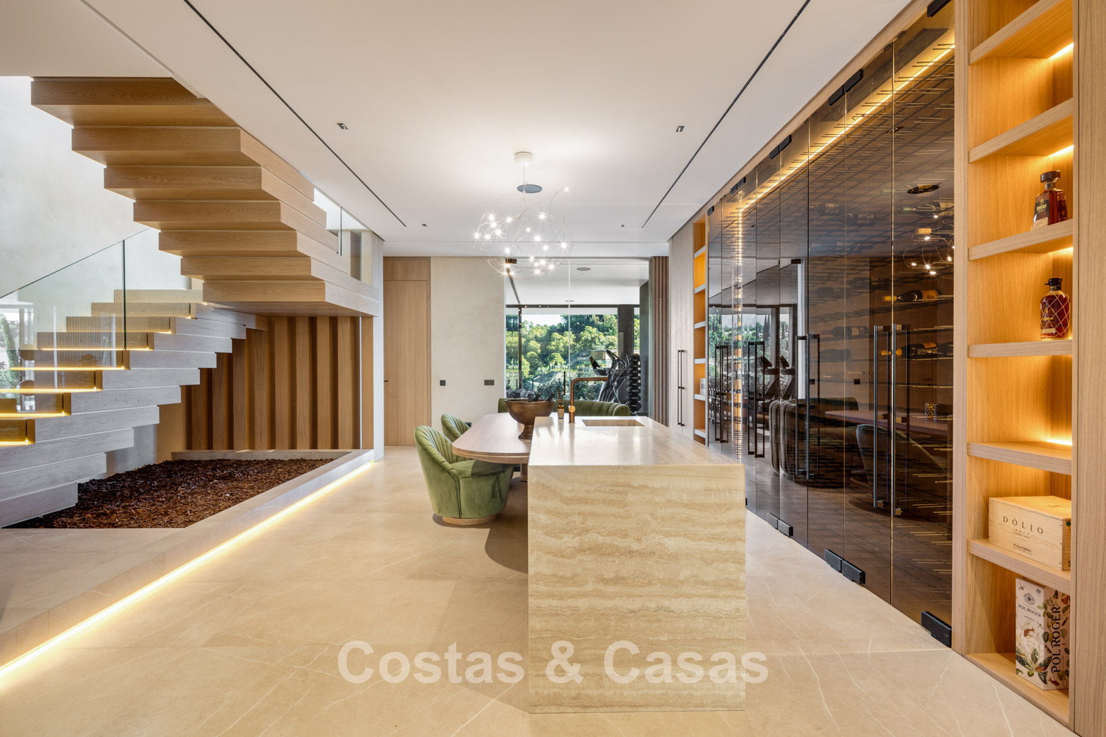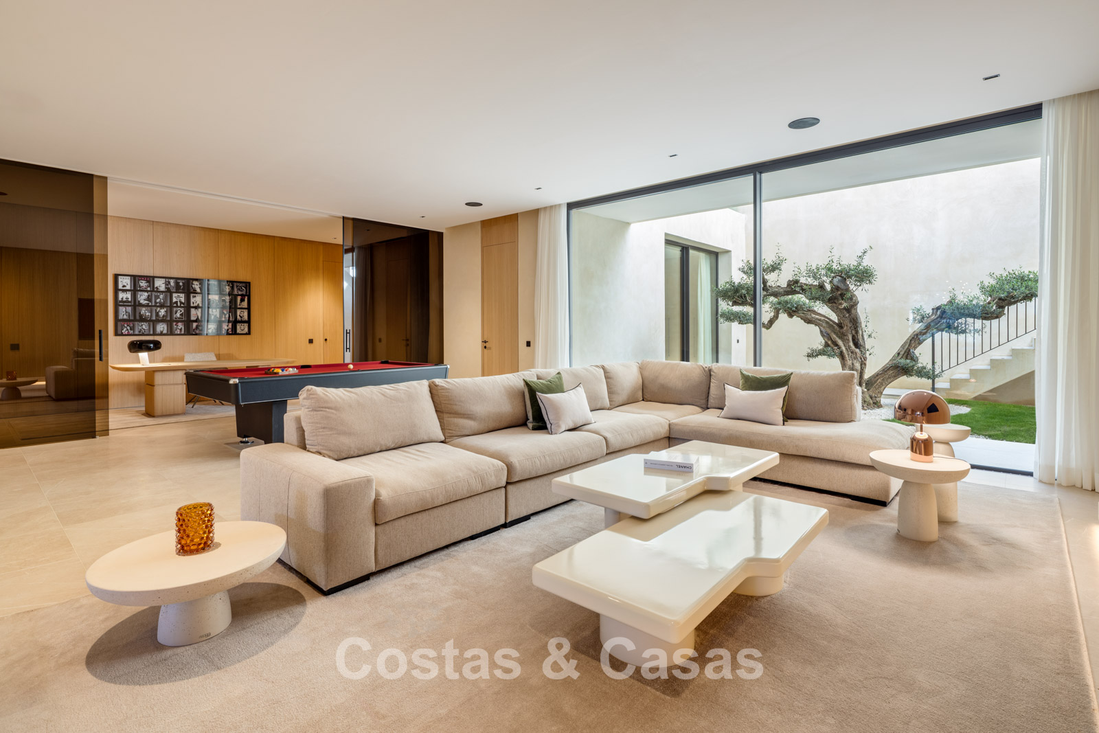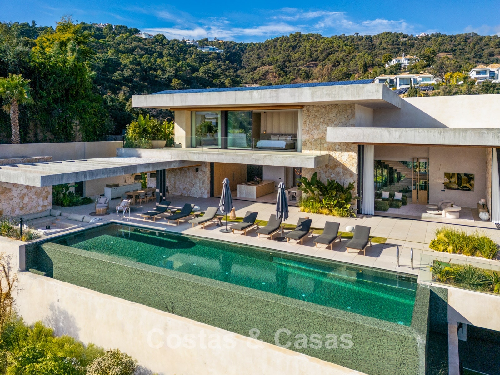 The villa combines high-end minimalist design with warm, natural accents, creating a luxurious living environment that harmonises seamlessly with the surrounding nature. The modern architecture stands out for its generous openness, focusing on pure simplicity and refined functionality. Designed with exceptional craftsmanship, durable materials, and bespoke details. A long driveway leads to the entrance, flanked by a beautiful olive tree and an inviting glass door. Floor-to-ceiling sliding windows, electrically operated, provide a seamless connection to the terrace, garden, and pool, typical of Mediterranean contemporary luxury architecture. Open-plan living and dining area. Open kitchen with high-end Gaggenau appliances and central island. Integrated dining area. Adjacent fully equipped chef’s kitchen. 6 bedrooms, 6 bathrooms, and a separate guest toilet. The master suite is on the upper floor and includes a spacious dressing room, bathroom, and access to a large private terrace. The lower floor features a recreational area with TV lounge, billiards room, bar with lounge, and a climate-controlled wine cellar. 2-bedroom guest or staff apartment with private entrance. Formal office space. Loft-style home cinema. Fully equipped gym with indoor and outdoor areas. Adjacent hammam, plunge pool, and changing/bathroom facilities. Laundry room equipped with Miele appliances. High-quality porcelain flooring. Technical room. Storage rooms (more than one). Carport for 3 cars, convertible into a closed garage if desired.
