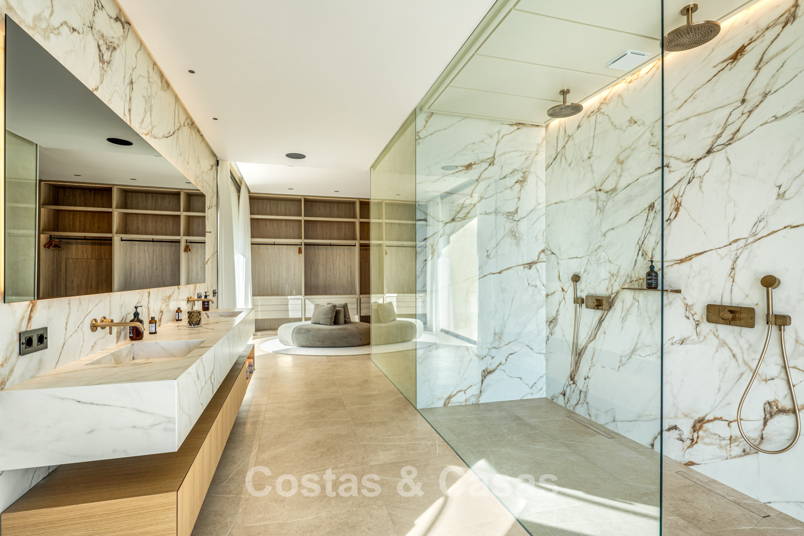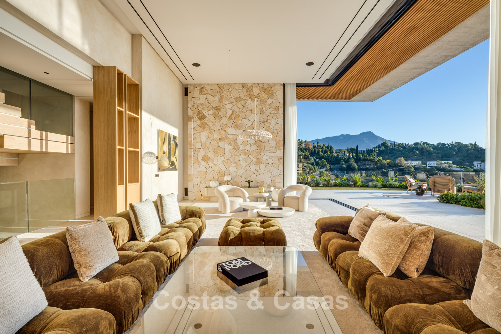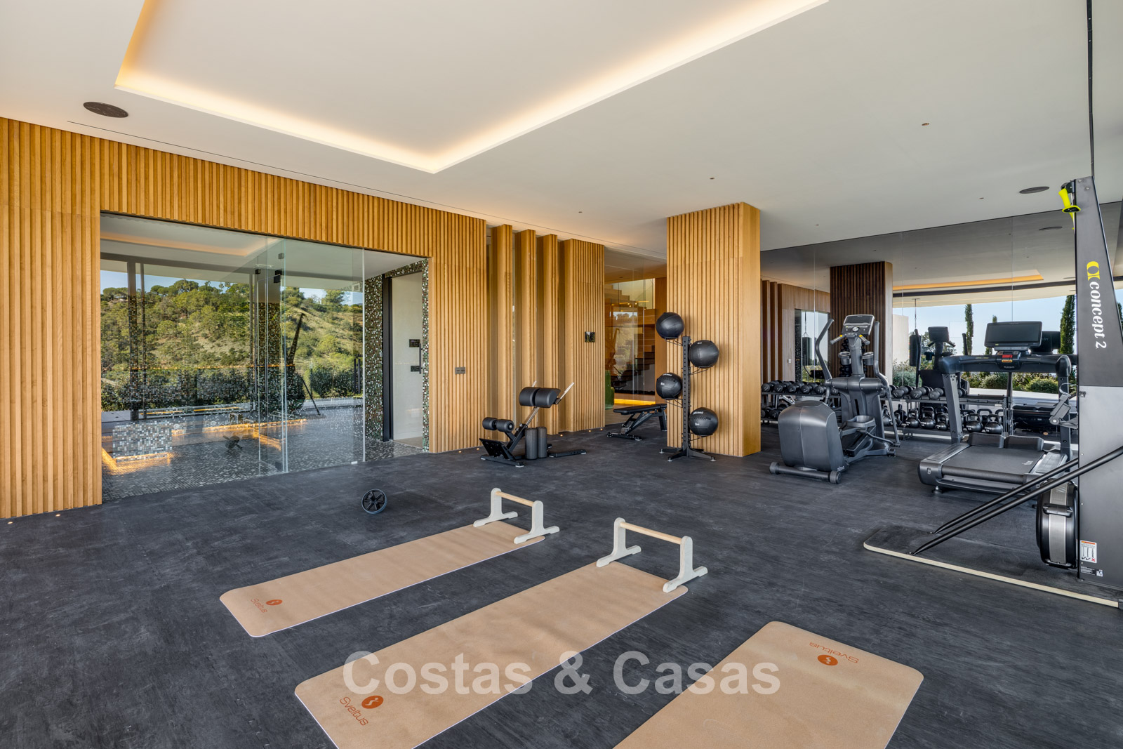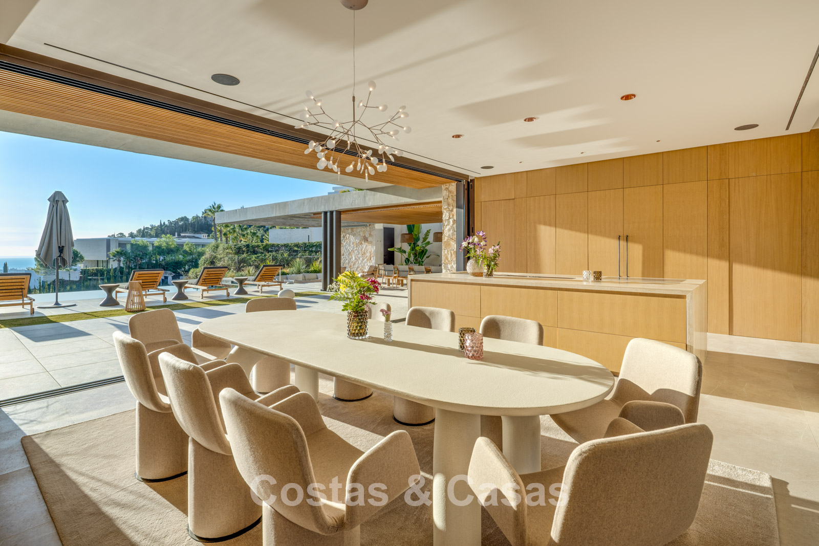 The villa combines high-end minimalist design with warm, natural accents, creating a luxurious living environment that harmonises seamlessly with the surrounding nature. The modern architecture stands out for its generous openness, focusing on pure simplicity and refined functionality. Designed with exceptional craftsmanship, durable materials, and bespoke details. A long driveway leads to the entrance, flanked by a beautiful olive tree and an inviting glass door. Floor-to-ceiling sliding windows, electrically operated, provide a seamless connection to the terrace, garden, and pool, typical of Mediterranean contemporary luxury architecture. Open-plan living and dining area. Open kitchen with high-end Gaggenau appliances and central island. Integrated dining area. Adjacent fully equipped chef’s kitchen. 6 bedrooms, 6 bathrooms, and a separate guest toilet. The master suite is on the upper floor and includes a spacious dressing room, bathroom, and access to a large private terrace. The lower floor features a recreational area with TV lounge, billiards room, bar with lounge, and a climate-controlled wine cellar. 2-bedroom guest or staff apartment with private entrance. Formal office space. Loft-style home cinema. Fully equipped gym with indoor and outdoor areas. Adjacent hammam, plunge pool, and changing/bathroom facilities. Laundry room equipped with Miele appliances. High-quality porcelain flooring. Technical room. Storage rooms (more than one). Carport for 3 cars, convertible into a closed garage if desired.