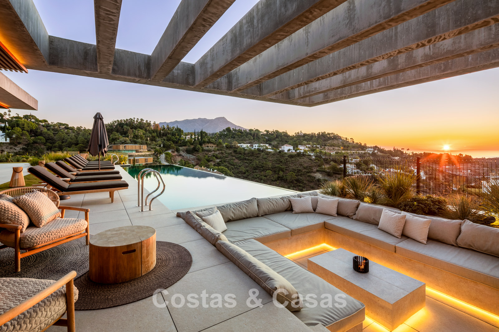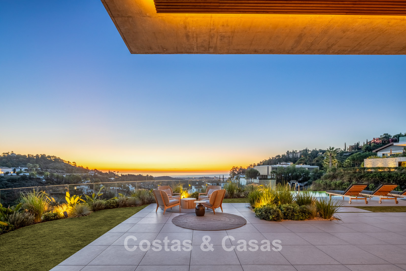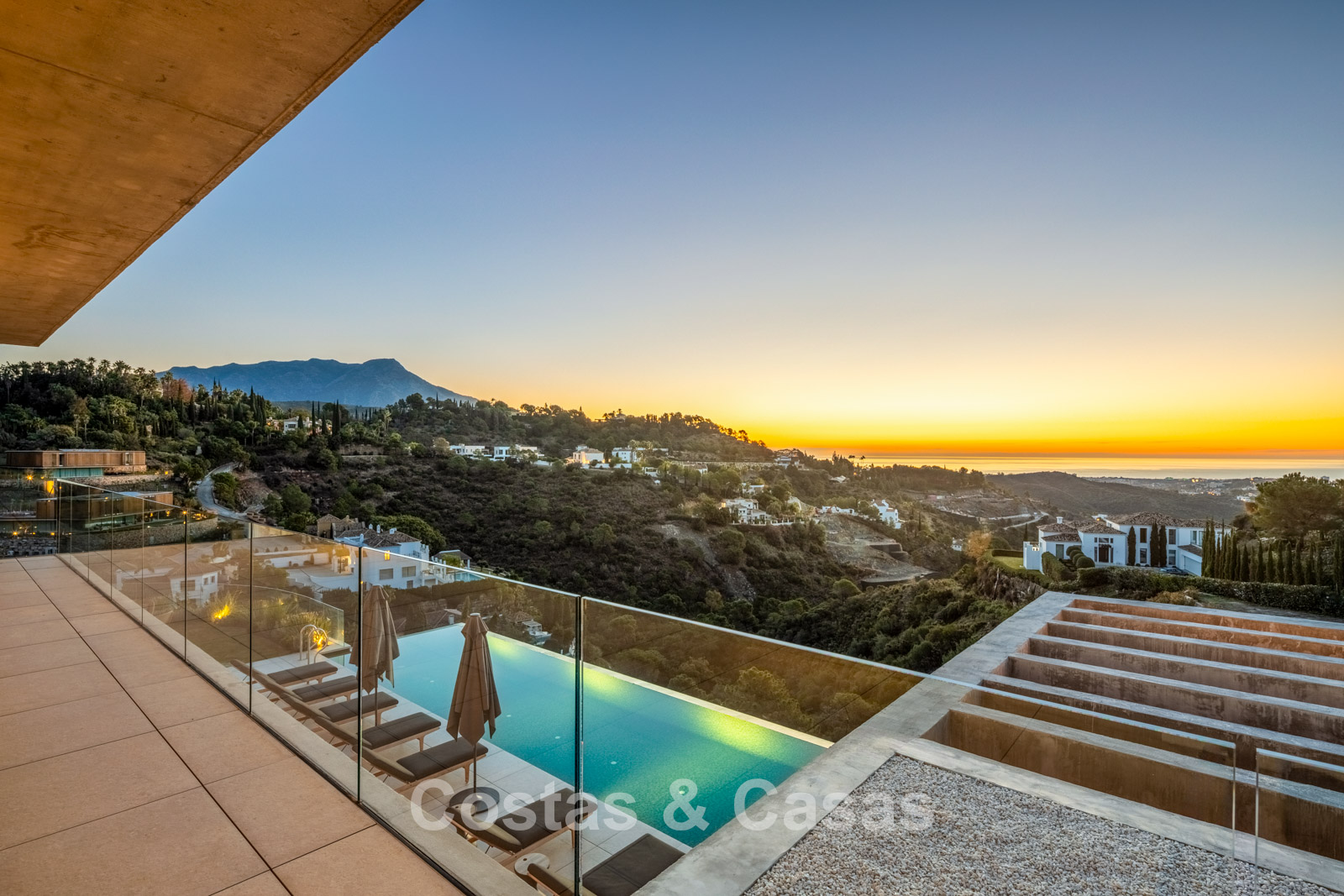 Fully fenced, generous plot on an elevated position. Beautifully landscaped exterior with lawn and tropical greenery. Spacious outdoor areas with a sunken chill-out, al fresco dining, and an outdoor kitchen with barbecue and pizza oven. Built-in infinity pool with adjoining sun terrace. South-facing. Panoramic valley and Mediterranean Sea views.