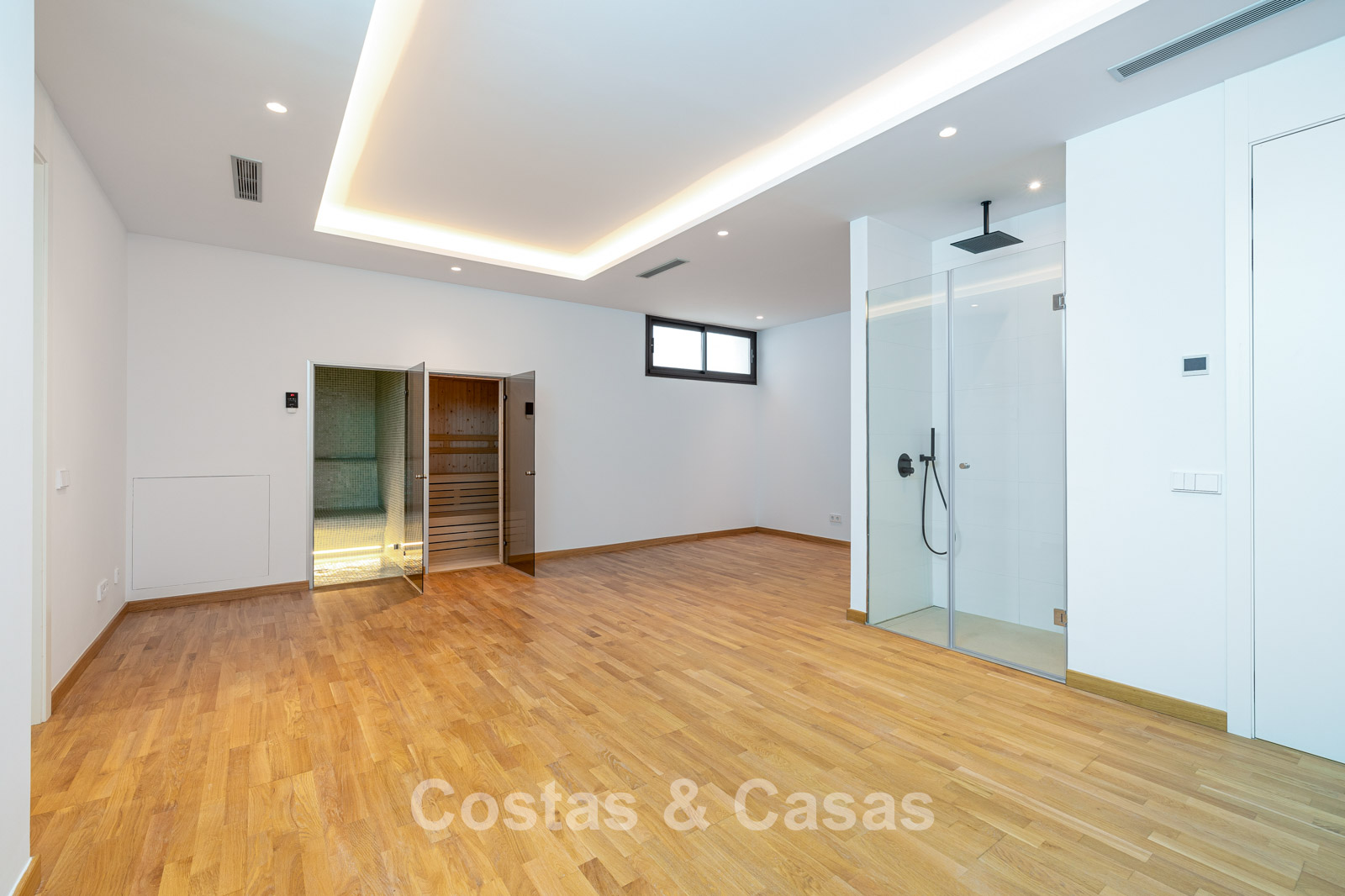 Detached luxury villa in a sleek, contemporary architectural style. The villa is part of an exclusive villa project of 15 villas, completed in 2023. High-quality materials and high-quality finishes are used. High-ceilinged sliding windows with recessed profiles throughout the villa provide abundant natural light. Spacious living room with a TV lounge and dining area. Open-plan designer kitchen with Gaggenau appliances and a central island perfect for breakfast. 5 bedrooms, 4 bathrooms, and 2 guest toilets. On the lower floor, there is a multifunctional room that can be furnished to your liking, as well as a separate room with a large-screen TV, perfect for a home cinema. Fitness room with an adjoining sauna and shower. Climate-controlled wine cellar. Laundry room. Technical room. Integrated garage for several cars.