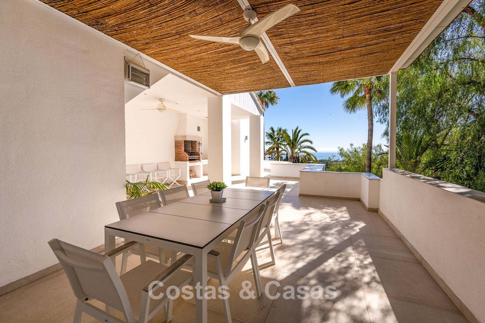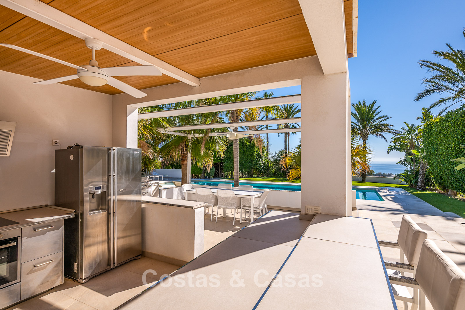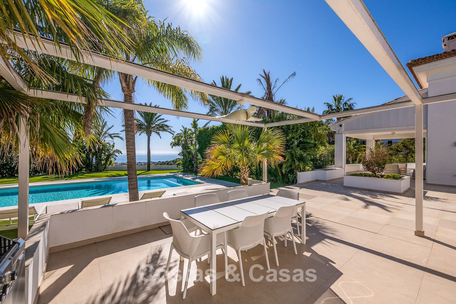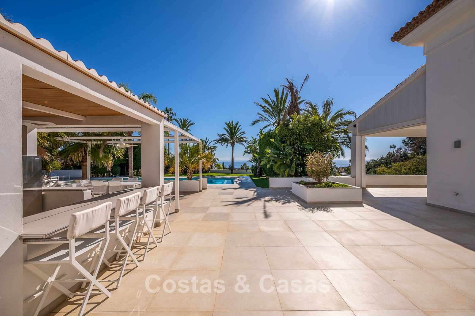 The vast plot of nearly 6,000 m² offers complete privacy. A beautifully landscaped Mediterranean garden surrounds the entire property with mature vegetation. A large heated outdoor pool and a generous sun terrace. An ultra-luxurious outdoor kitchen and bar, fully equipped with a professional barbecue and cooling facilities, perfect for entertaining and al fresco dining. Thanks to its south-facing orientation, the property enjoys maximum sunlight. Panoramic views over the greenery and the Mediterranean Sea.