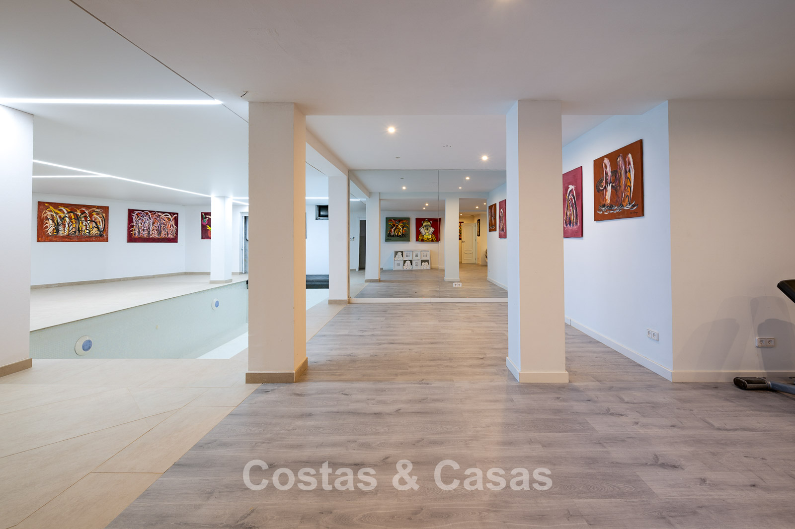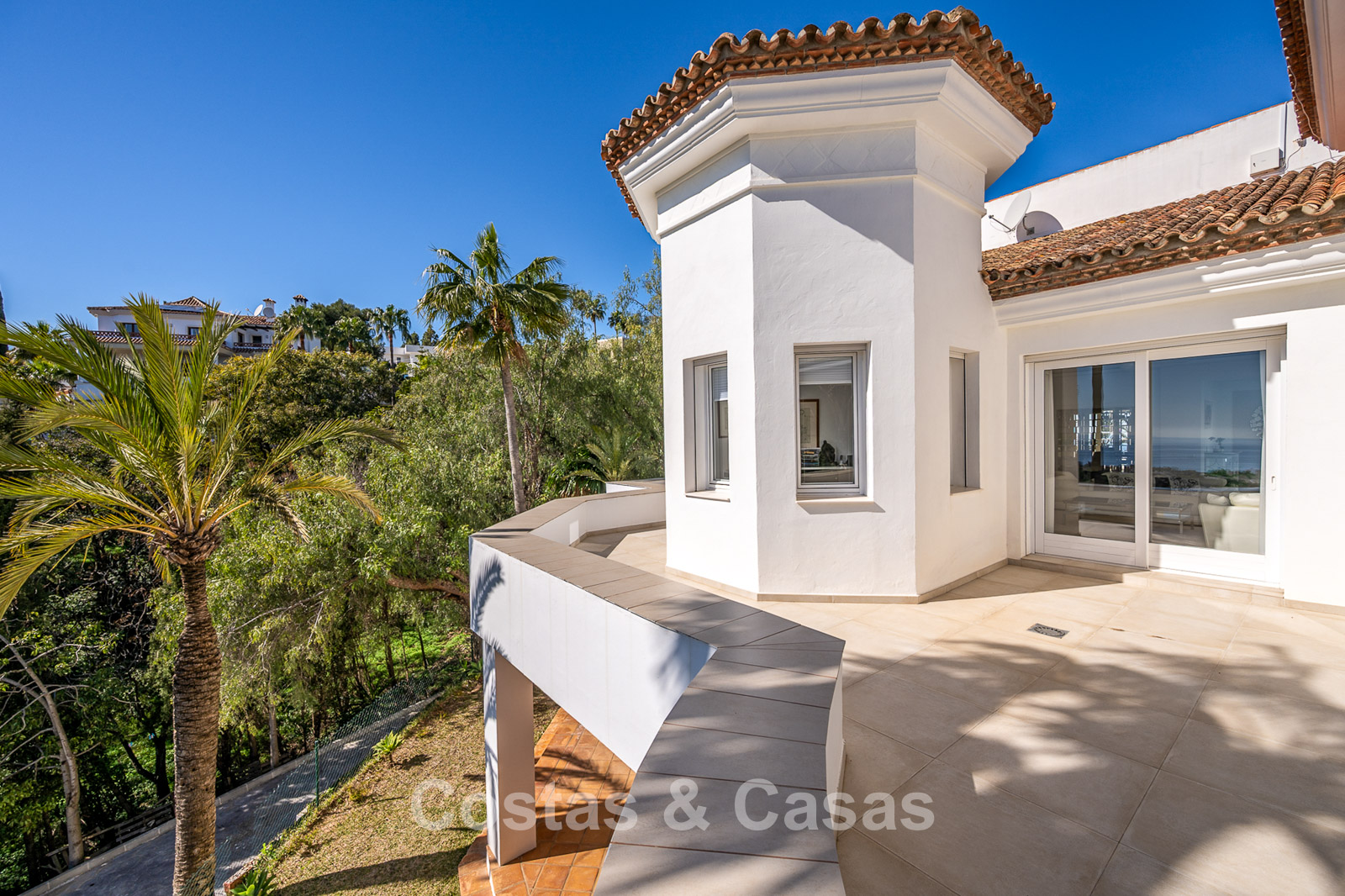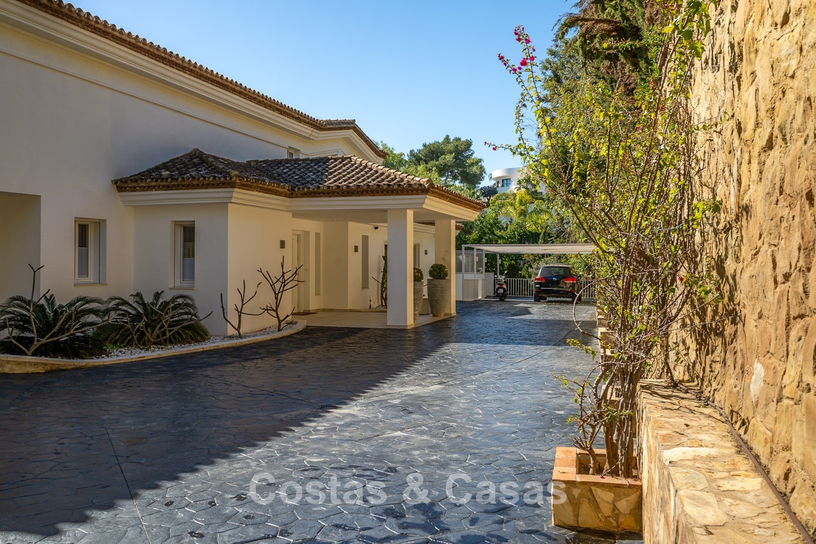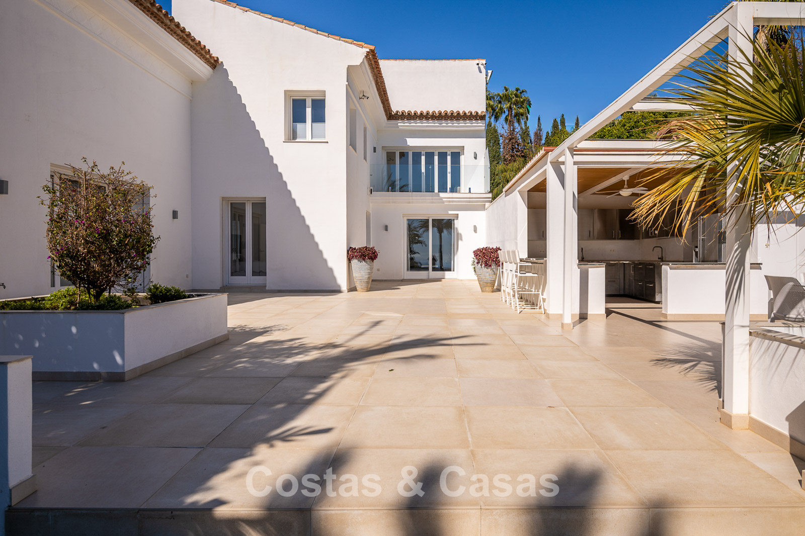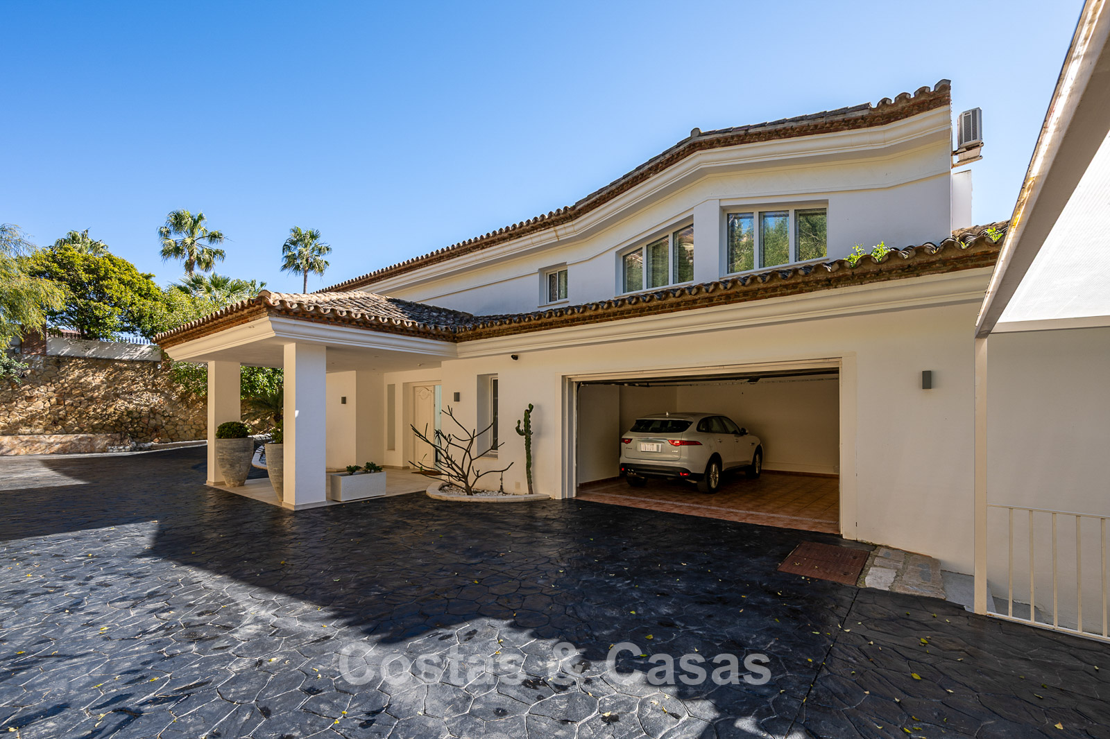 Impressive villa in a classic-modern style, spread over multiple levels. Recently fully renovated to a contemporary standard with great attention to detail. Finished with exceptionally high-quality materials and luxurious finishes. Modernised Andalusian patio leading to a double-height entrance with large arched windows. Spacious living area with a formal lounge and cosy seating areas. Fully equipped kitchen with all modern built-in appliances. In total, 9 bedrooms, each with its own luxurious en-suite bathroom and fitted wardrobes. The master suite features a large private terrace with spectacular coastal views. Separate guest apartment with kitchenette and living area, ideal for staff or visitors. Office / exhibition space. Lower level includes a professional gym, sauna, jacuzzi, and indoor swimming pool. Traditional wine bodega. Ample storage and separate laundry room. Technical room. Unfinished basement, customisable to your needs. Parking for 2 cars in a private garage plus additional parking within the gated plot.