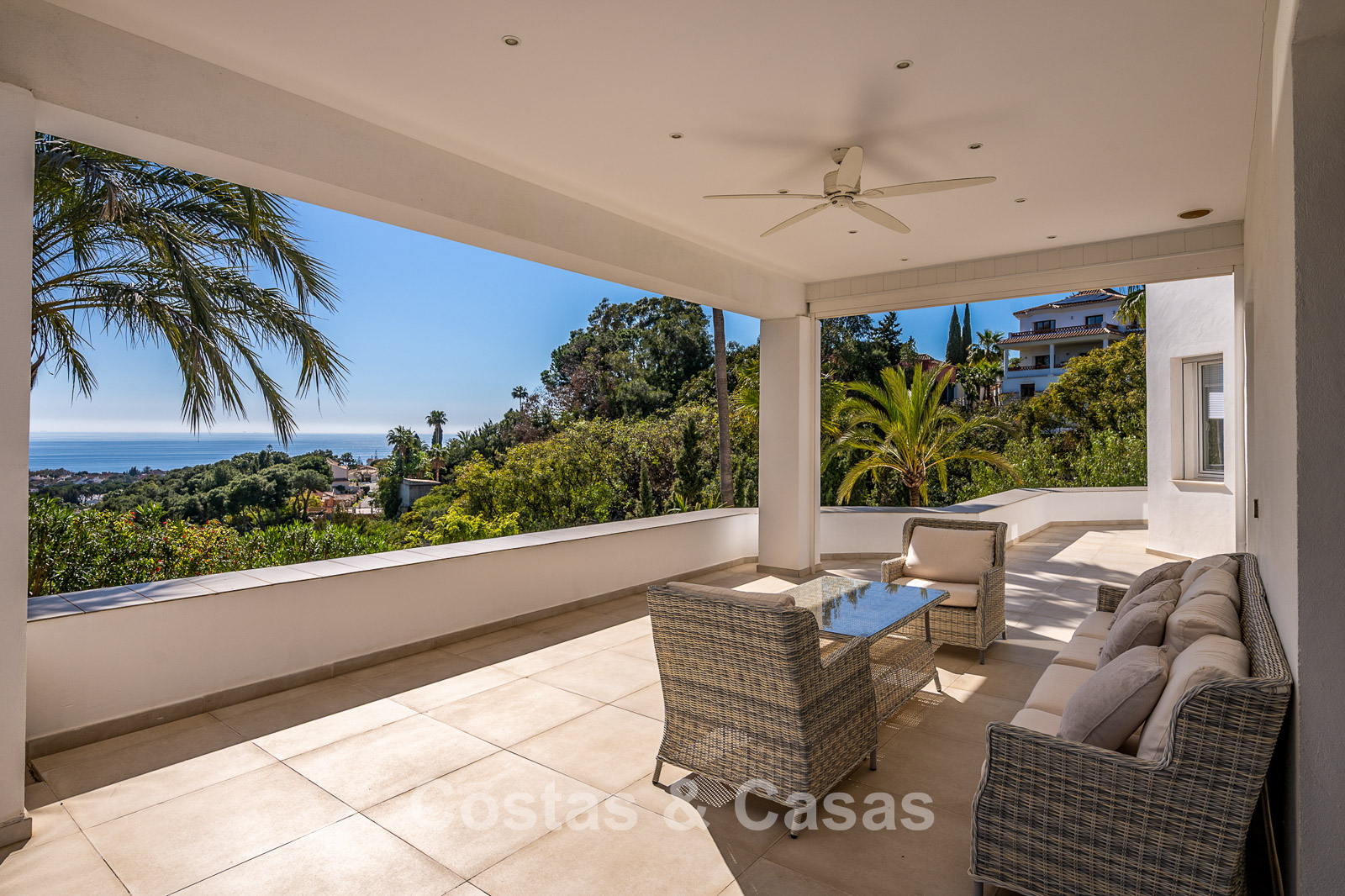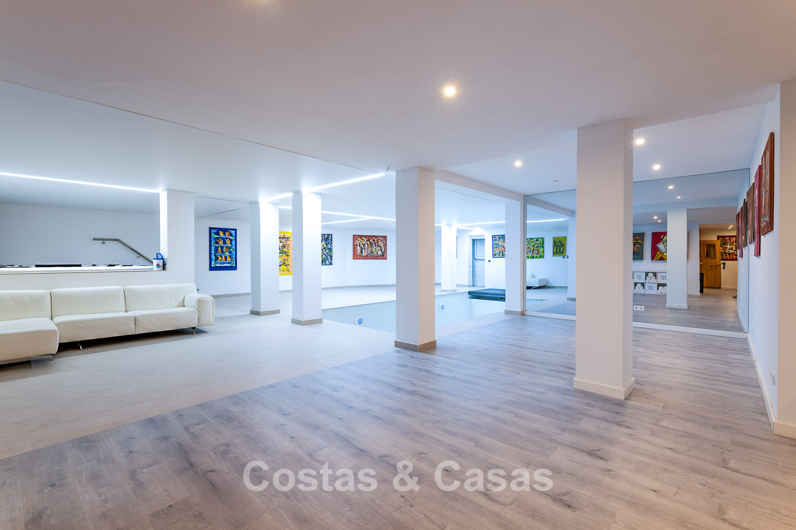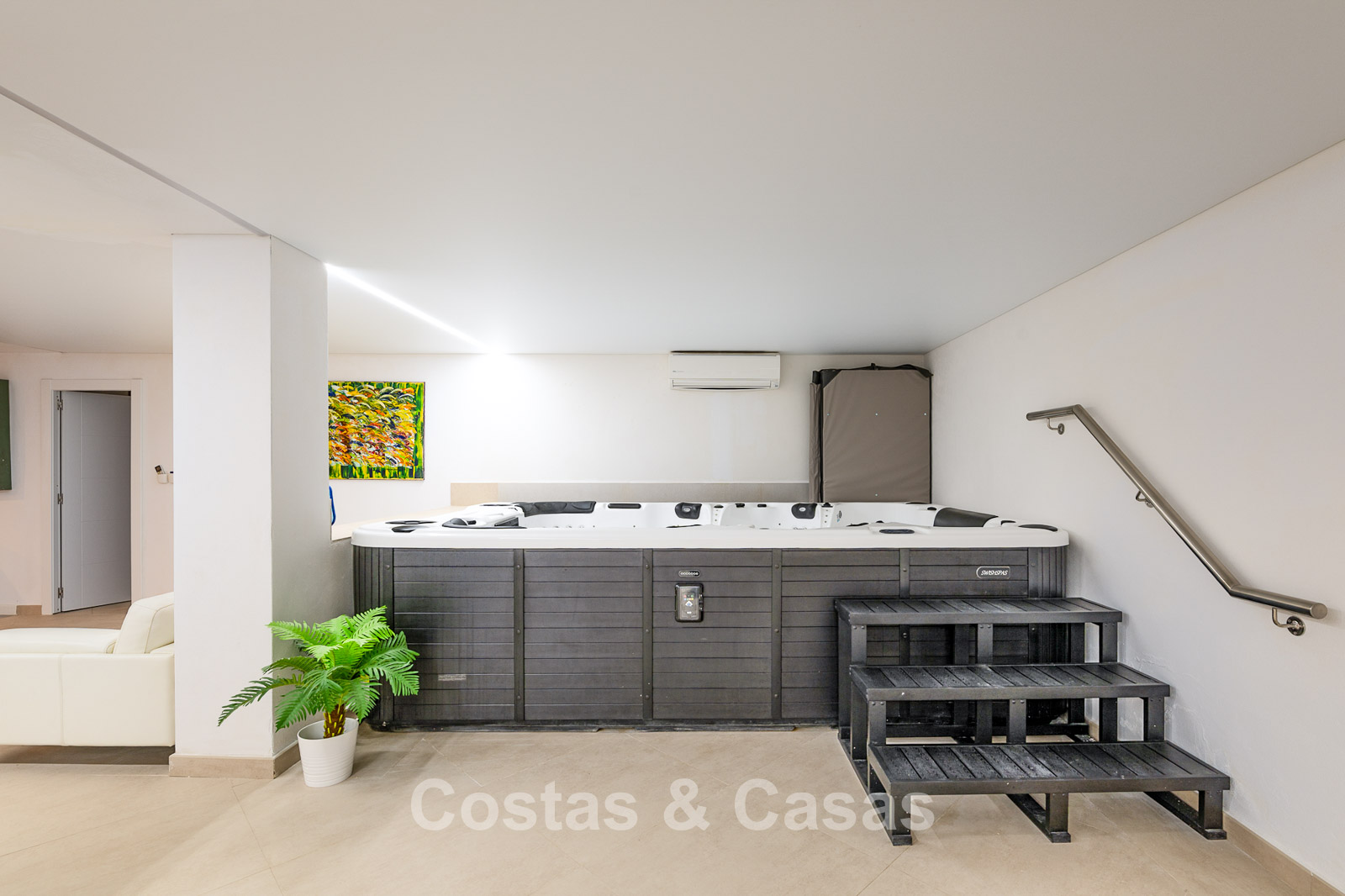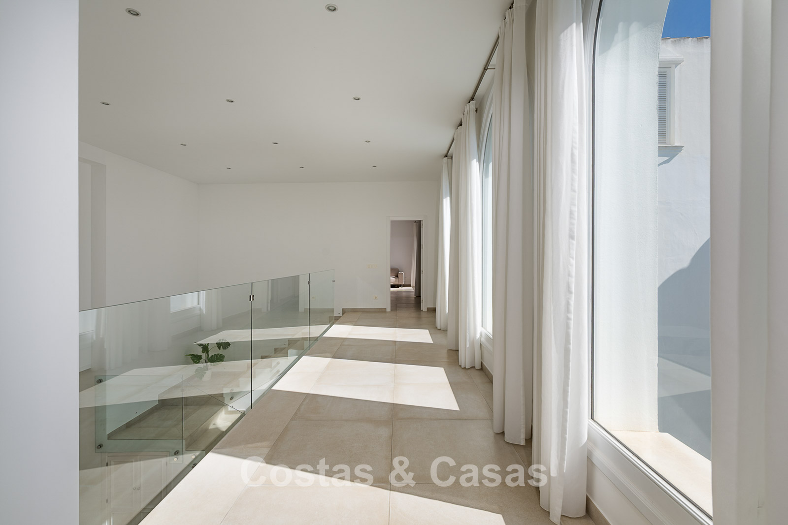 Impressive villa in a classic-modern style, spread over multiple levels. Recently fully renovated to a contemporary standard with great attention to detail. Finished with exceptionally high-quality materials and luxurious finishes. Modernised Andalusian patio leading to a double-height entrance with large arched windows. Spacious living area with a formal lounge and cosy seating areas. Fully equipped kitchen with all modern built-in appliances. In total, 9 bedrooms, each with its own luxurious en-suite bathroom and fitted wardrobes. The master suite features a large private terrace with spectacular coastal views. Separate guest apartment with kitchenette and living area, ideal for staff or visitors. Office / exhibition space. Lower level includes a professional gym, sauna, jacuzzi, and indoor swimming pool. Traditional wine bodega. Ample storage and separate laundry room. Technical room. Unfinished basement, customisable to your needs. Parking for 2 cars in a private garage plus additional parking within the gated plot.