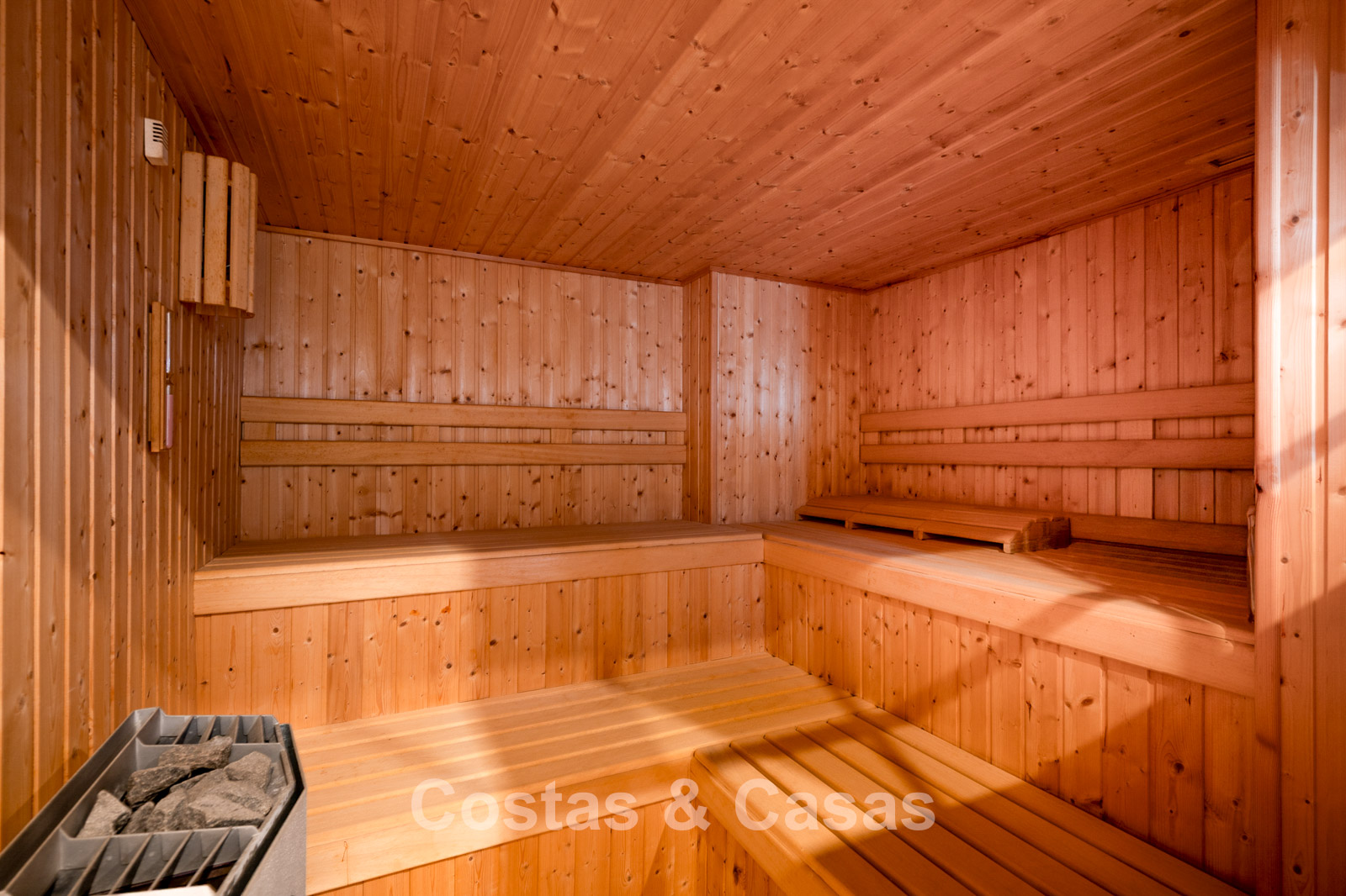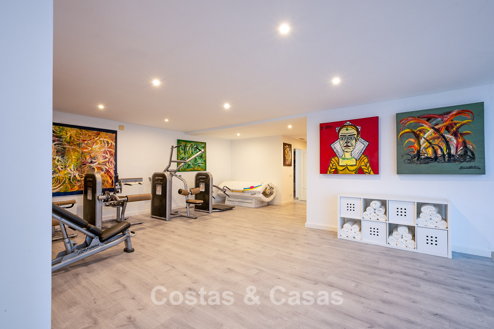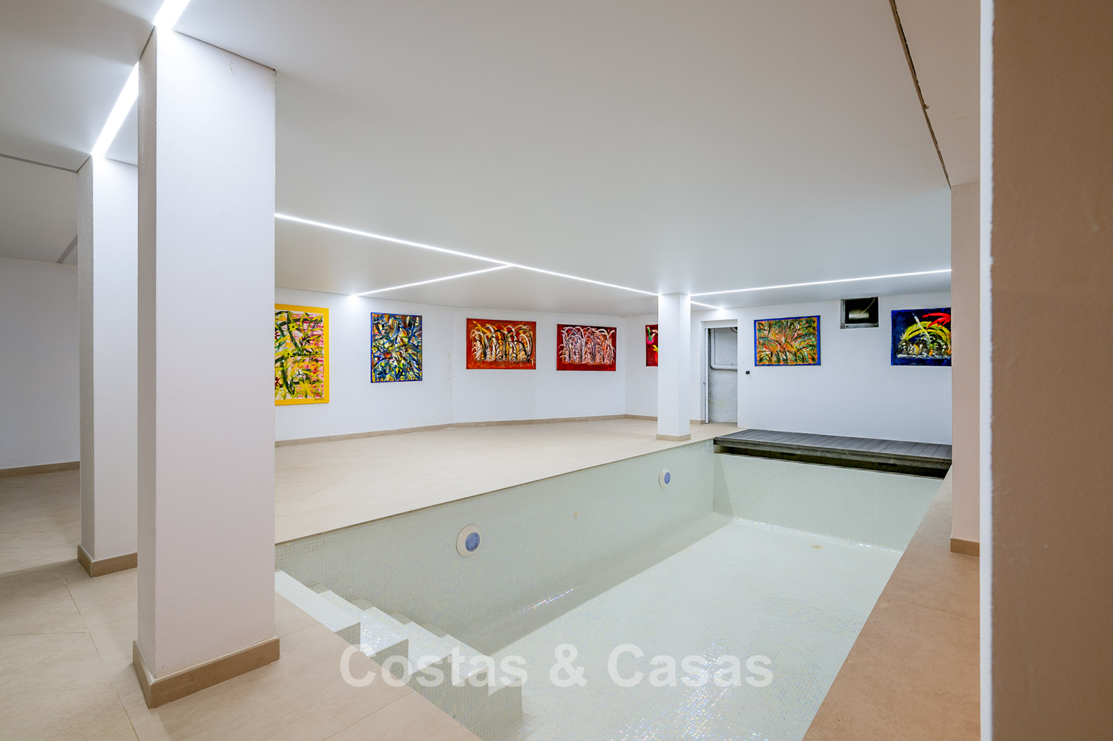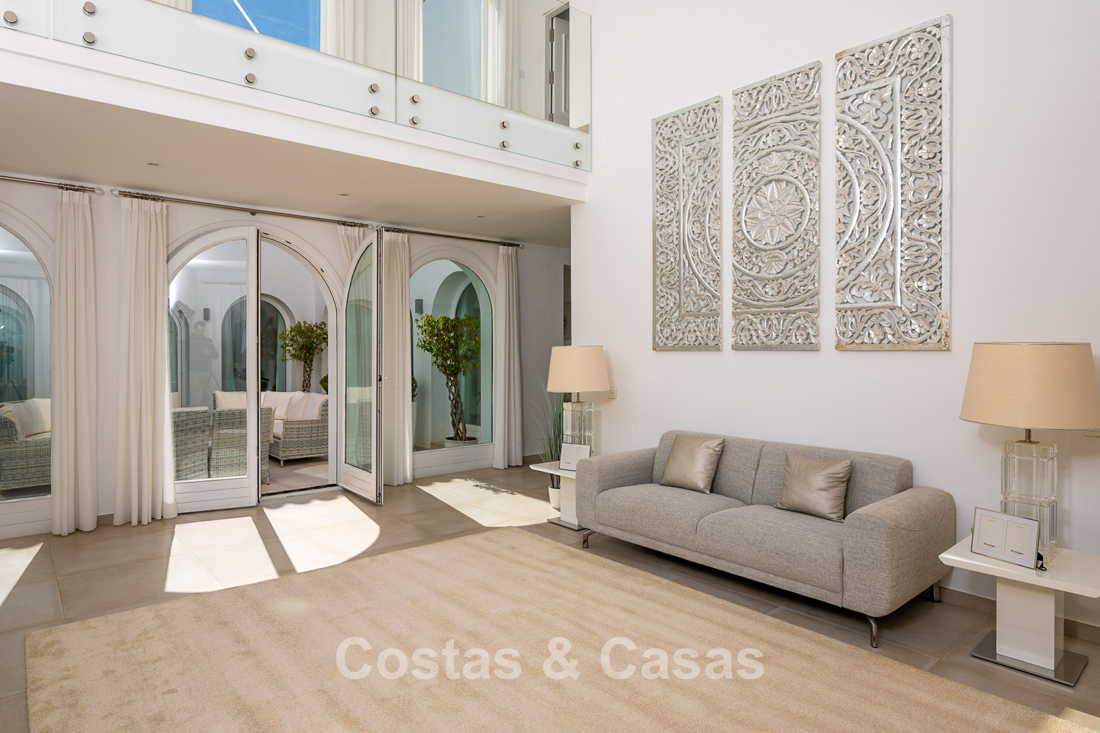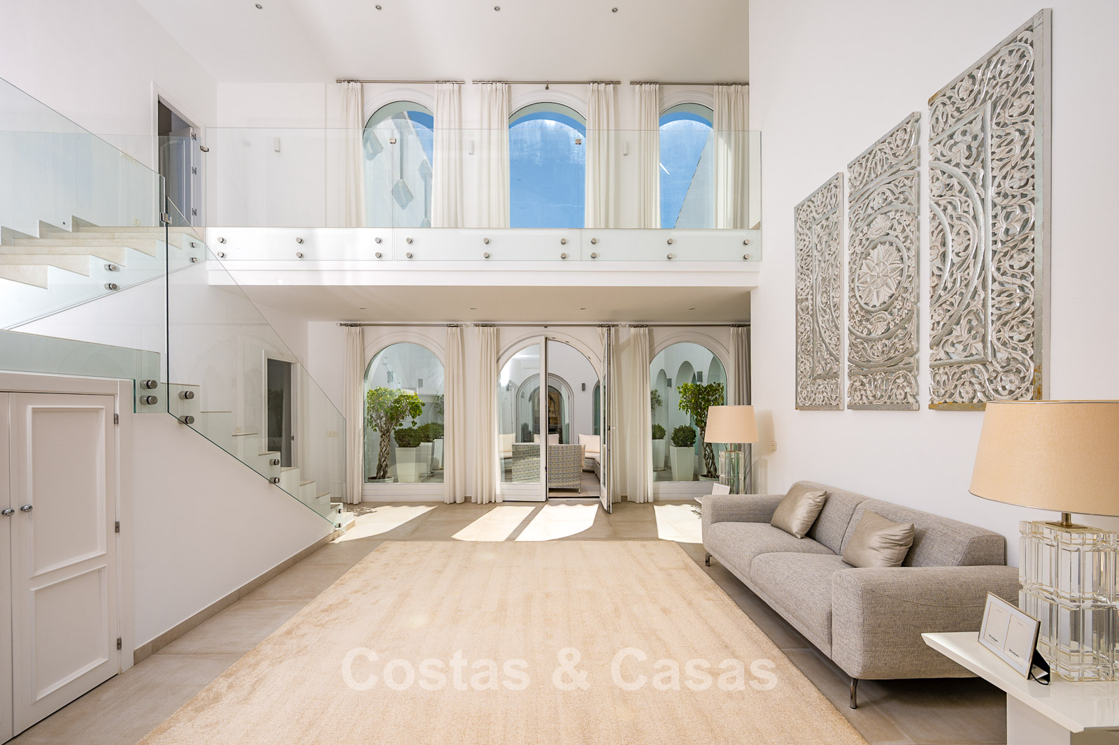 Impressive villa in a classic-modern style, spread over multiple levels. Recently fully renovated to a contemporary standard with great attention to detail. Finished with exceptionally high-quality materials and luxurious finishes. Modernised Andalusian patio leading to a double-height entrance with large arched windows. Spacious living area with a formal lounge and cosy seating areas. Fully equipped kitchen with all modern built-in appliances. In total, 9 bedrooms, each with its own luxurious en-suite bathroom and fitted wardrobes. The master suite features a large private terrace with spectacular coastal views. Separate guest apartment with kitchenette and living area, ideal for staff or visitors. Office / exhibition space. Lower level includes a professional gym, sauna, jacuzzi, and indoor swimming pool. Traditional wine bodega. Ample storage and separate laundry room. Technical room. Unfinished basement, customisable to your needs. Parking for 2 cars in a private garage plus additional parking within the gated plot.