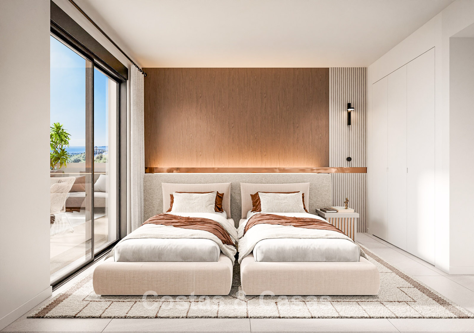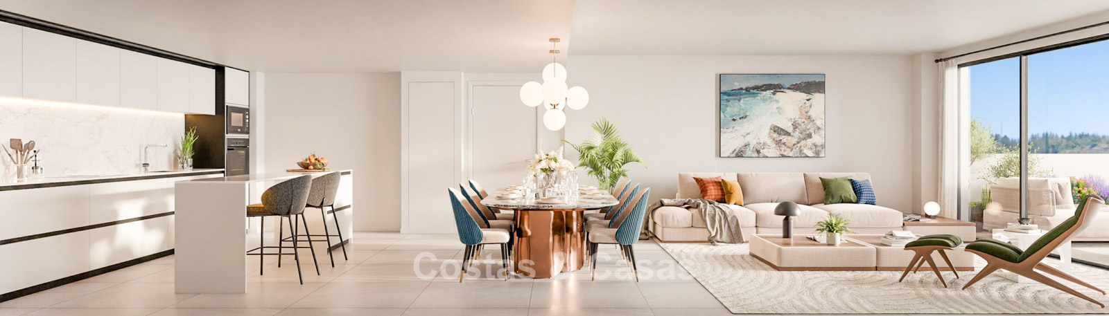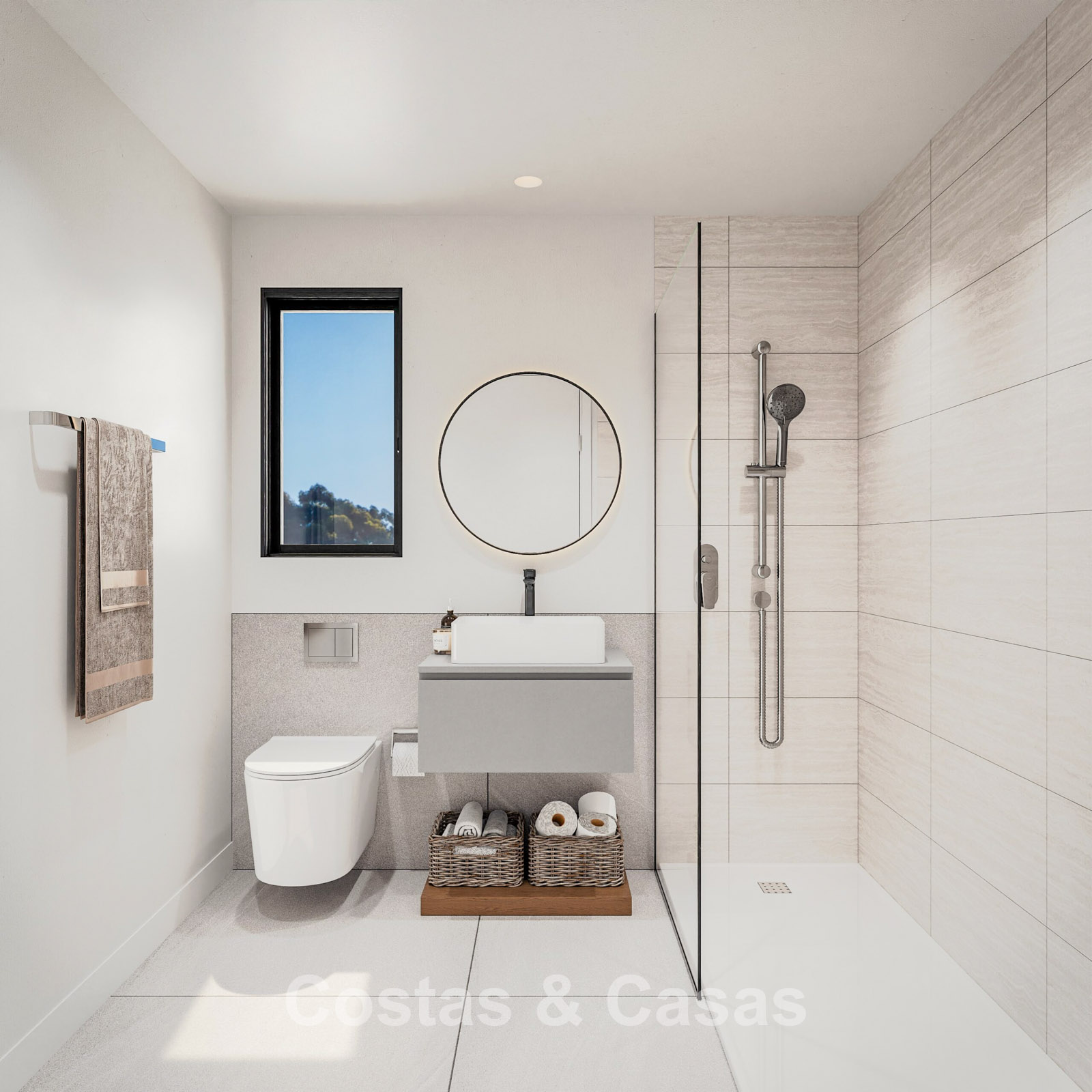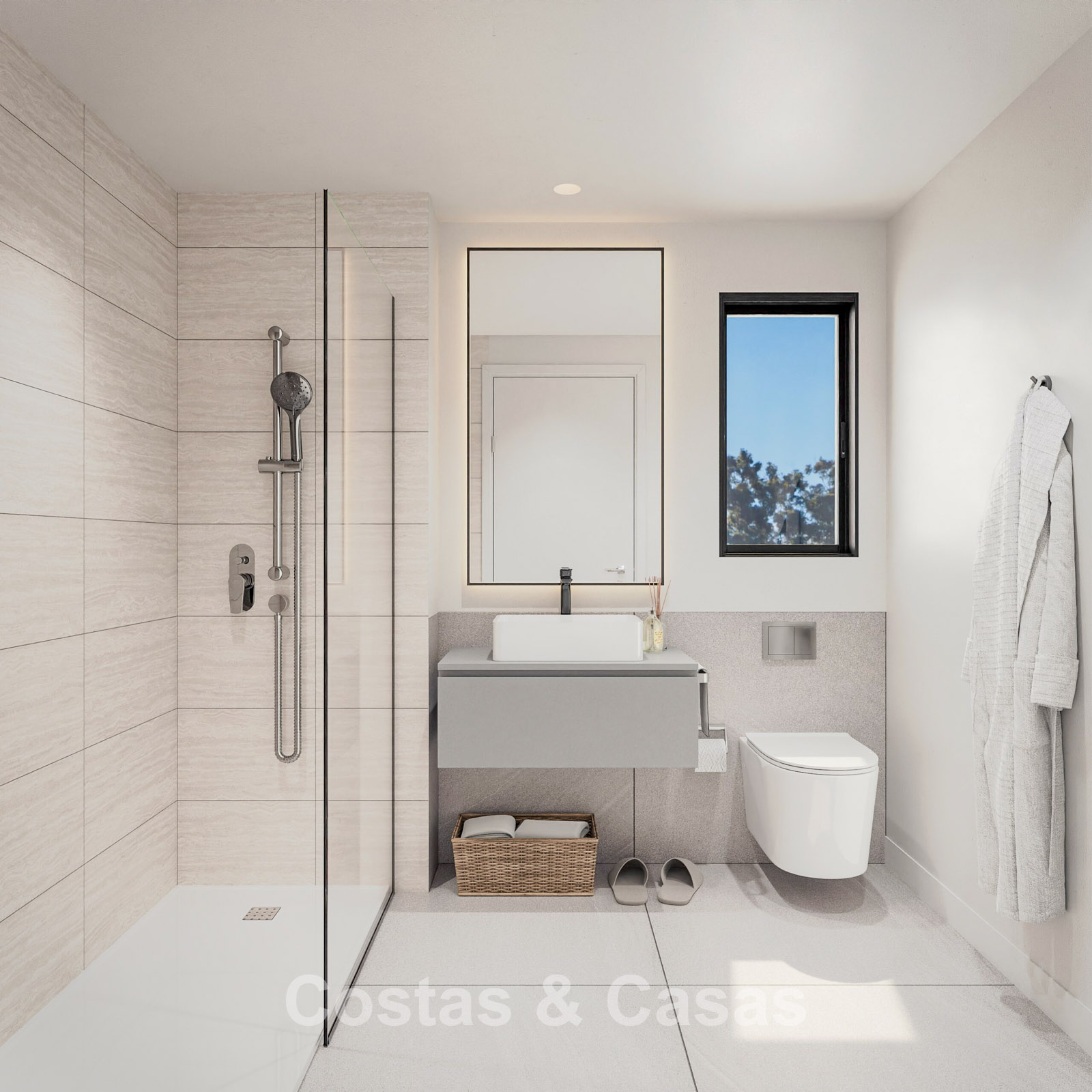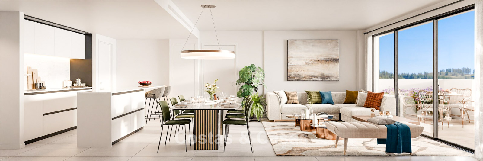 The project comprises 80 exclusive apartments with modern Mediterranean architecture. High-quality materials and refined finishes are used throughout. Thanks to the high sliding windows, abundant natural light flows through every room, enhancing the harmony between indoors and outdoors. Spacious and flexible outdoor spaces are perfect for relaxing, gathering, and enjoying the stunning views. The penthouses benefit from a roof terrace. A stylish and functional open-plan layout perfectly combines space and living comfort. Open-plan living area with living and dining areas. Sleek, integrated kitchen wall, equipped with high-quality appliances and a seating island. The apartments have 2 or 3 bedrooms. The master bedrooms have an en-suite bathroom. Utility room. High-quality porcelain flooring. Storage room. 2 parking spaces per apartment, 3 parking spaces per penthouse included.