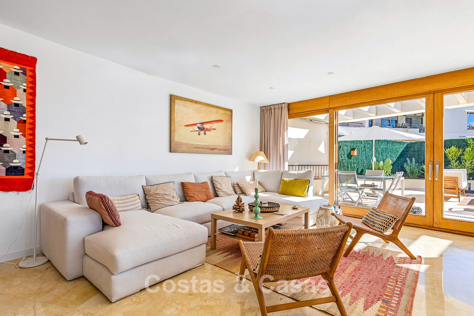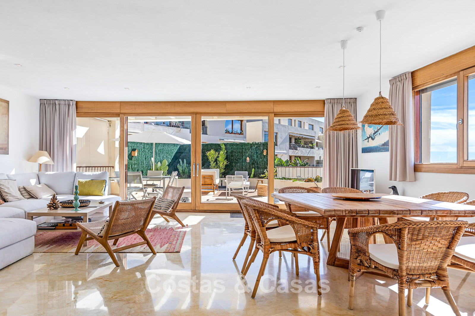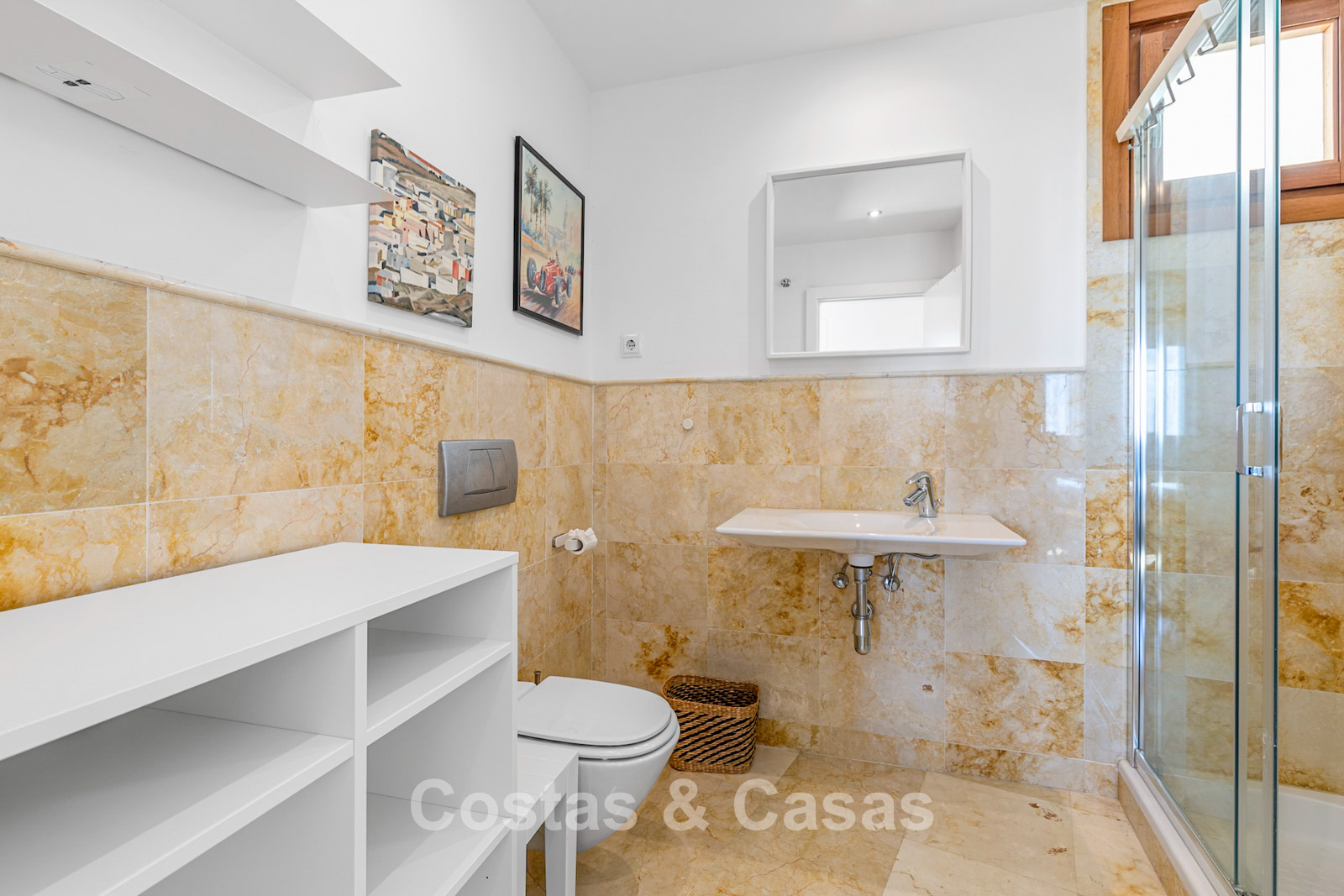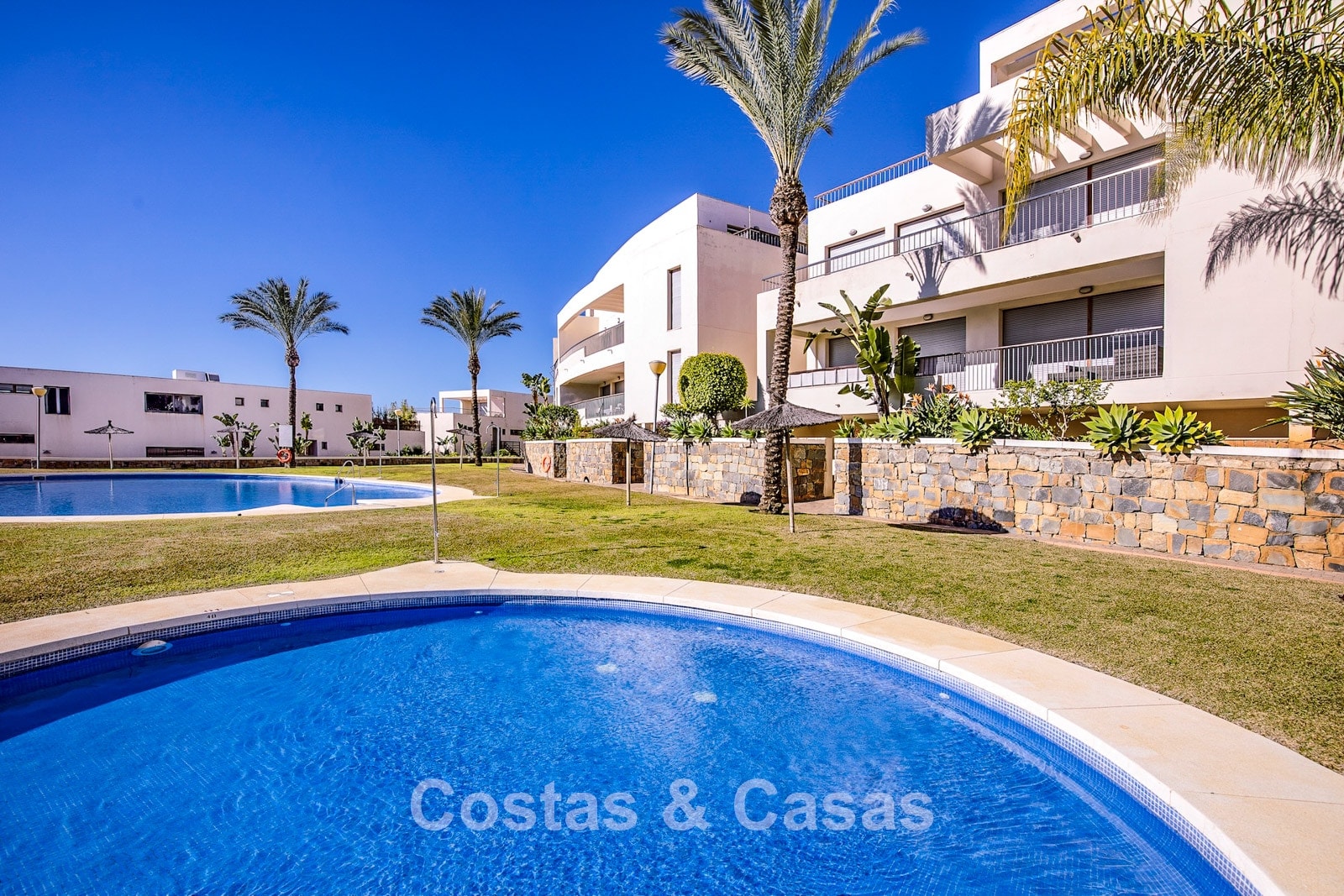 The area is peaceful and surrounded by nature, yet only a 10–12-minute drive from the beach and Marbella town centre. The urbanisation is about a 10-minute drive from Santa Clara Golf and around 12–15 minutes from Río Real Golf, two of the best-known courses in the region. Other courses such as Marbella Golf & Country Club are also reachable within 15 minutes. Málaga airport is approximately 45 minutes away via the A7. The complex offers communal swimming pools and gardens.
