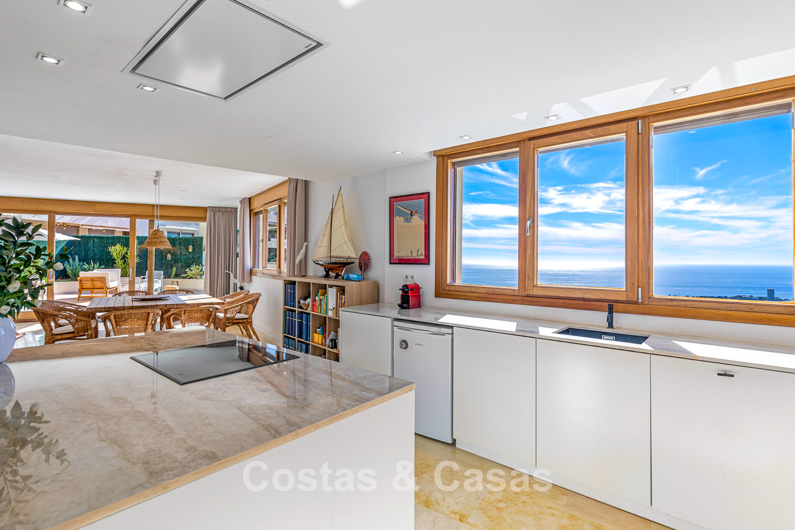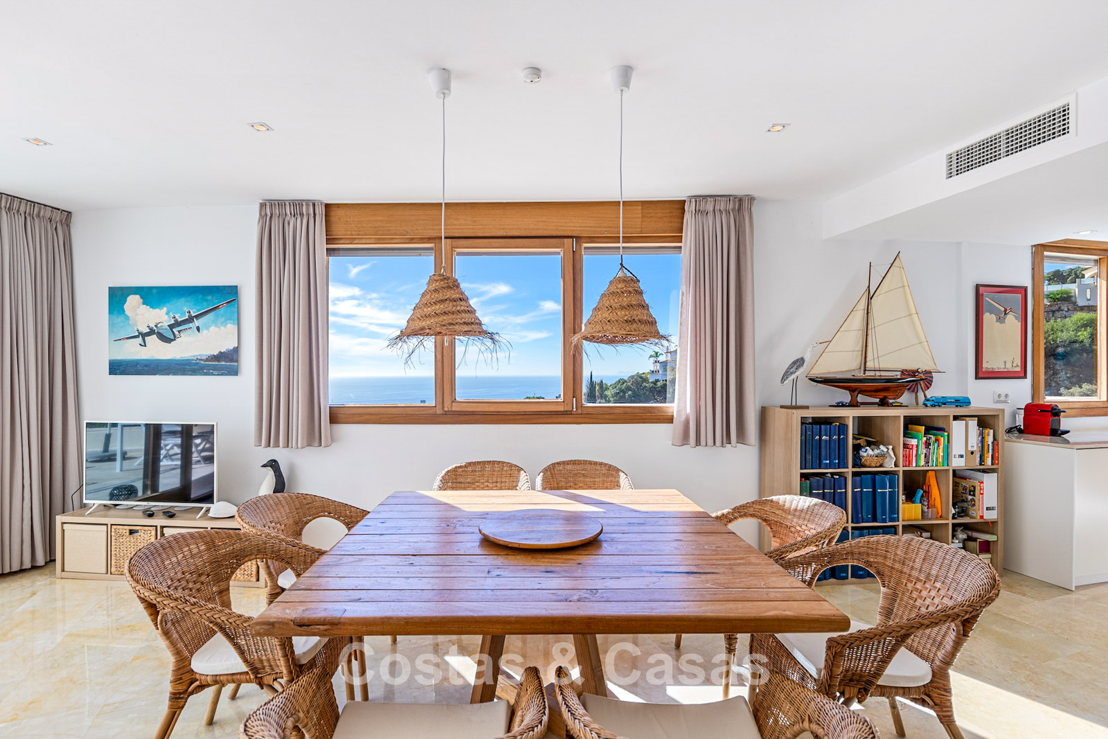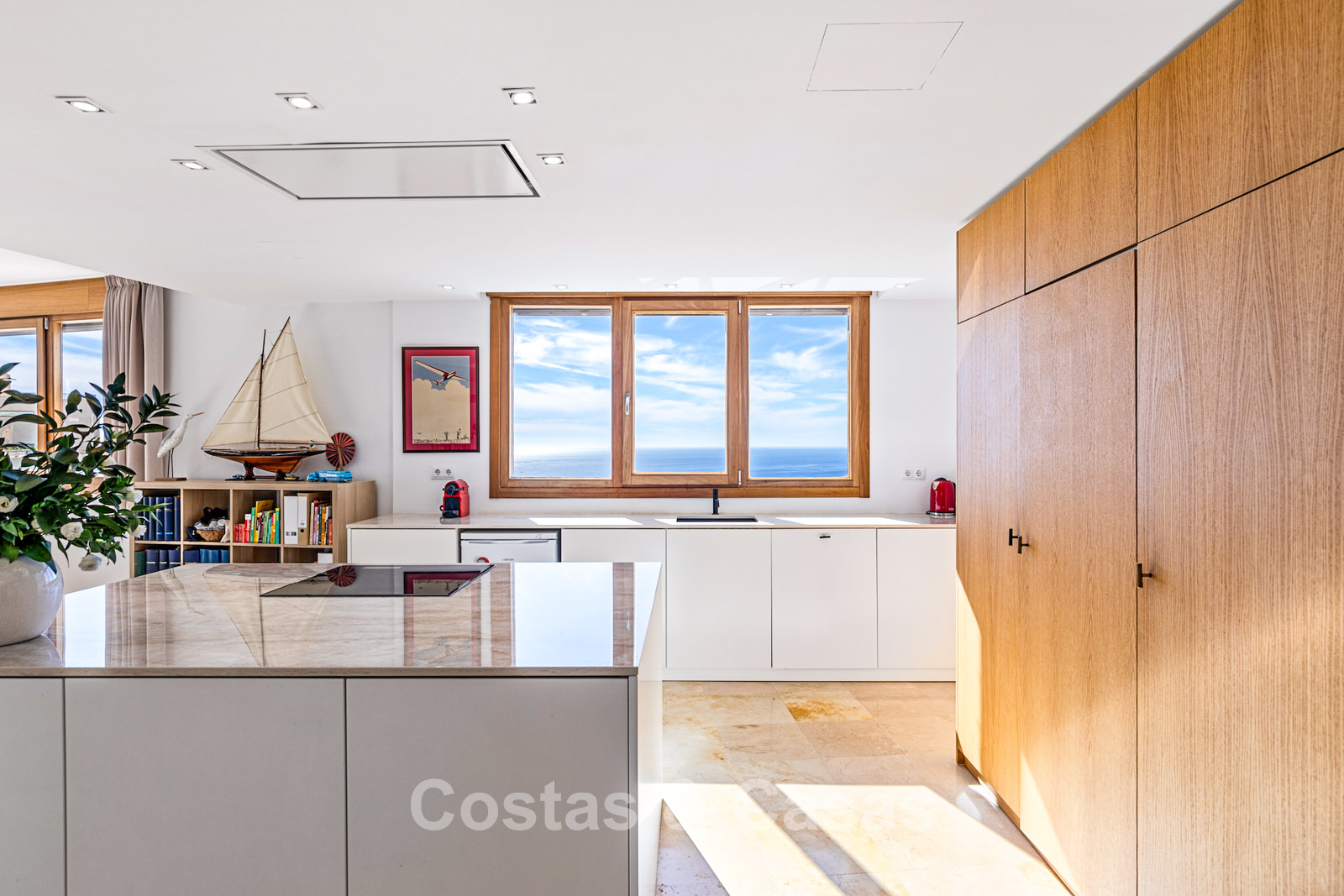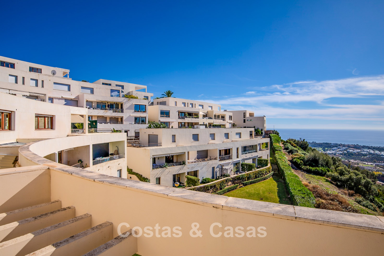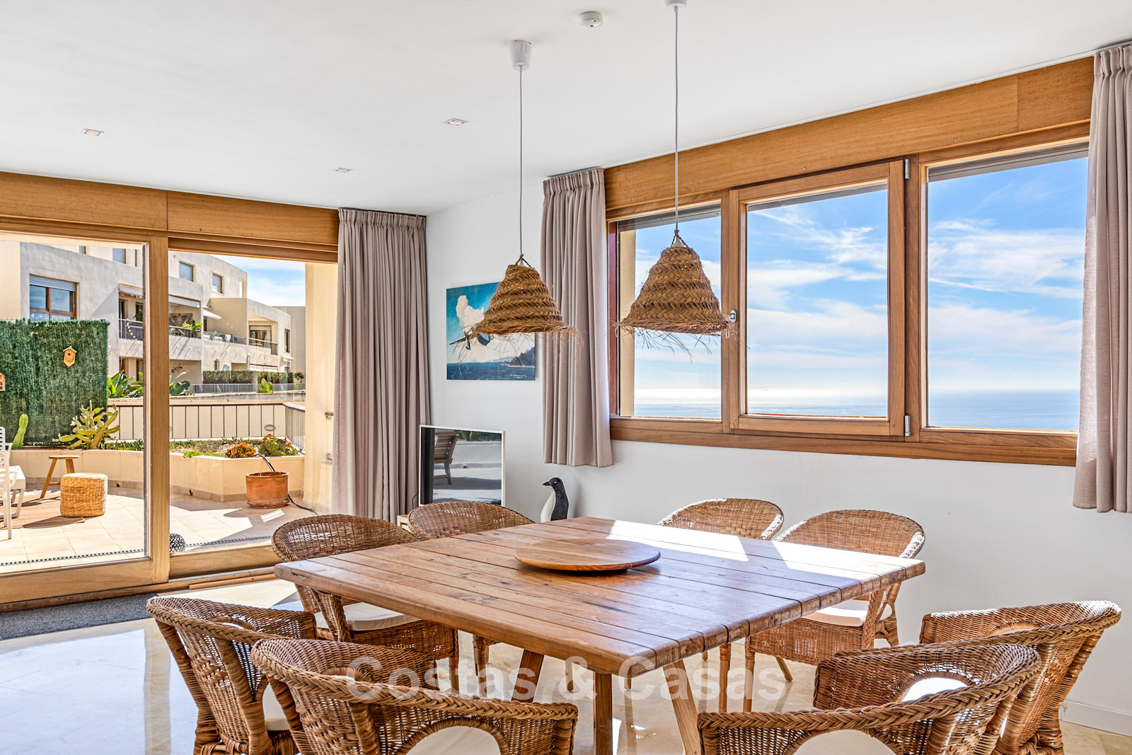 Generous penthouse in excellent condition. Spectacular panoramic views of the Mediterranean and coastline from every room. Southwest orientation. Modern and bright interior of almost 100 m². Large sliding windows allow natural light to flood in. Spacious open-plan living area with integrated dining space. Open kitchen with central island seamlessly connected to the living room. 3 bedrooms, 2 + 1 bathrooms. The main bedroom has access to another west-facing terrace. Marble floors. Utility room. Storage room. Includes 2 parking spaces.