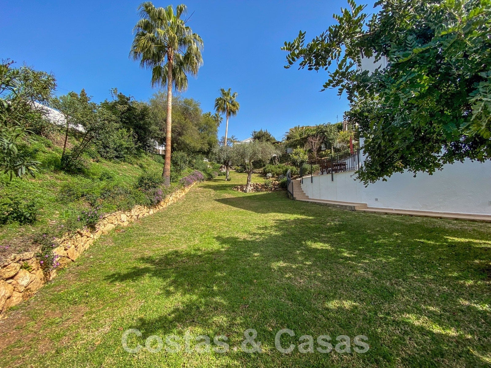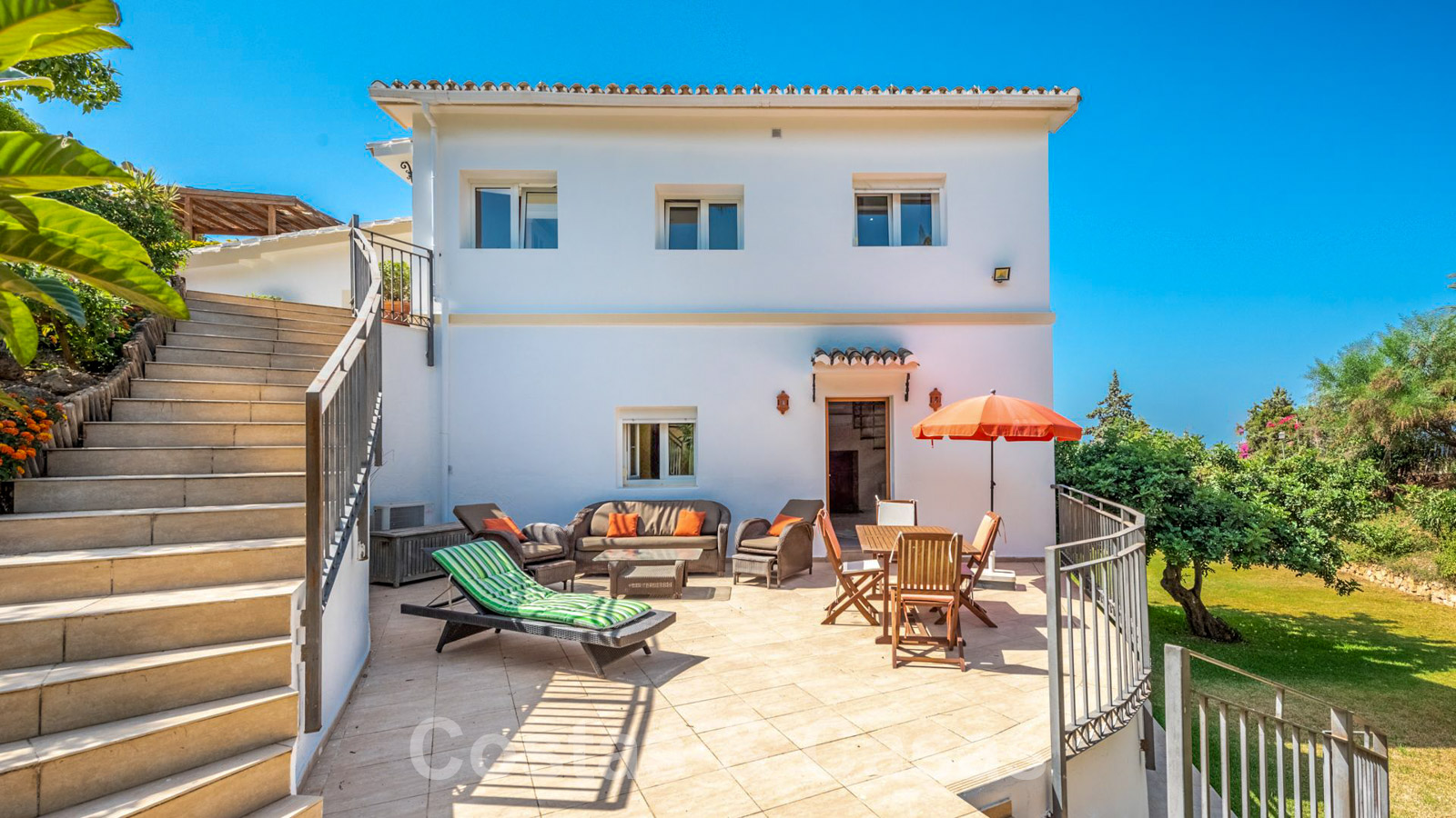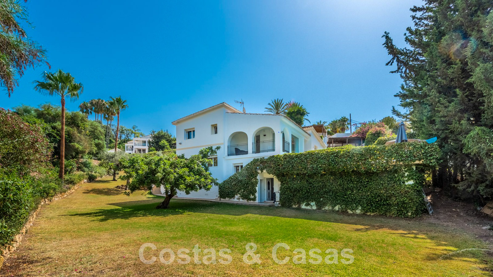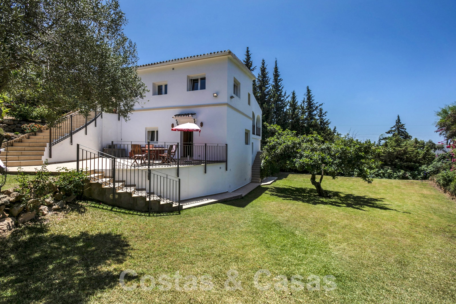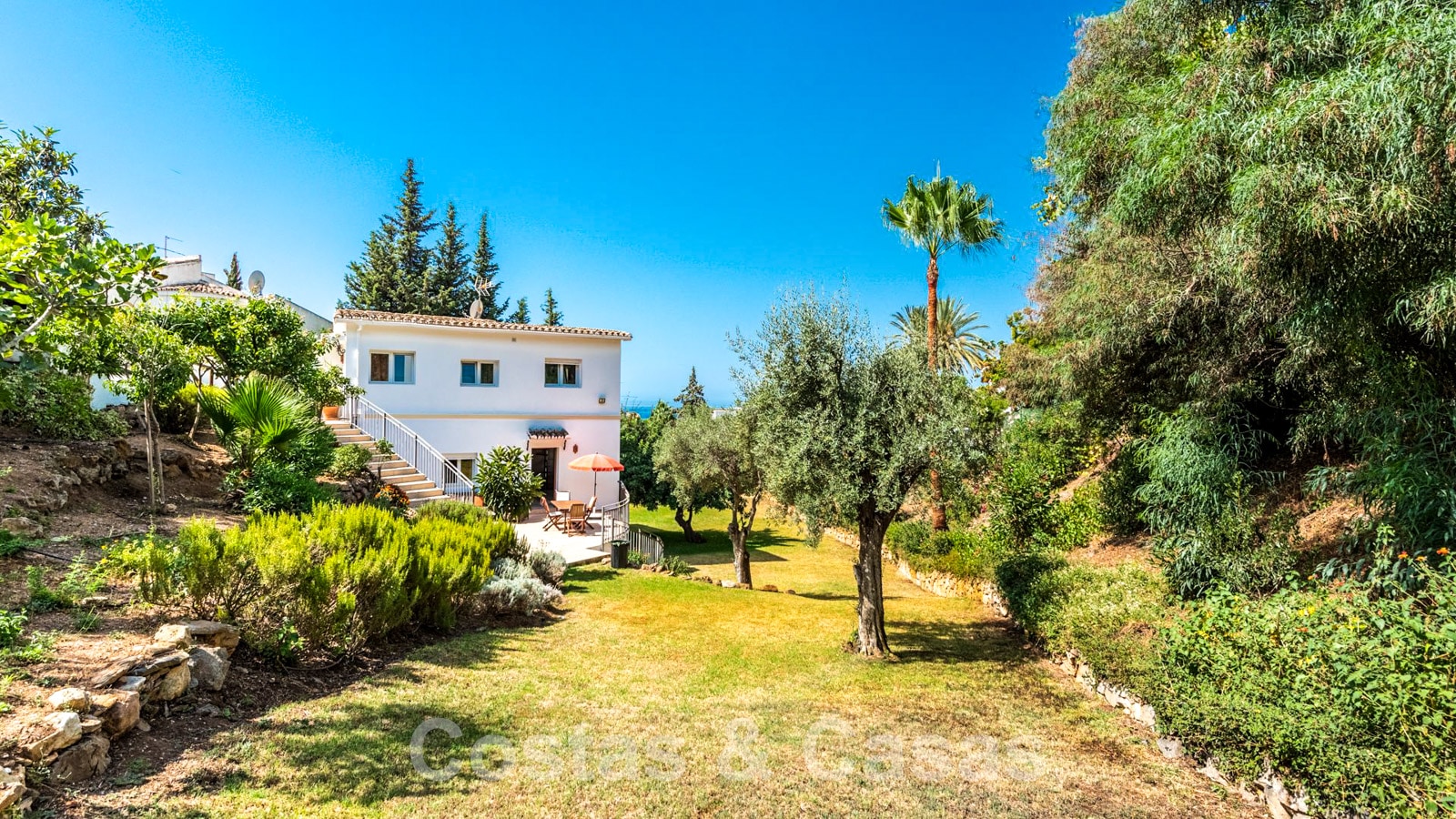 Large plot in an elevated position. The villa is surrounded by lush greenery and enjoys an extensive lawned area. Swimming pool surrounded by a sun terrace. Wooden pergola terrace with an outdoor kitchen, built-in barbecue and dining table. Multiple open and covered terraces with different orientations. Partly sea views and views of the picturesque mountain landscape.