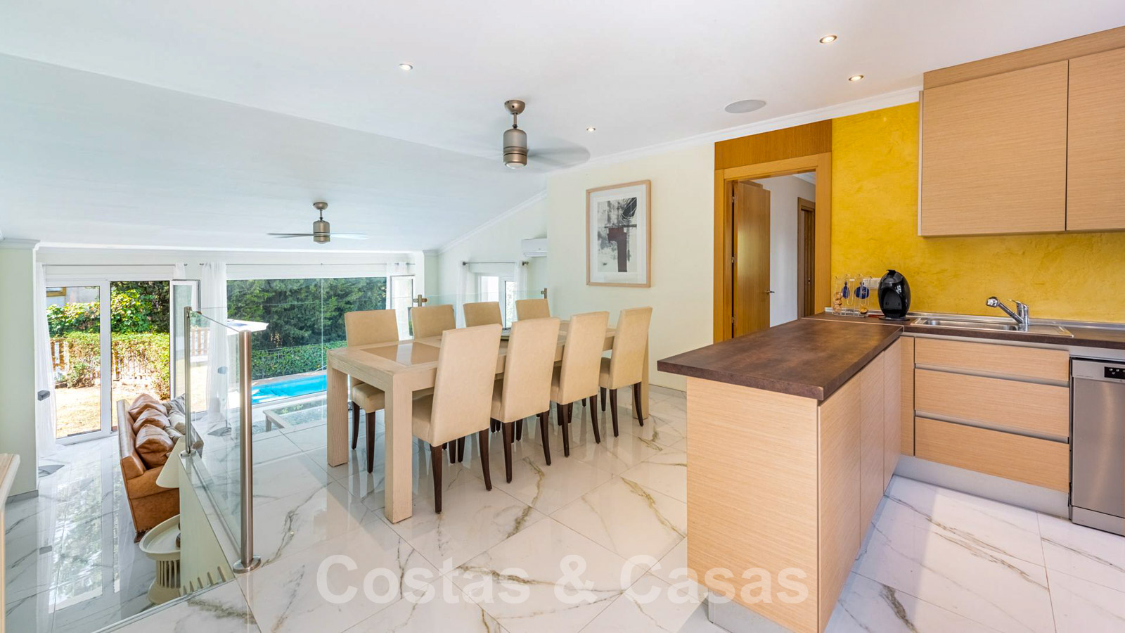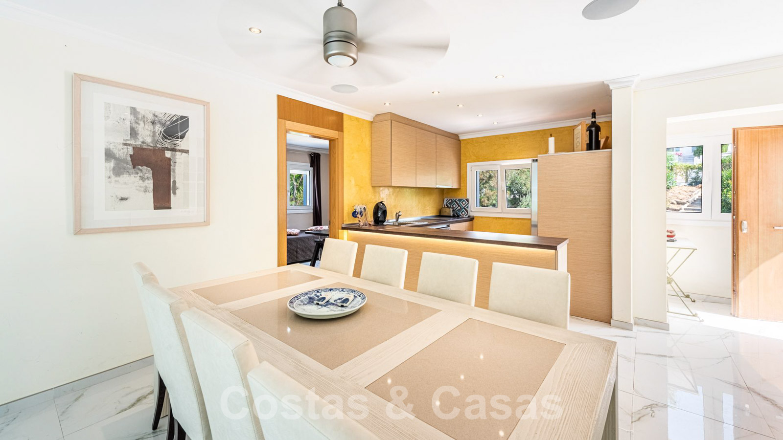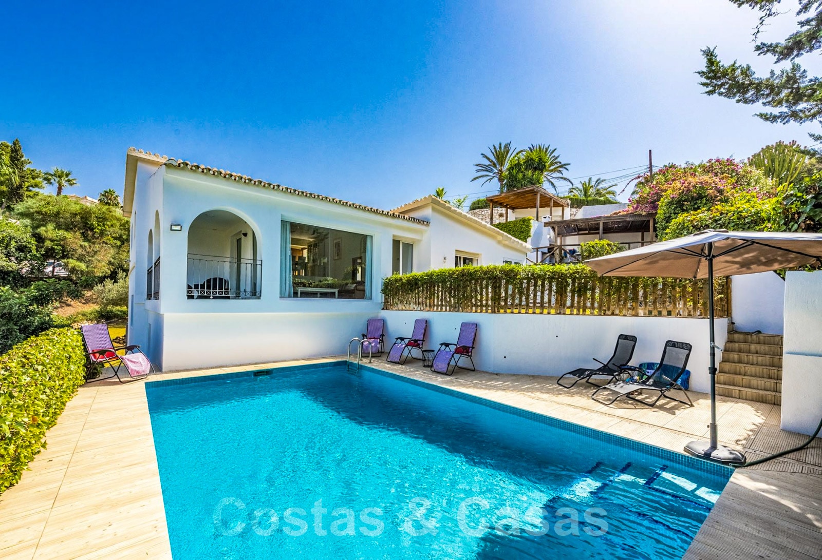 Detached family home with Andalusian architecture. Possibly an investment opportunity to renovate and sell or for holiday rental. Lots of natural light. Living area with lounge and mezzanine fitted kitchen. Practical, open-plan kitchen with integrated dining table. 4 bedrooms, 4 bathrooms. Marble interior floors. A guest house with its own entrance features a living room with modern open-plan kitchen, 1 bedroom and 1 bathroom.