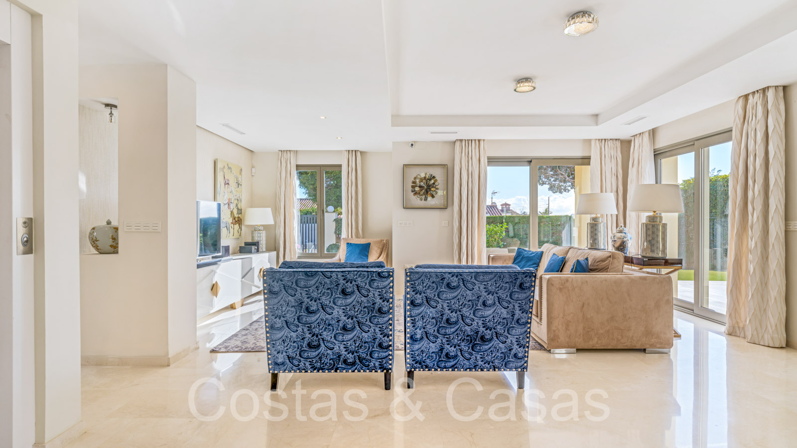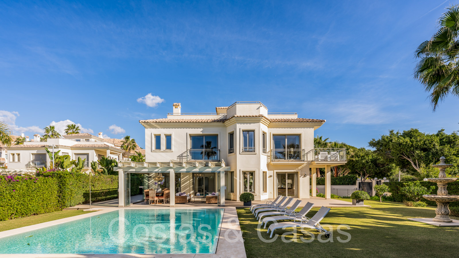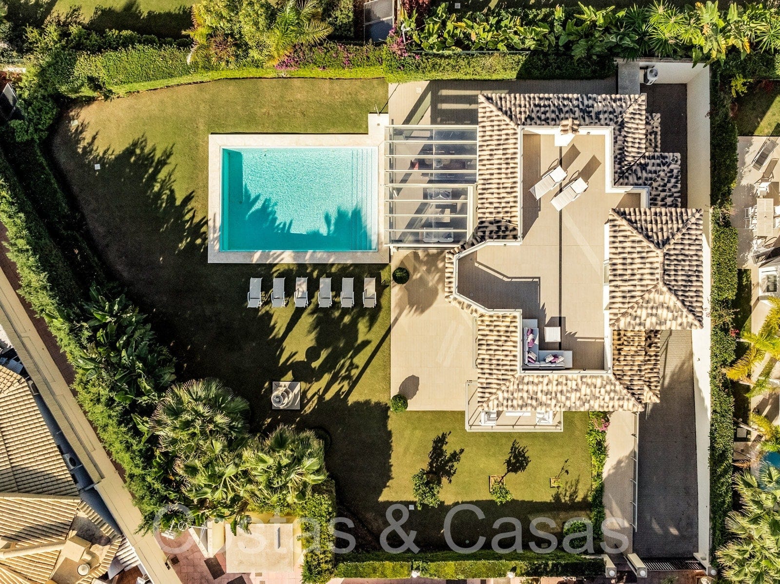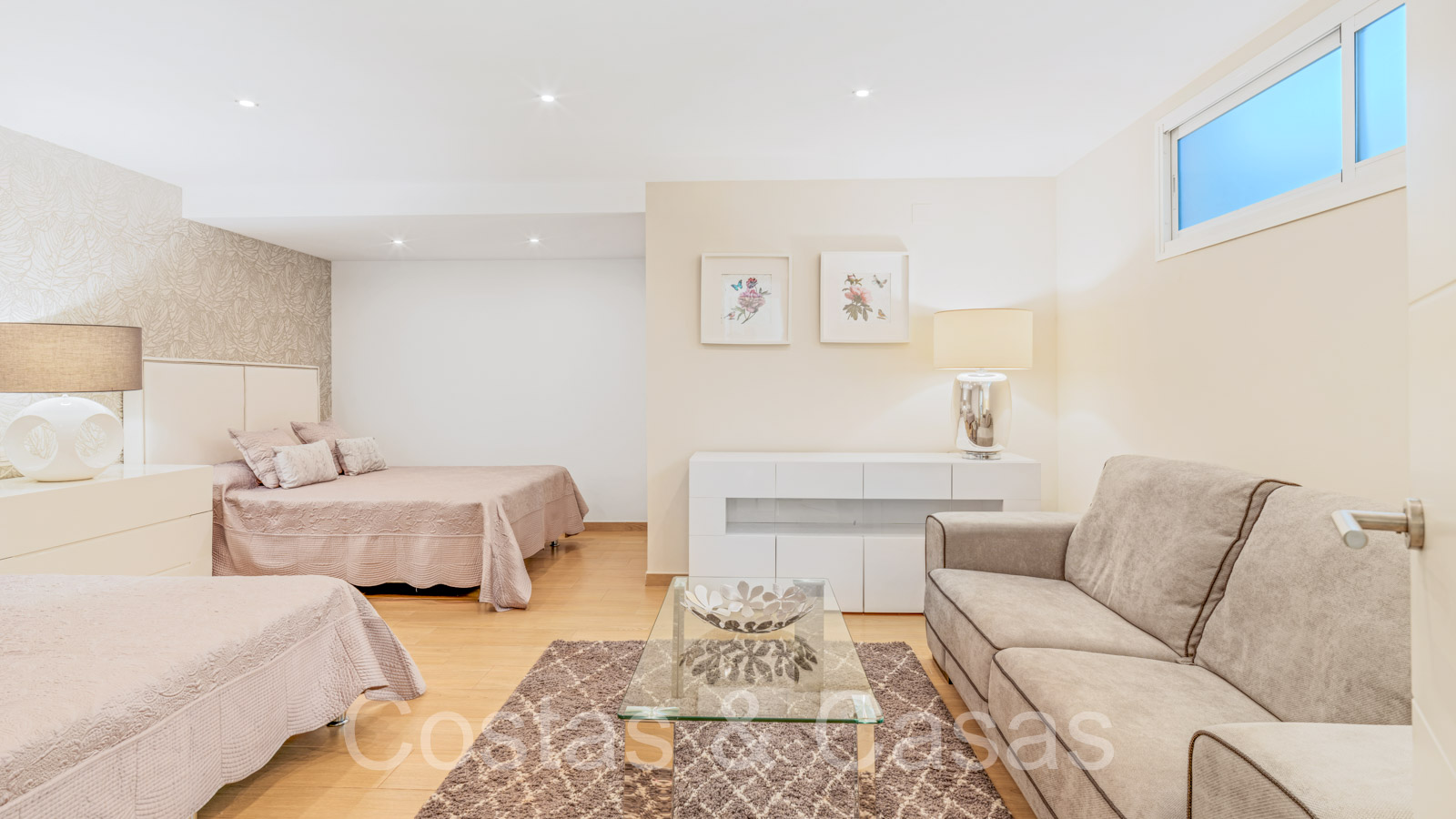 Detached villa with traditional Spanish architectural style. Finished with high-quality materials. Large windows provide a very bright interior. Large open plan living space with TV lounge and integrated dining area. Fully equipped kitchen with modern appliances and a cooking island where you can sit. 5 bedrooms, 5 bathrooms and 2 separate toilets. Marble floors. On the lower floor there is a room furnished as a guesthouse with its own kitchenette. Indoor garage for 2 cars.