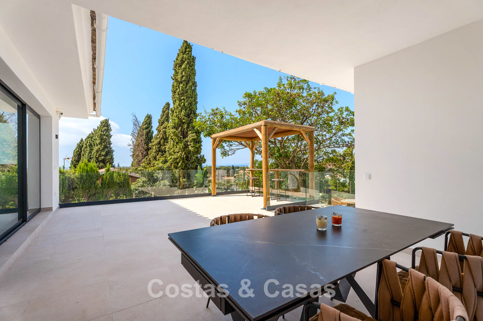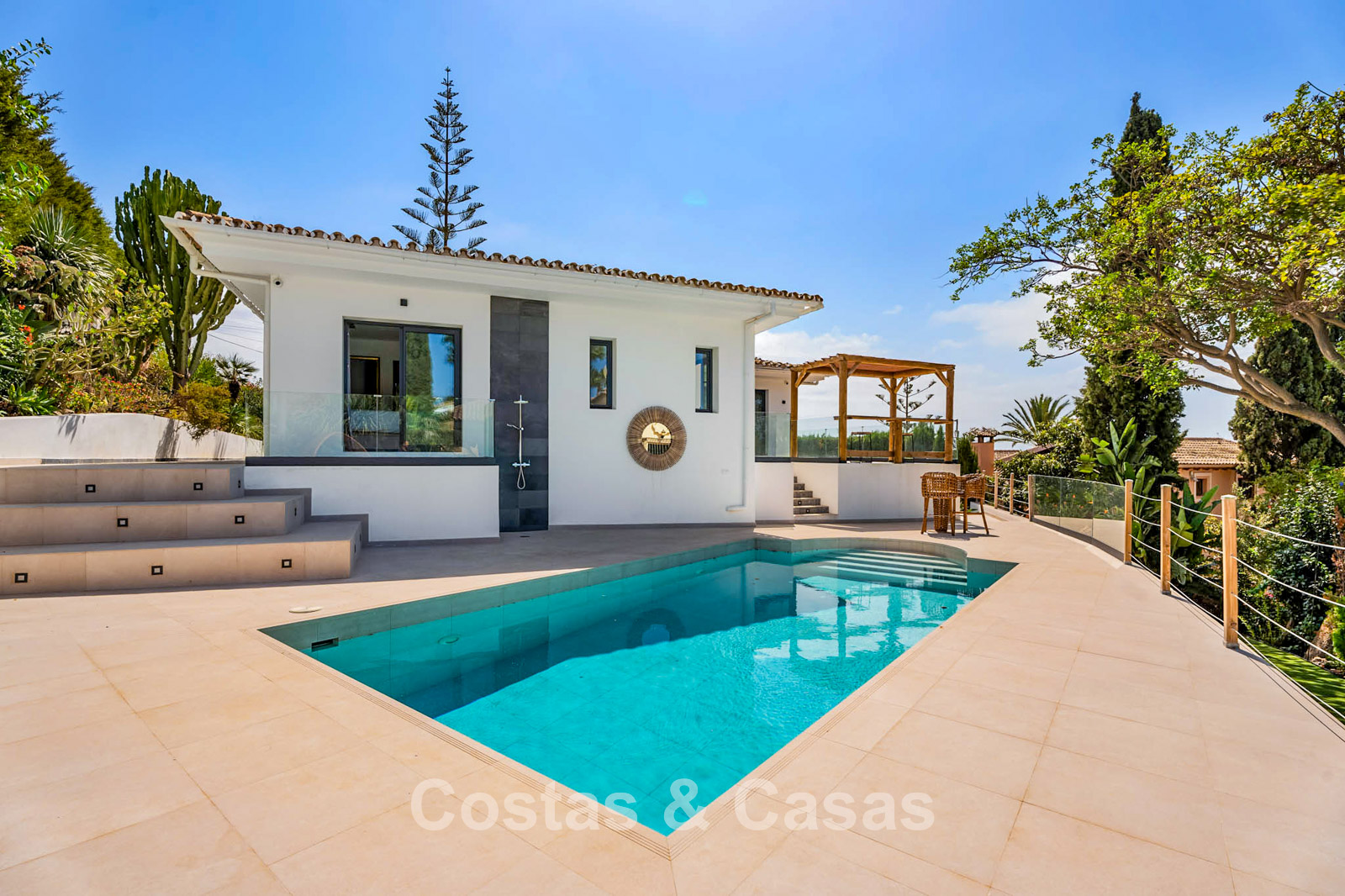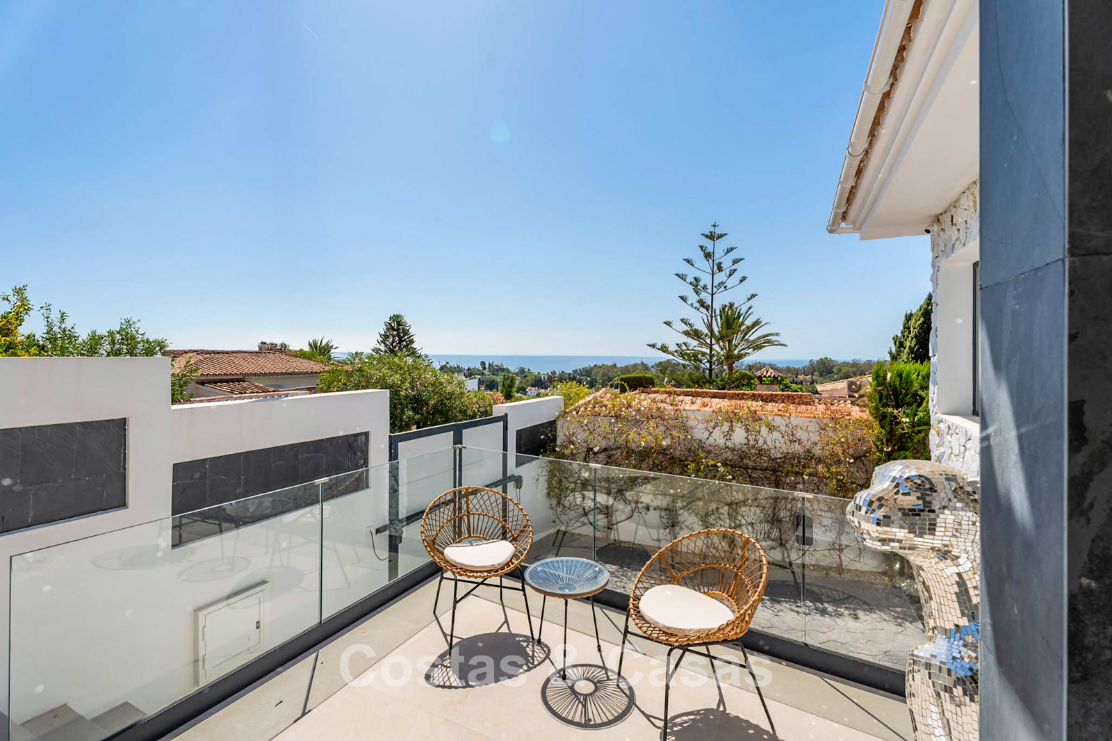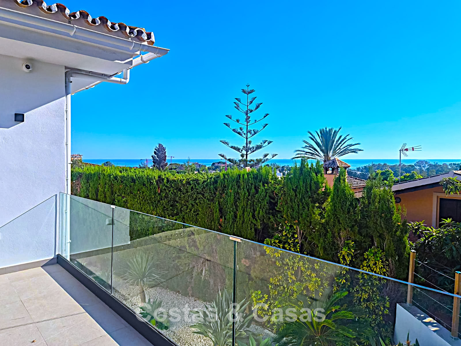 Additional features: Air conditioning (cooling and heating) Underfloor heating throughout Modern fireplace Designer fitted wardrobes Double glazing Electric shutters Glass balustrades for optimal views Alarm system and video intercom Automatic irrigation system Outdoor shower Solar panels Satellite TV
