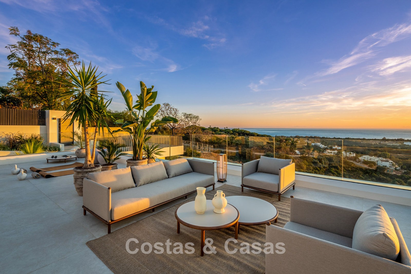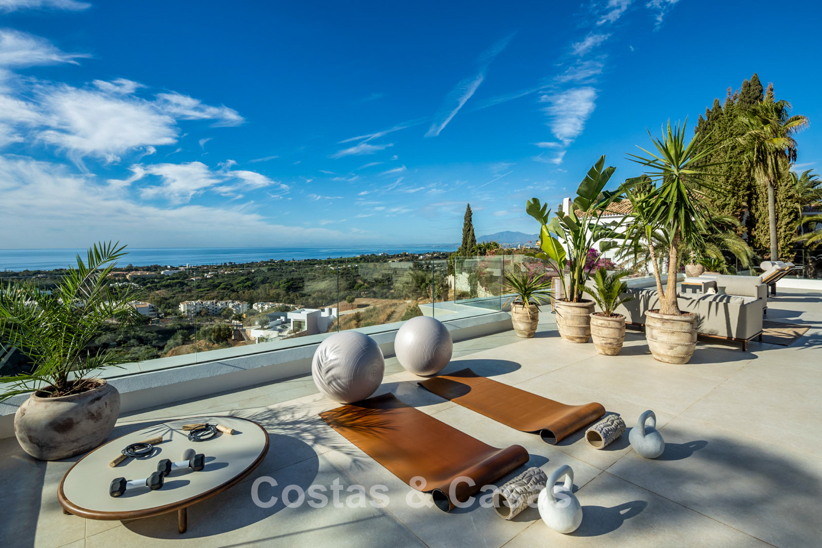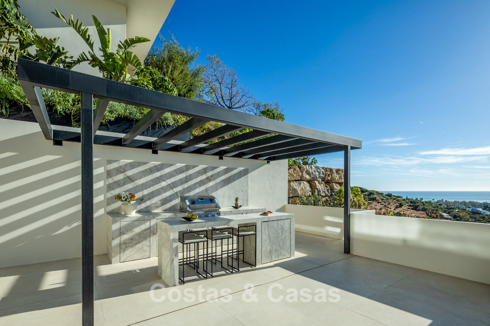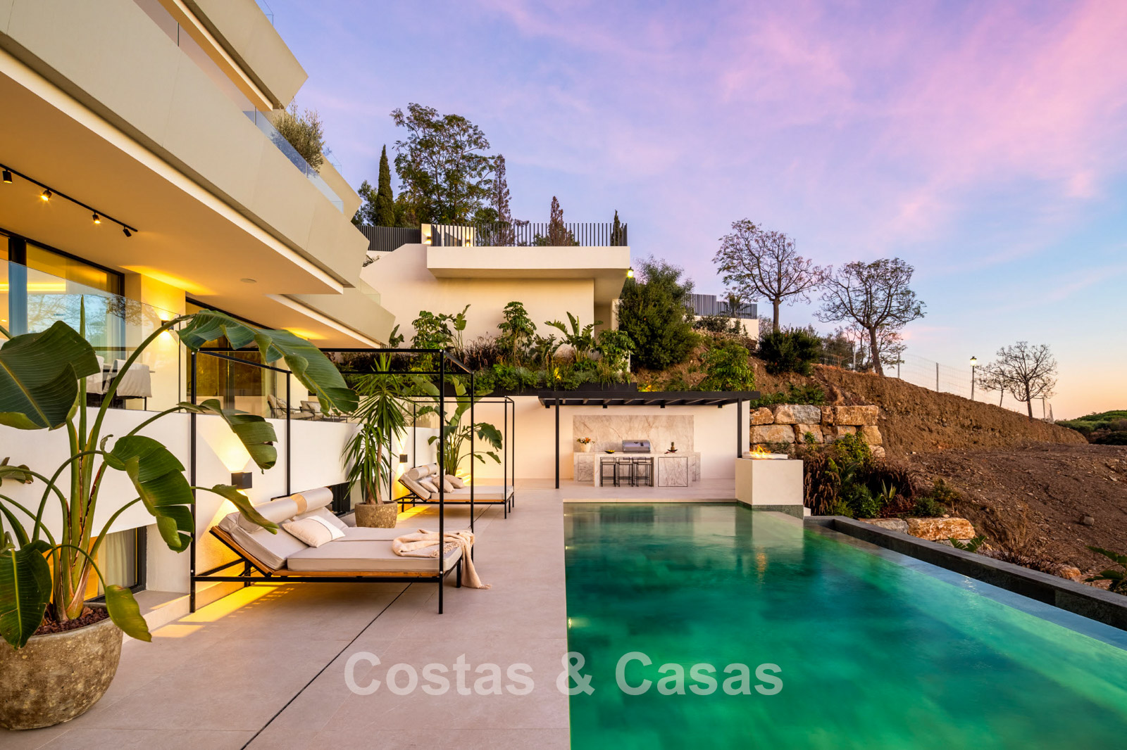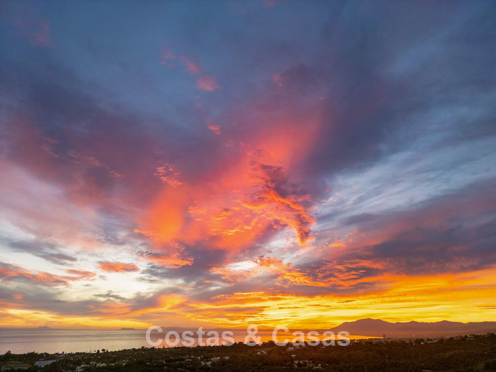 Fully fenced plot. The outdoor area also features expansive terraces, an outdoor kitchen with barbecue area, and a built-in infinity pool. The spacious roof terrace is equipped with a built-in jacuzzi and various lounge areas. South-facing. Impressive panoramic views of the Mediterranean Sea towards the Strait of Gibraltar.