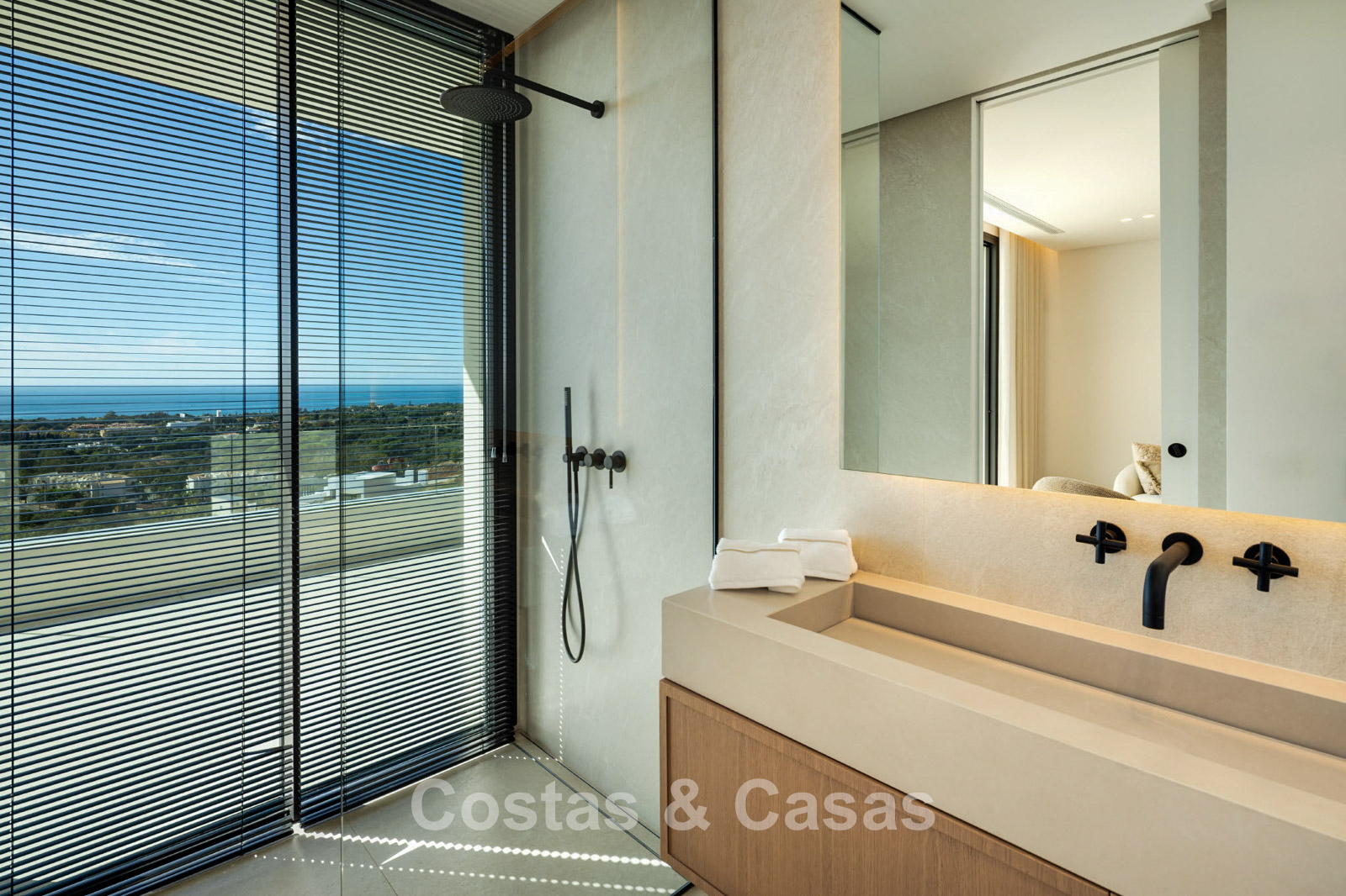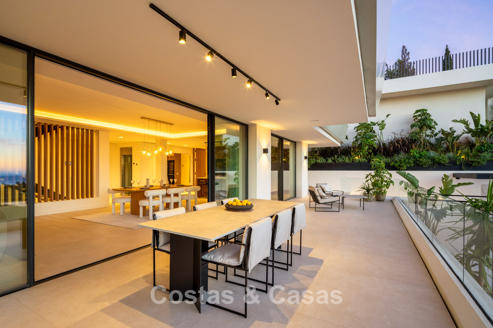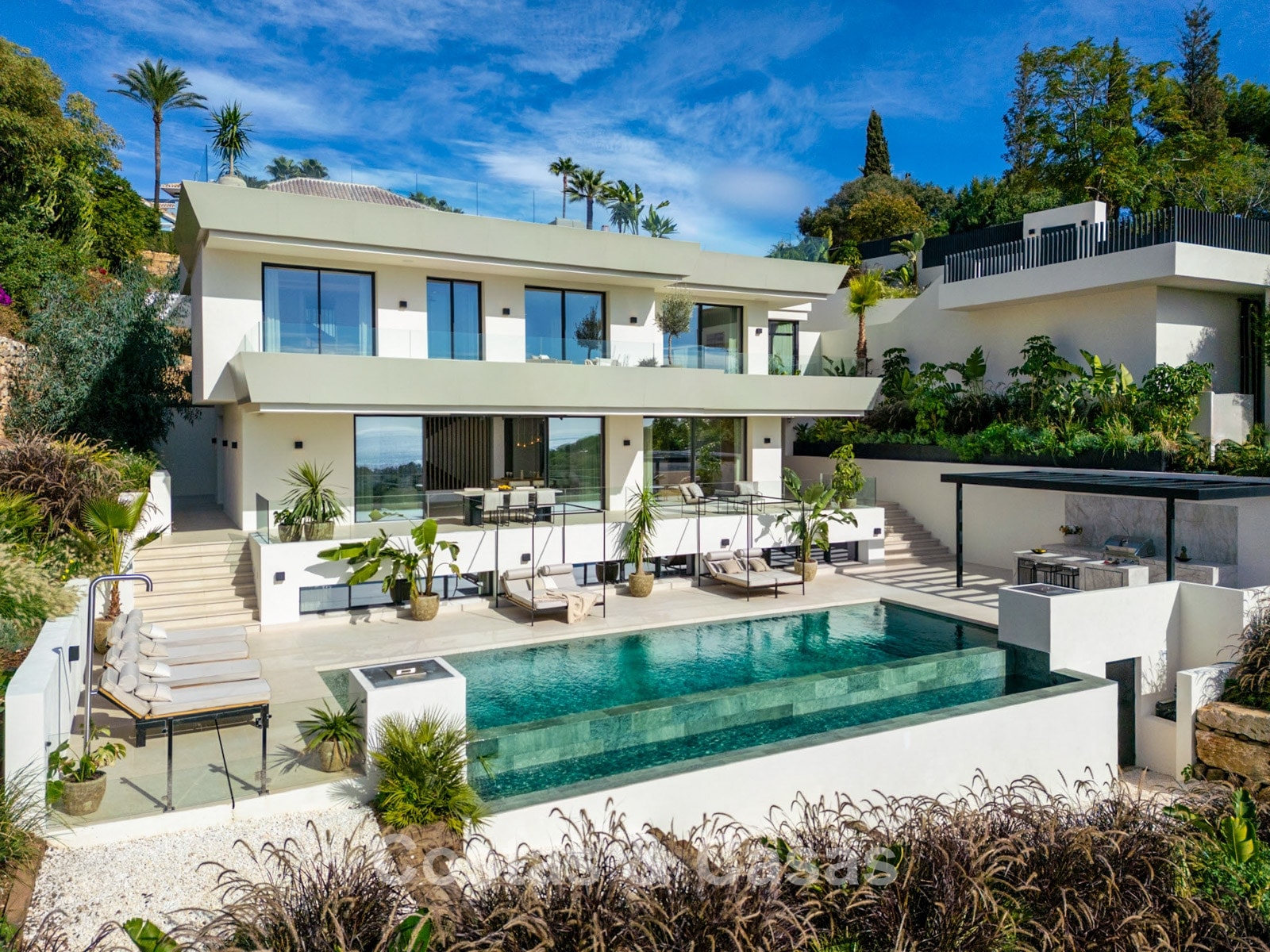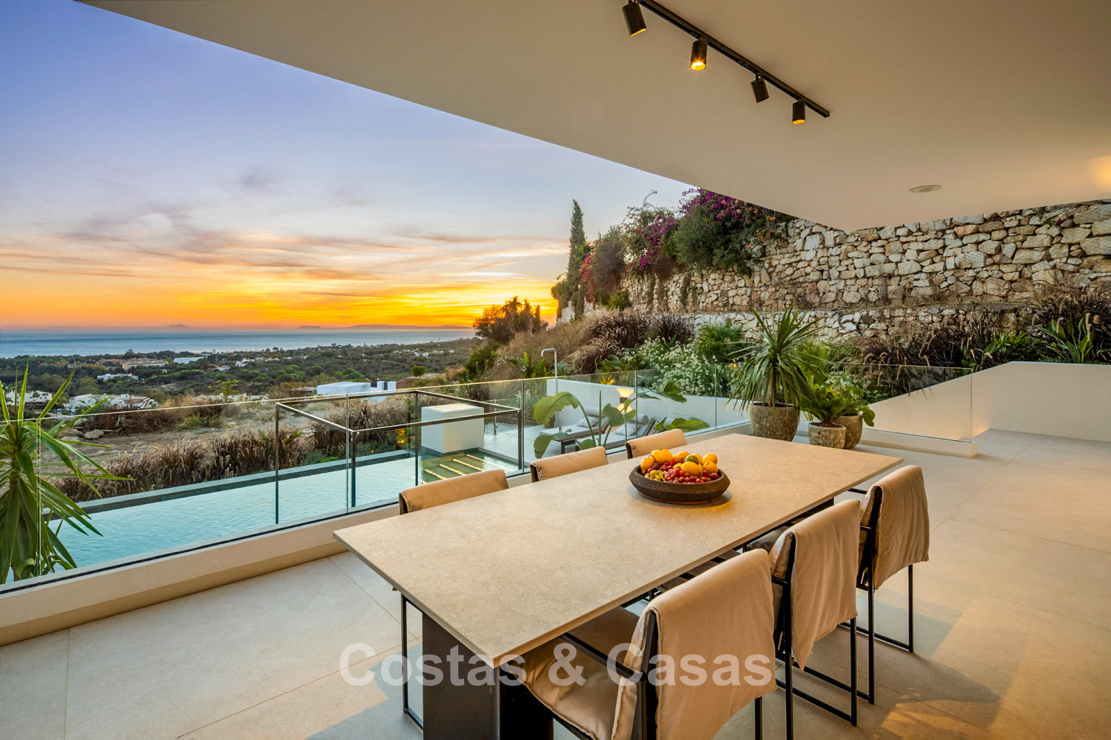 Fully fenced plot. The outdoor area also features expansive terraces, an outdoor kitchen with barbecue area, and a built-in infinity pool. The spacious roof terrace is equipped with a built-in jacuzzi and various lounge areas. South-facing. Impressive panoramic views of the Mediterranean Sea towards the Strait of Gibraltar.