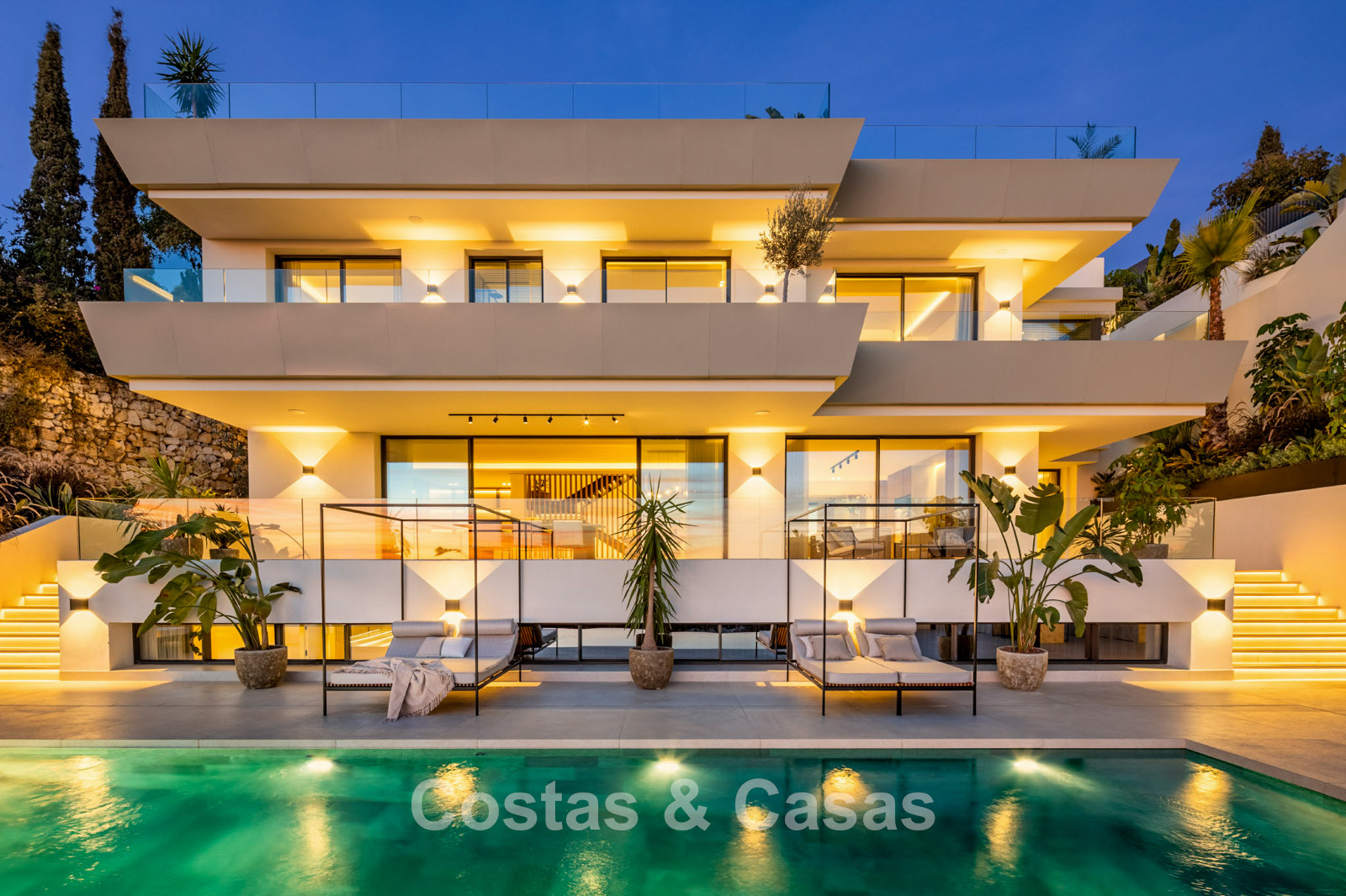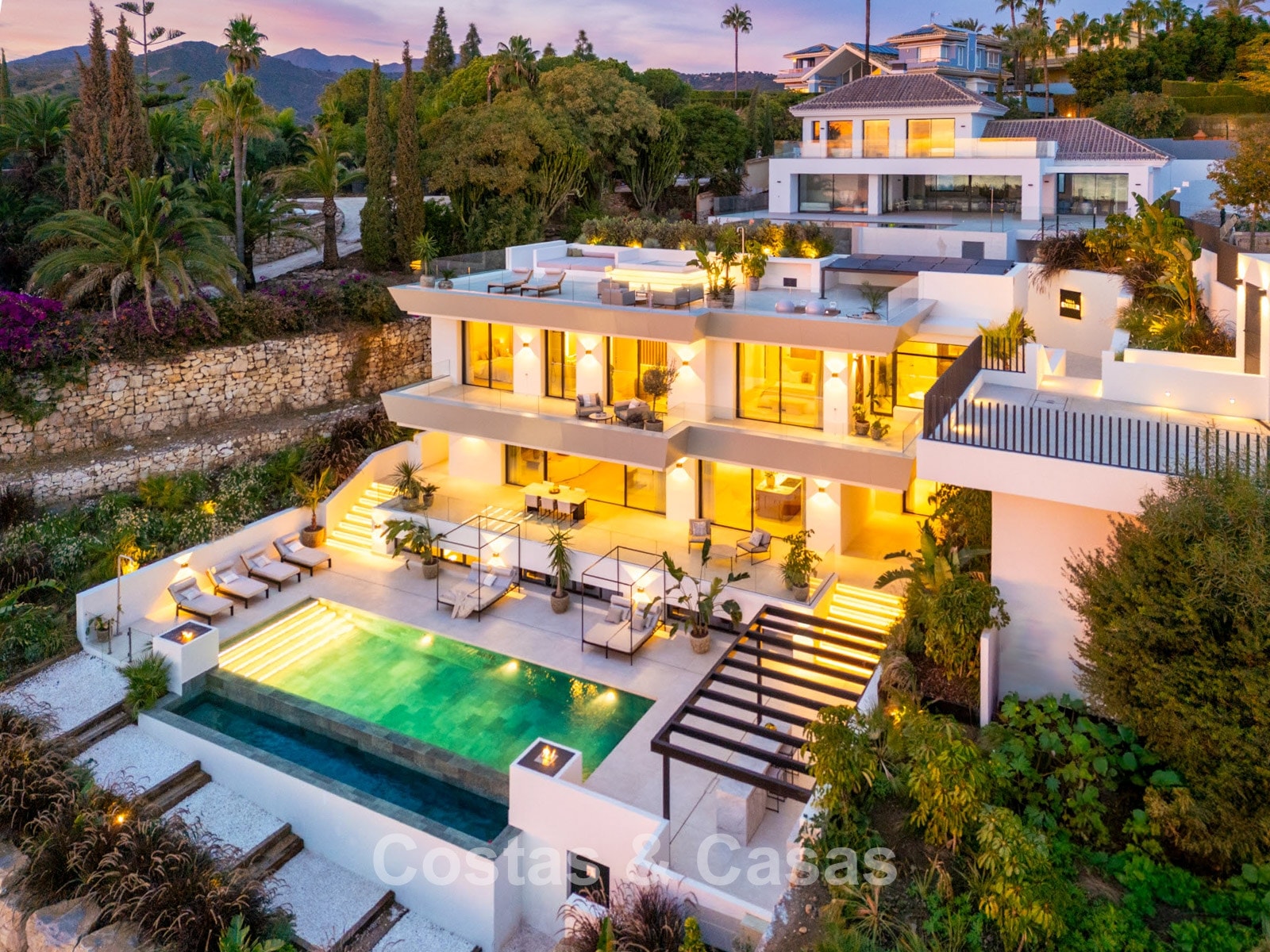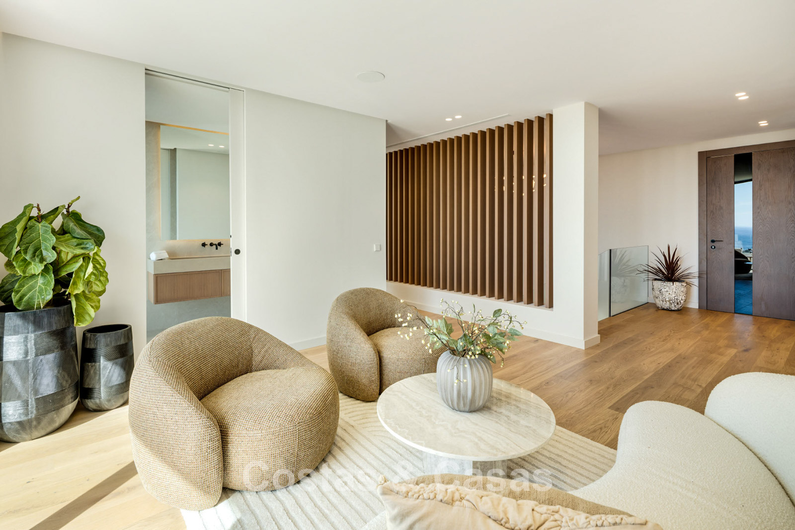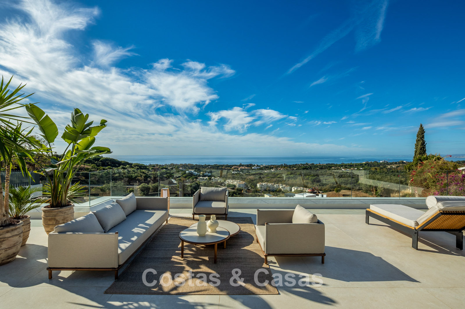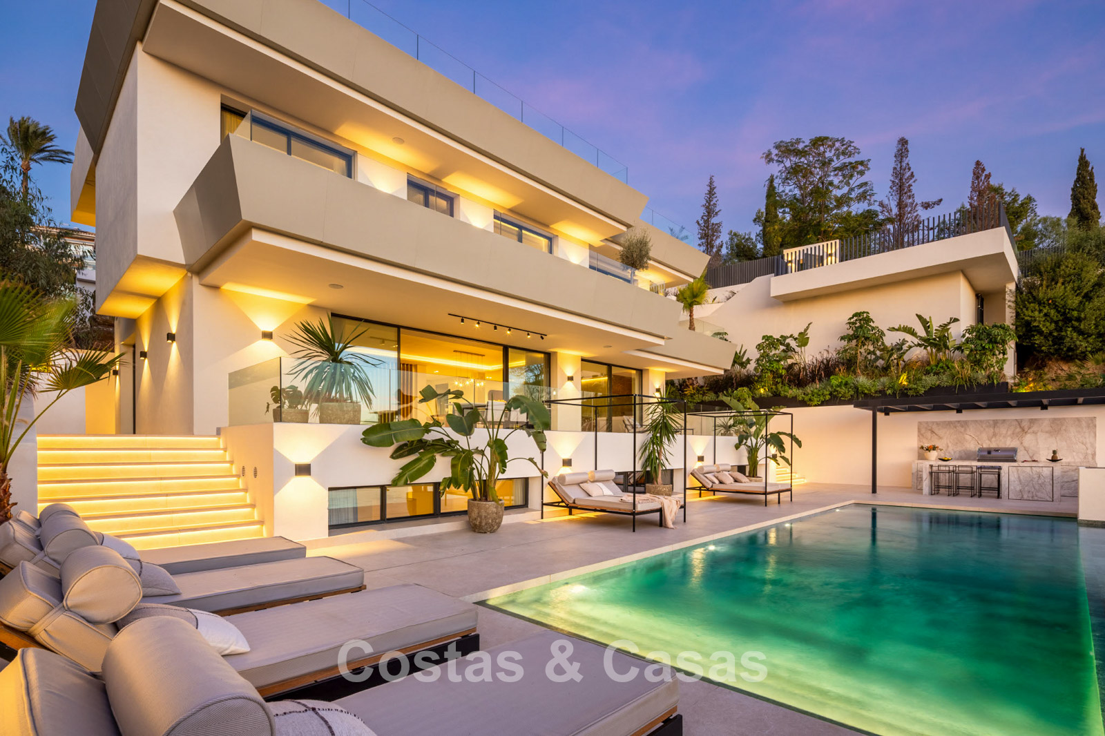 Fully fenced plot. The outdoor area also features expansive terraces, an outdoor kitchen with barbecue area, and a built-in infinity pool. The spacious roof terrace is equipped with a built-in jacuzzi and various lounge areas. South-facing. Impressive panoramic views of the Mediterranean Sea towards the Strait of Gibraltar.