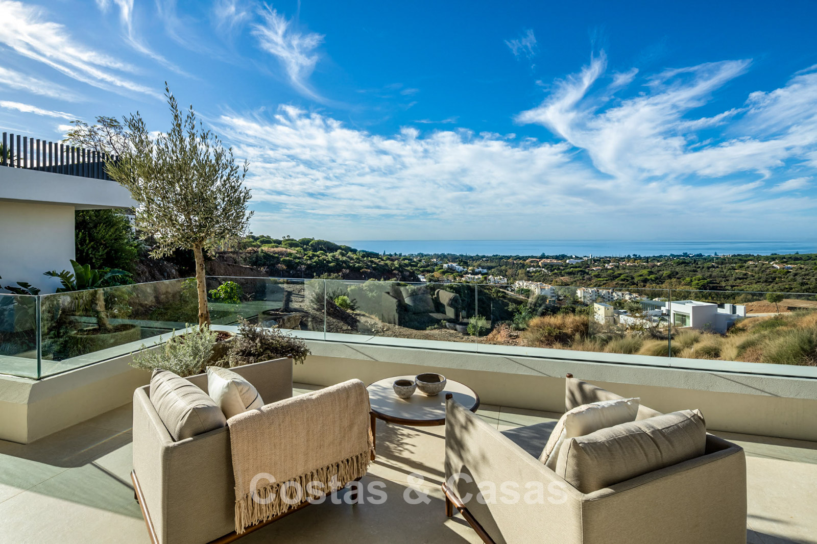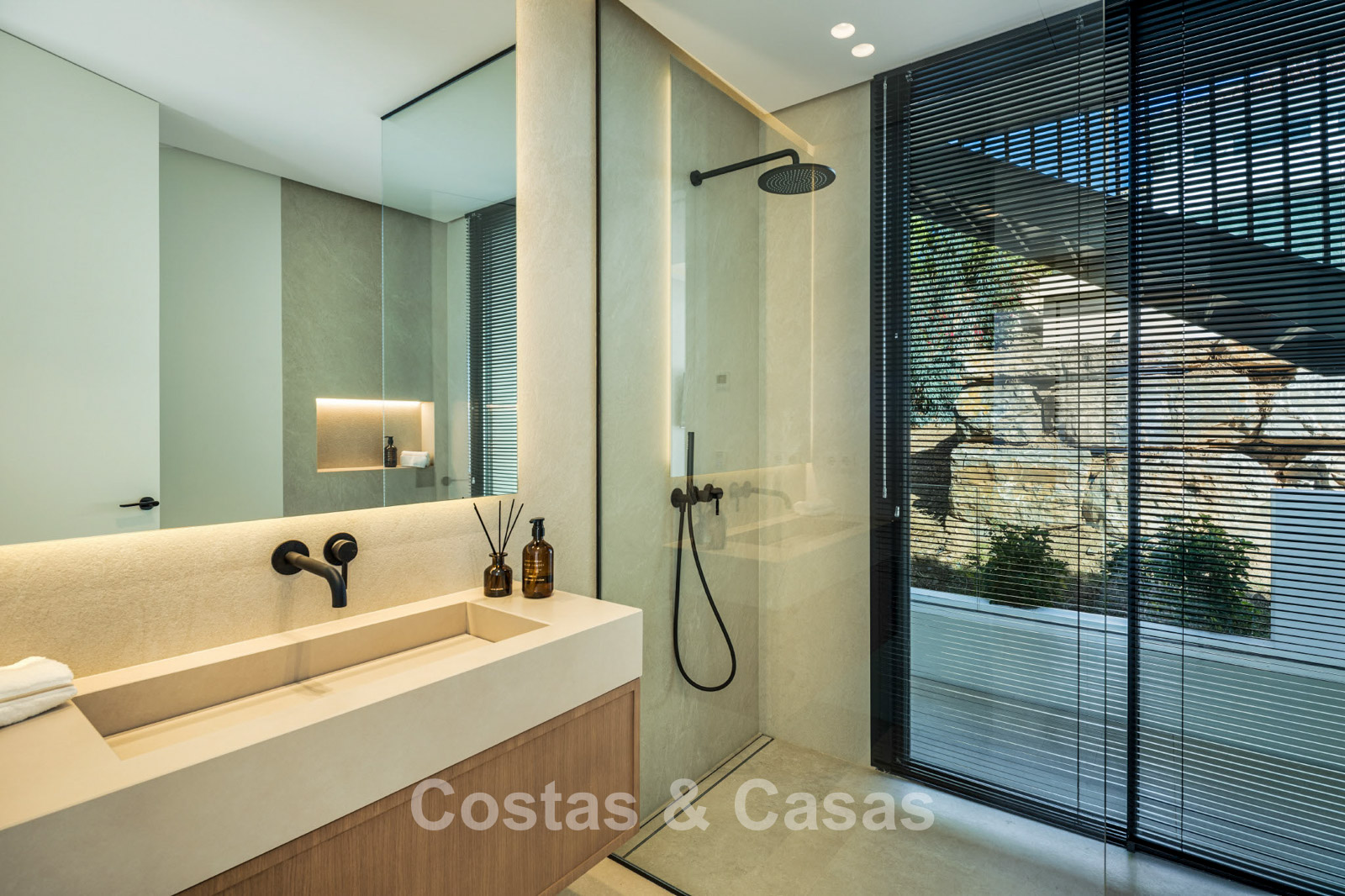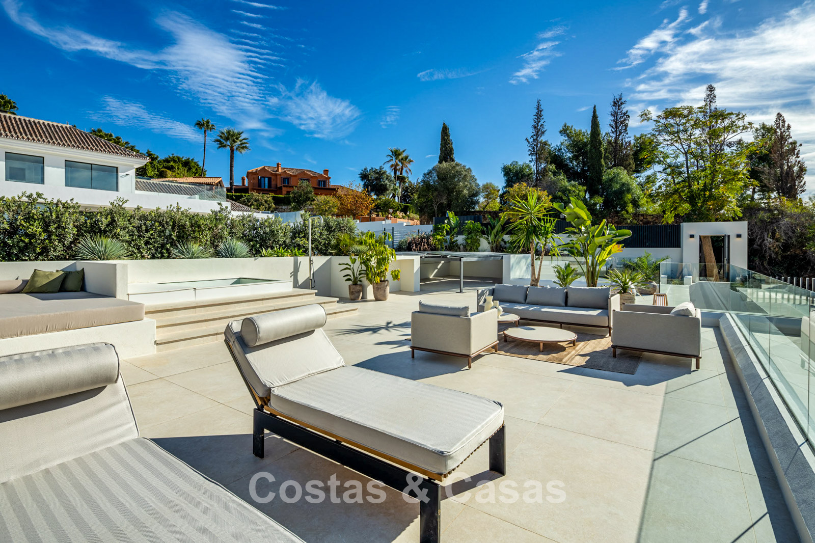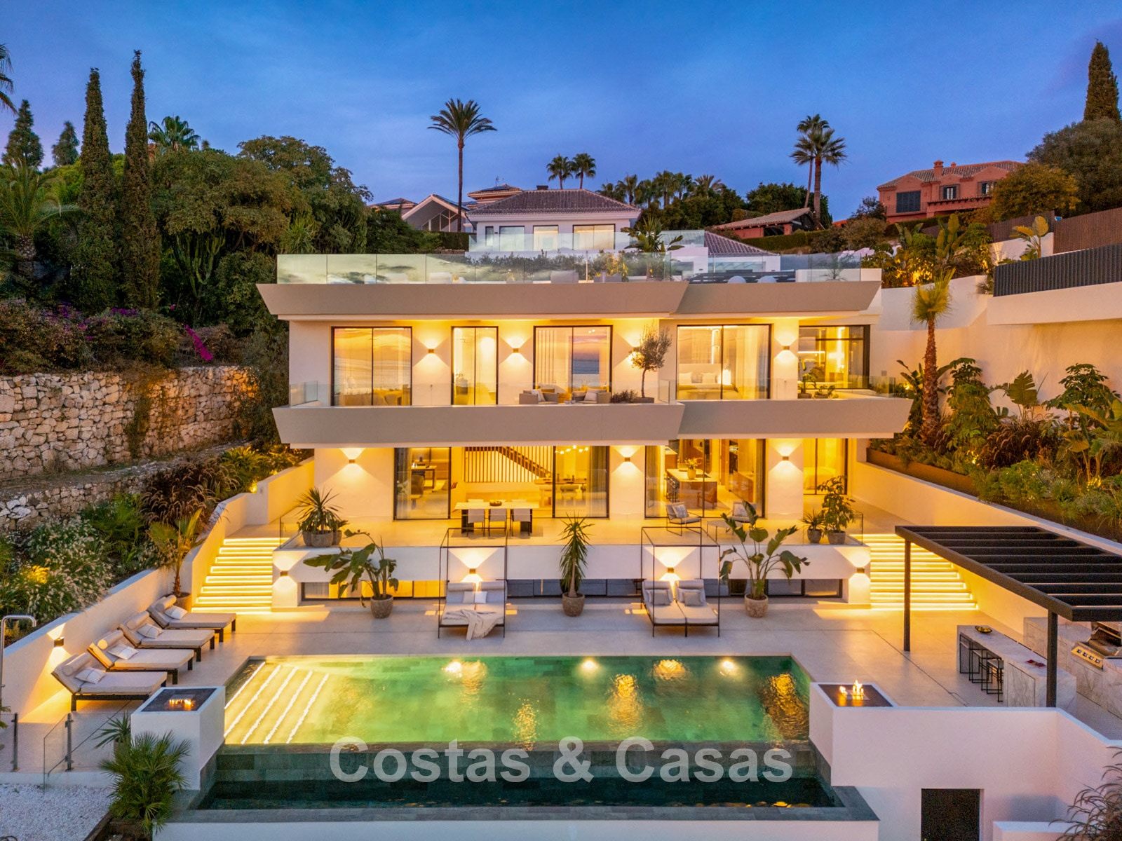Fully fenced plot. The outdoor area also features expansive terraces, an outdoor kitchen with barbecue area, and a built-in infinity pool. The spacious roof terrace is equipped with a built-in jacuzzi and various lounge areas. South-facing. Impressive panoramic views of the Mediterranean Sea towards the Strait of Gibraltar.