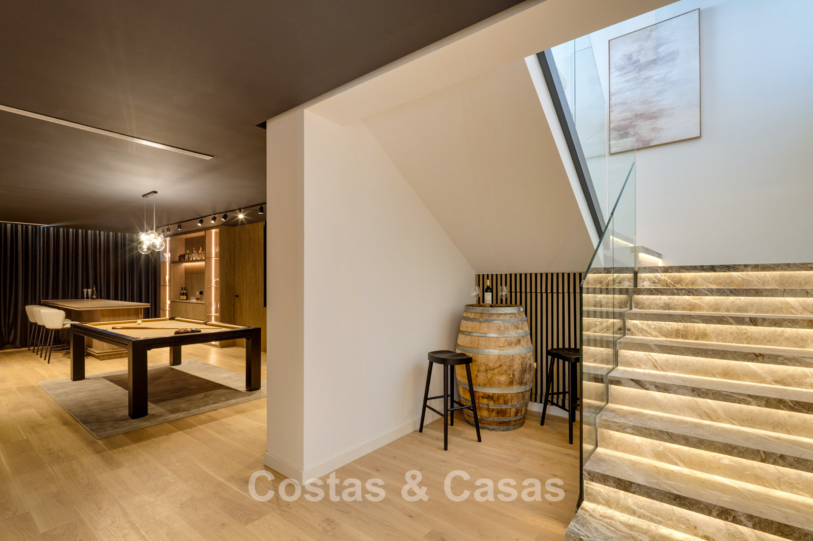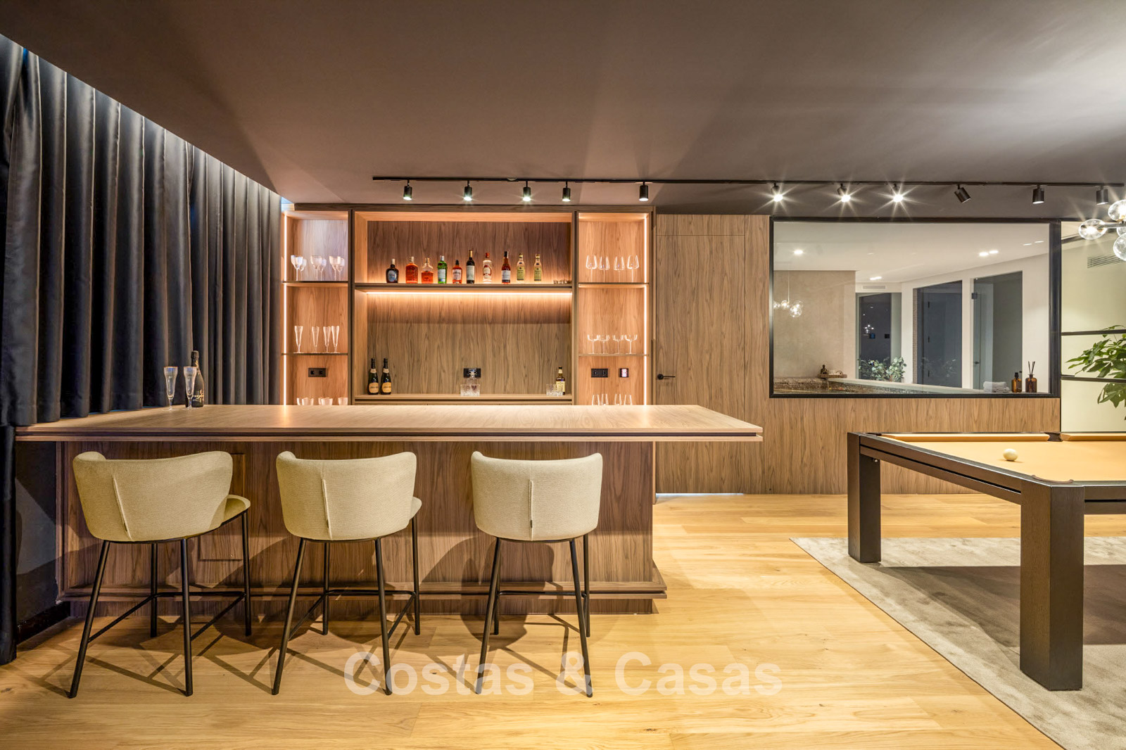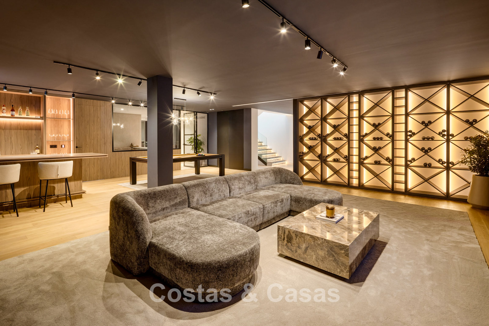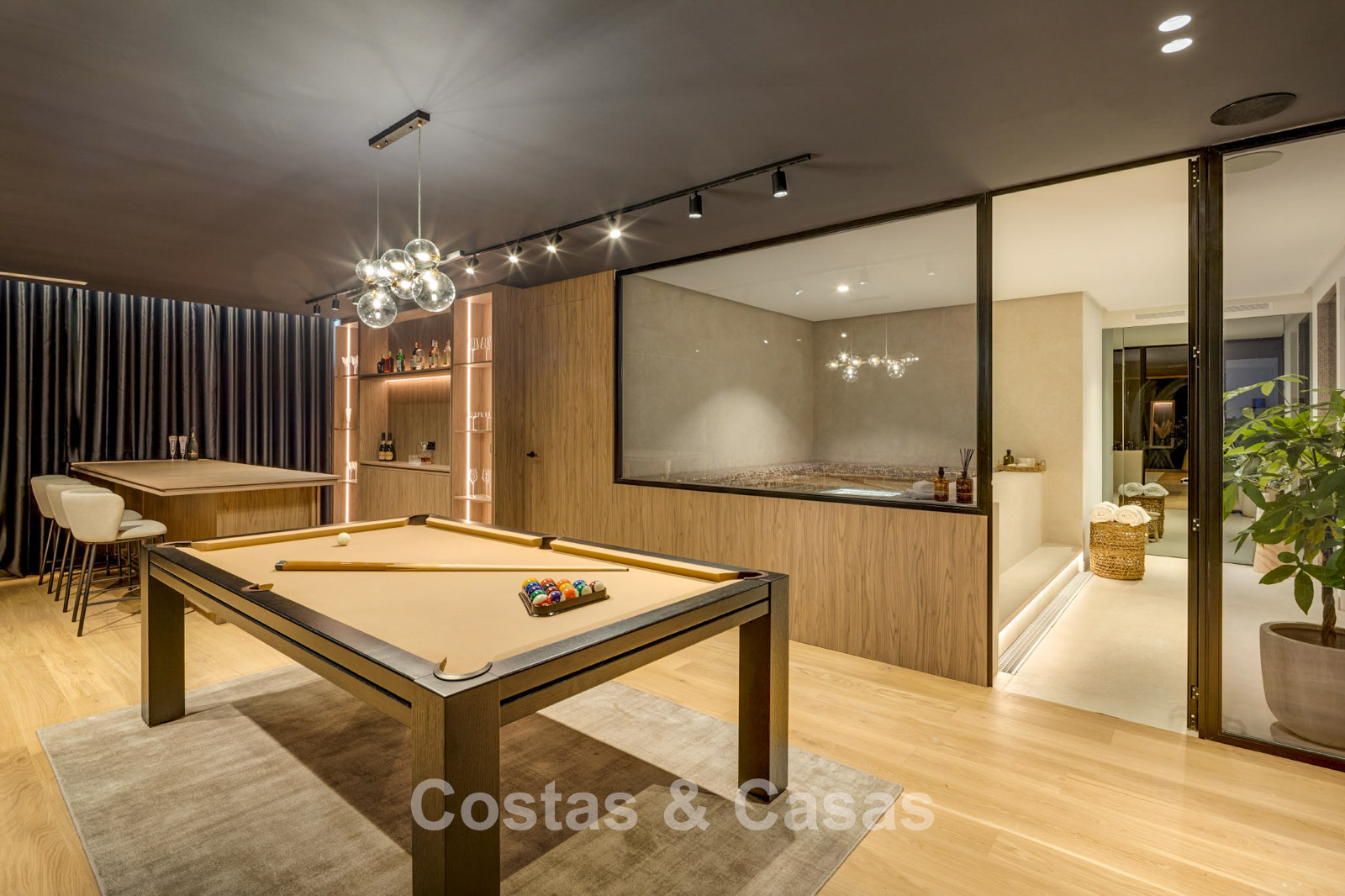 Detached villa with high-end luxury architecture. Using high-quality materials and high-quality brands including Siemens and Gaggenau. The open plan layout and large windows enhance the sense of space and seamlessly connect the interior with the surrounding terraces. Bright, central living room with a living area and integrated dining area. Practically designed kitchen/diner with a minimalist design and fully equipped with top-of-the-line appliances and a seating island. A second "dirty kitchen" with an adjoining fully equipped laundry room. A private home office. 5 bedrooms, 6 bathrooms, and a guest toilet. On the lower floor, you'll find an exclusive entertainment area with a chic home cinema, a statement wine wall, a stylish pool table, and an elegant bar perfect for cozy evenings. Adjacent is a spa area with a jacuzzi, hammam, and private bathroom. Utility room/storage room. Oak floors and large, high-quality porcelain floors. Private parking for 2 cars.